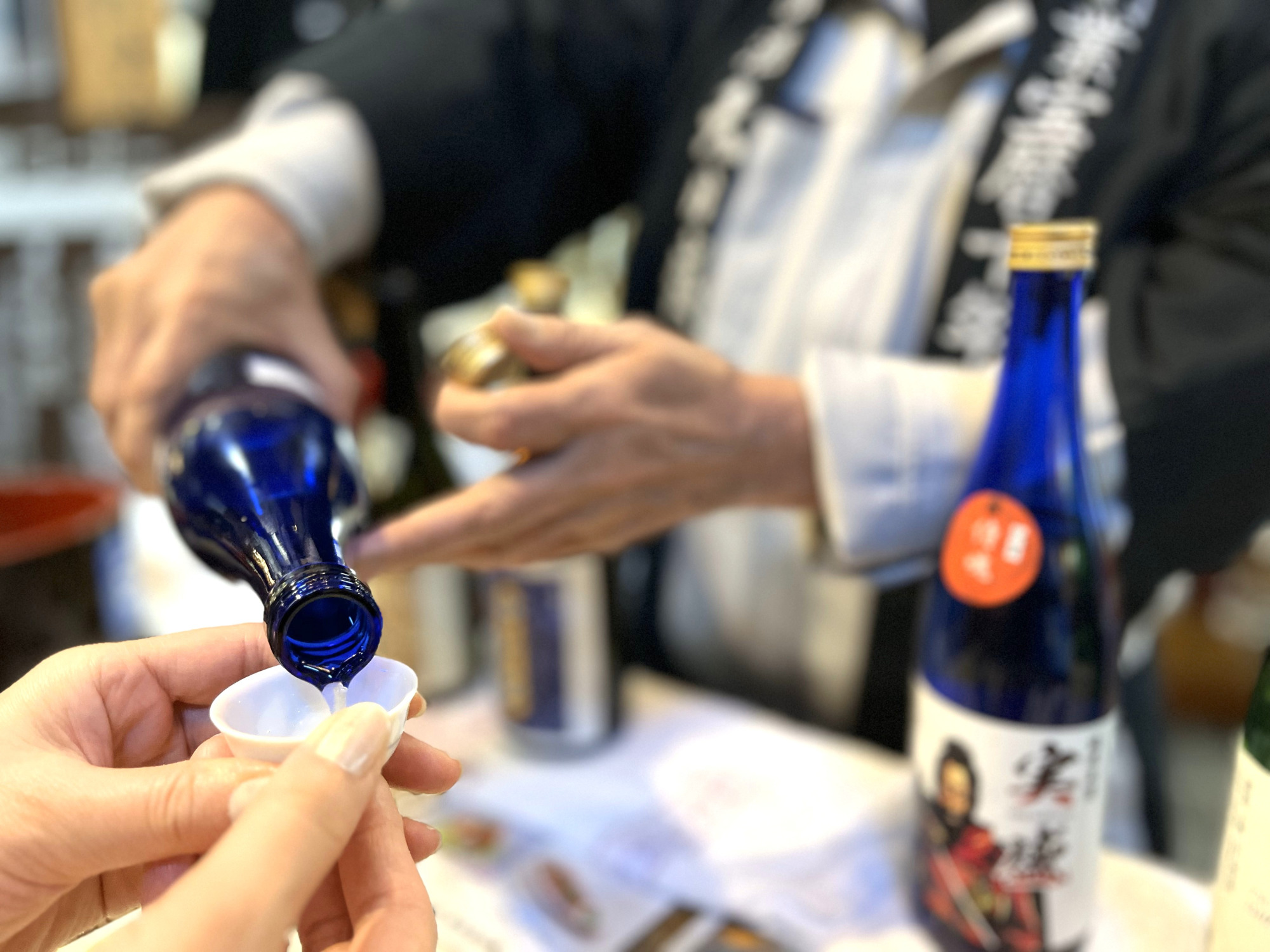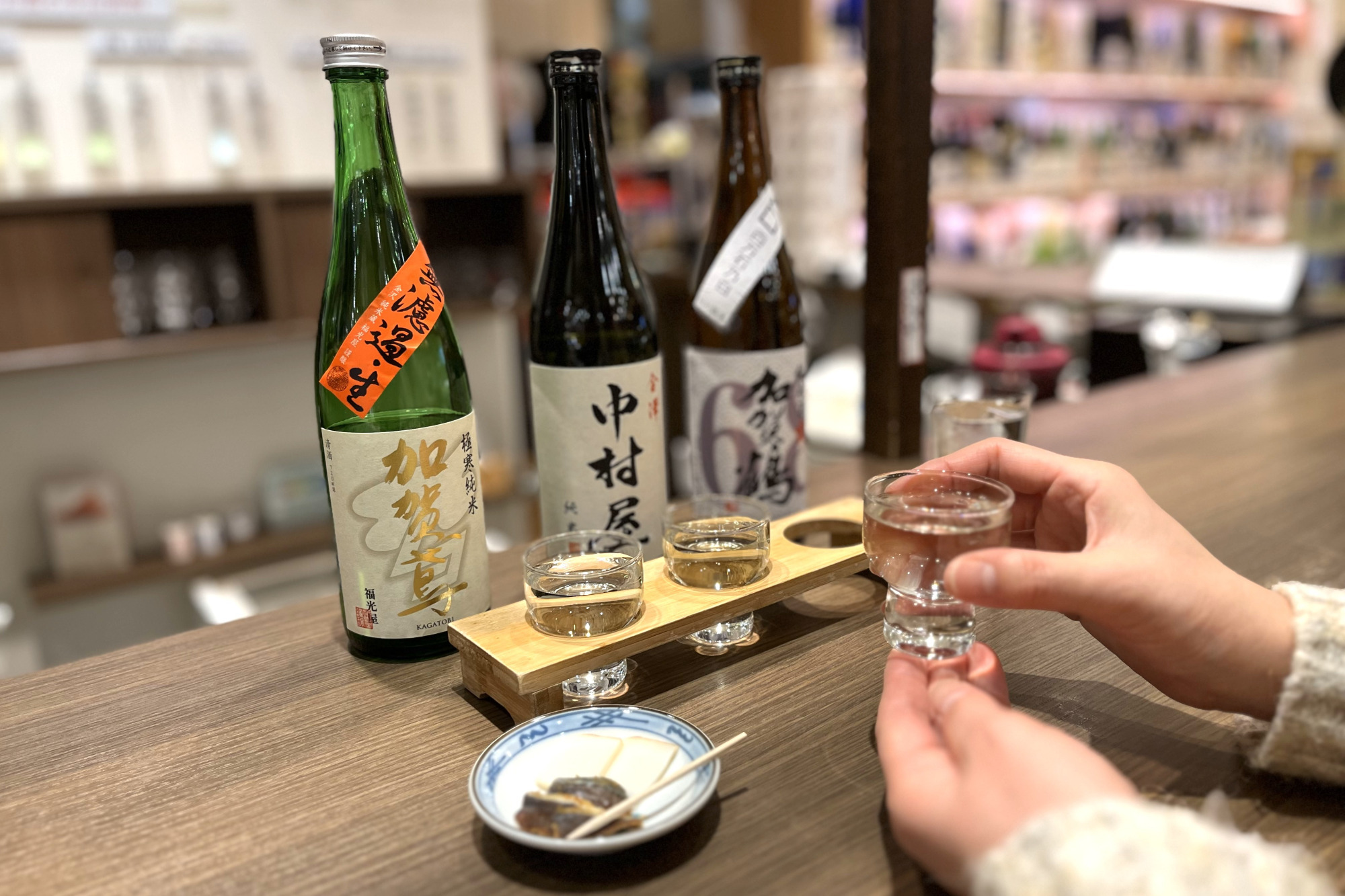 店内には、試飲を楽しむための地酒バーが併設されており、特に「唎酒セット」が好評です。購入を決める前に、実際に飲み比べができるので、お酒選びが一層楽しくなります。おつまみもついており、スタッフの方が丁寧に各酒の特徴や製法について説明してくれるので、知識を深めながら楽しめます。