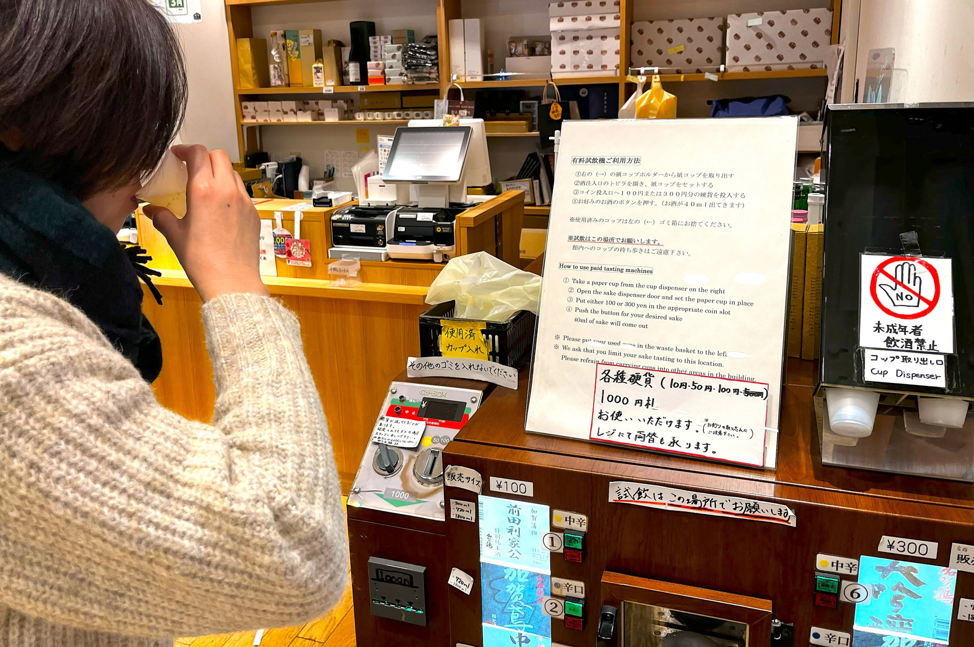 もしおつまみなしで、純粋にお酒を飲み比べたいという方にも嬉しいサービスがあります。店内には自動販売機が設置されており、1杯100円からさまざまな日本酒を試すことができます。少しずつ、いろいろな種類を味わいながら、自分のお気に入りを見つけることができますよ。