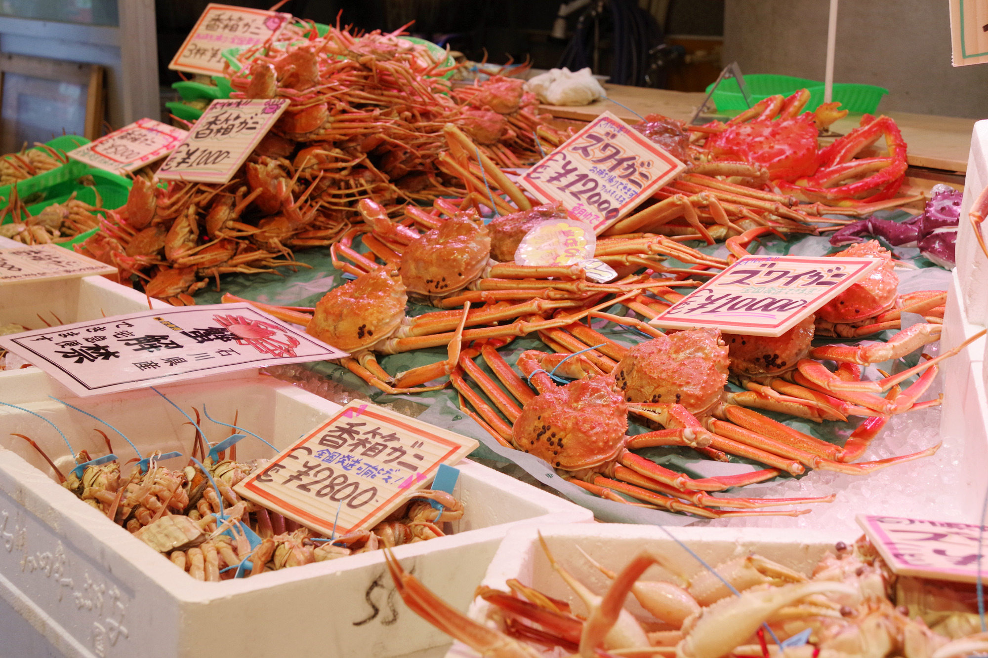 山積みになっている、大きなズワイガニの赤色が圧巻です。