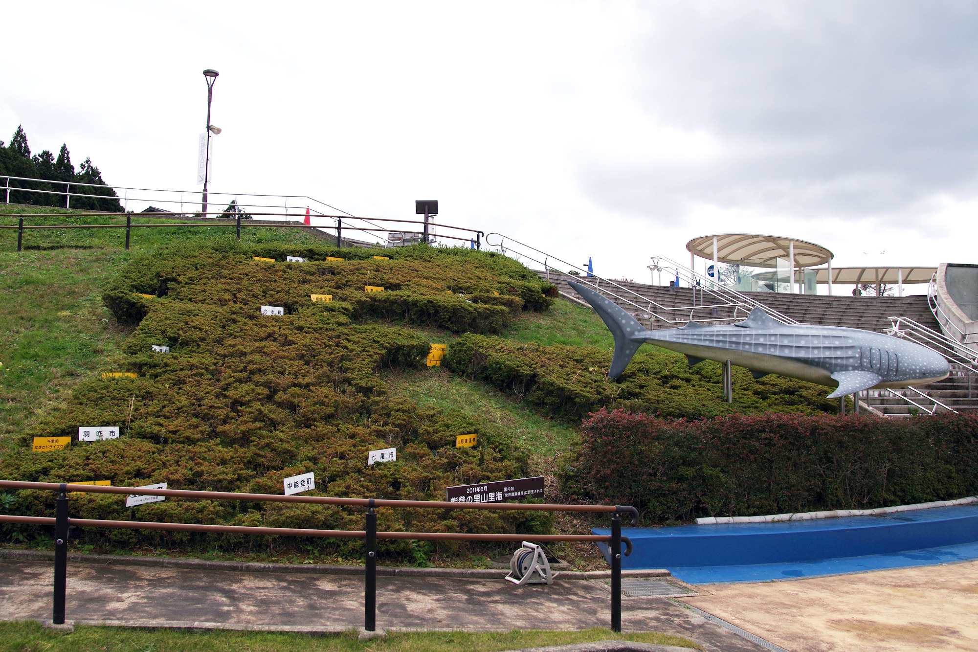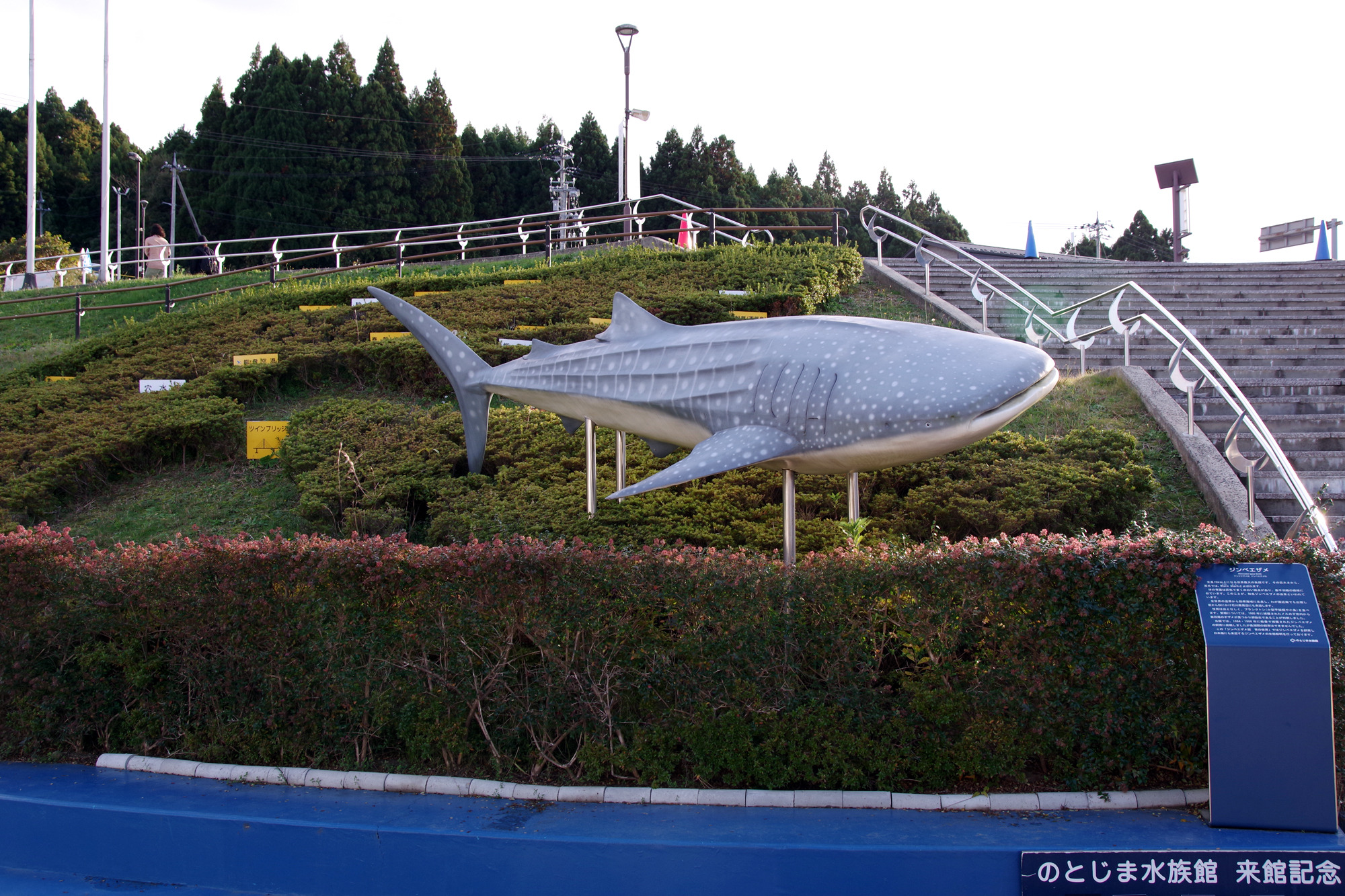 のとじま水族館の入口では、大きなジンベエザメが迎えてくれます。