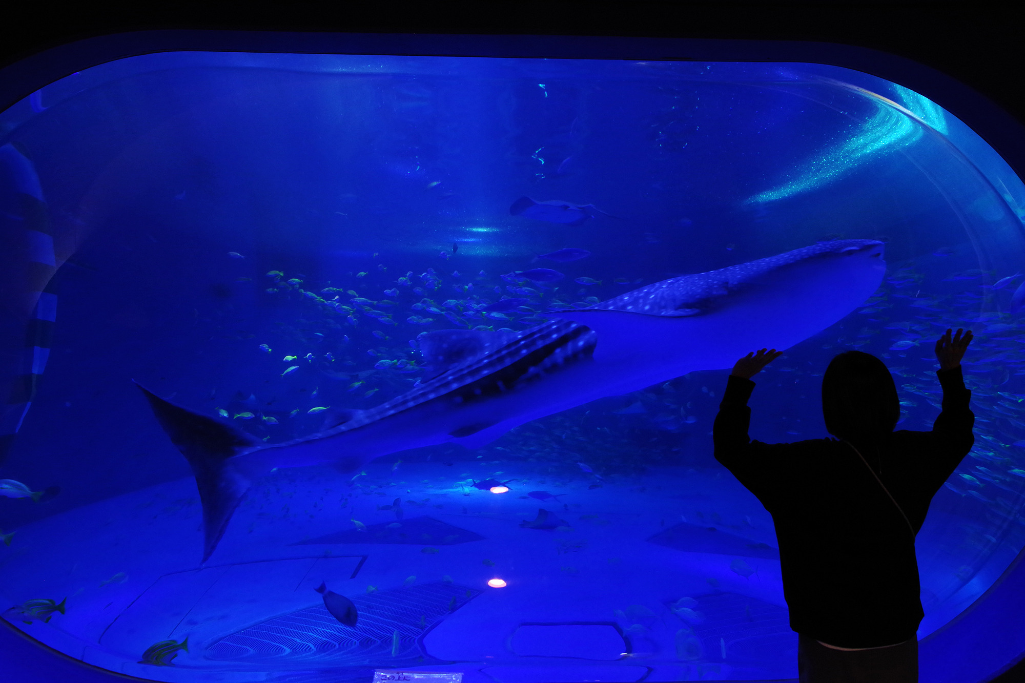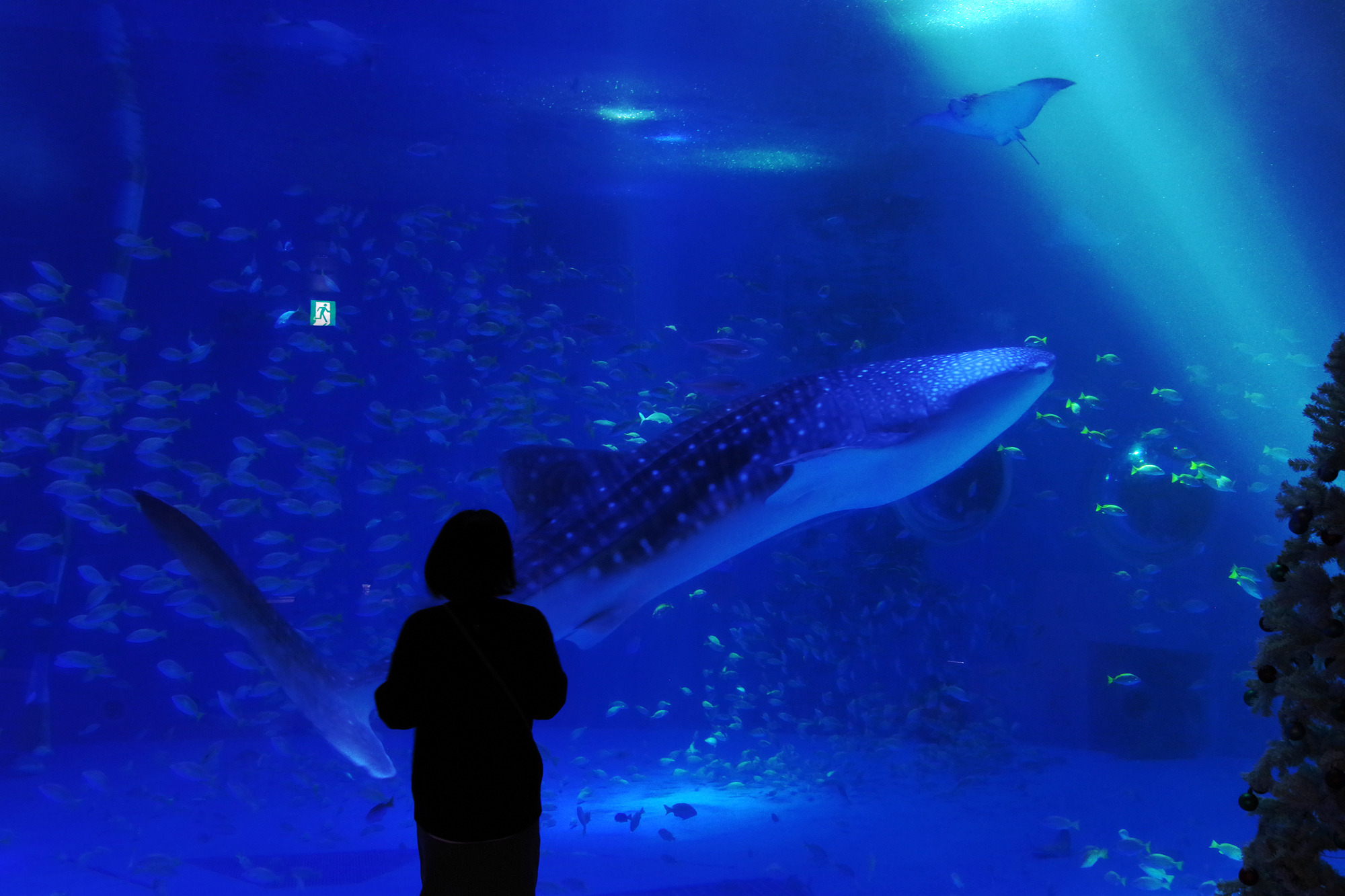 大きな水槽に悠々と魚たちが泳ぎ、見るとジンベエザメがゆっくりとこちらに向かってきました。