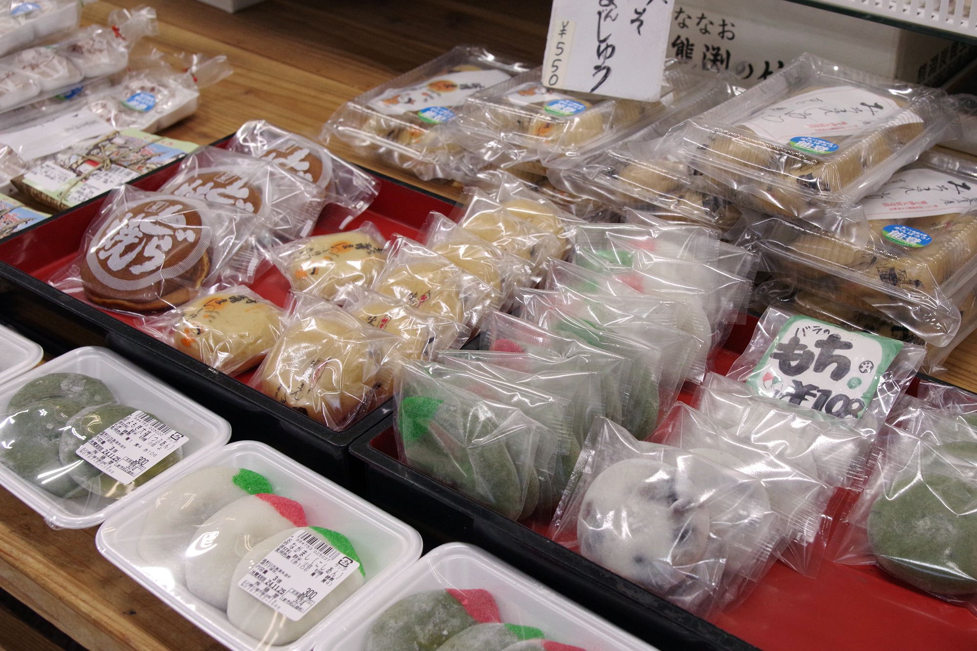 季節商品や、地元の和菓子屋さんが作る味噌まんじゅう、七尾銘菓の「ながまし」、七尾の老舗和菓子店の「あんころ」など、独特の商品ラインナップ。