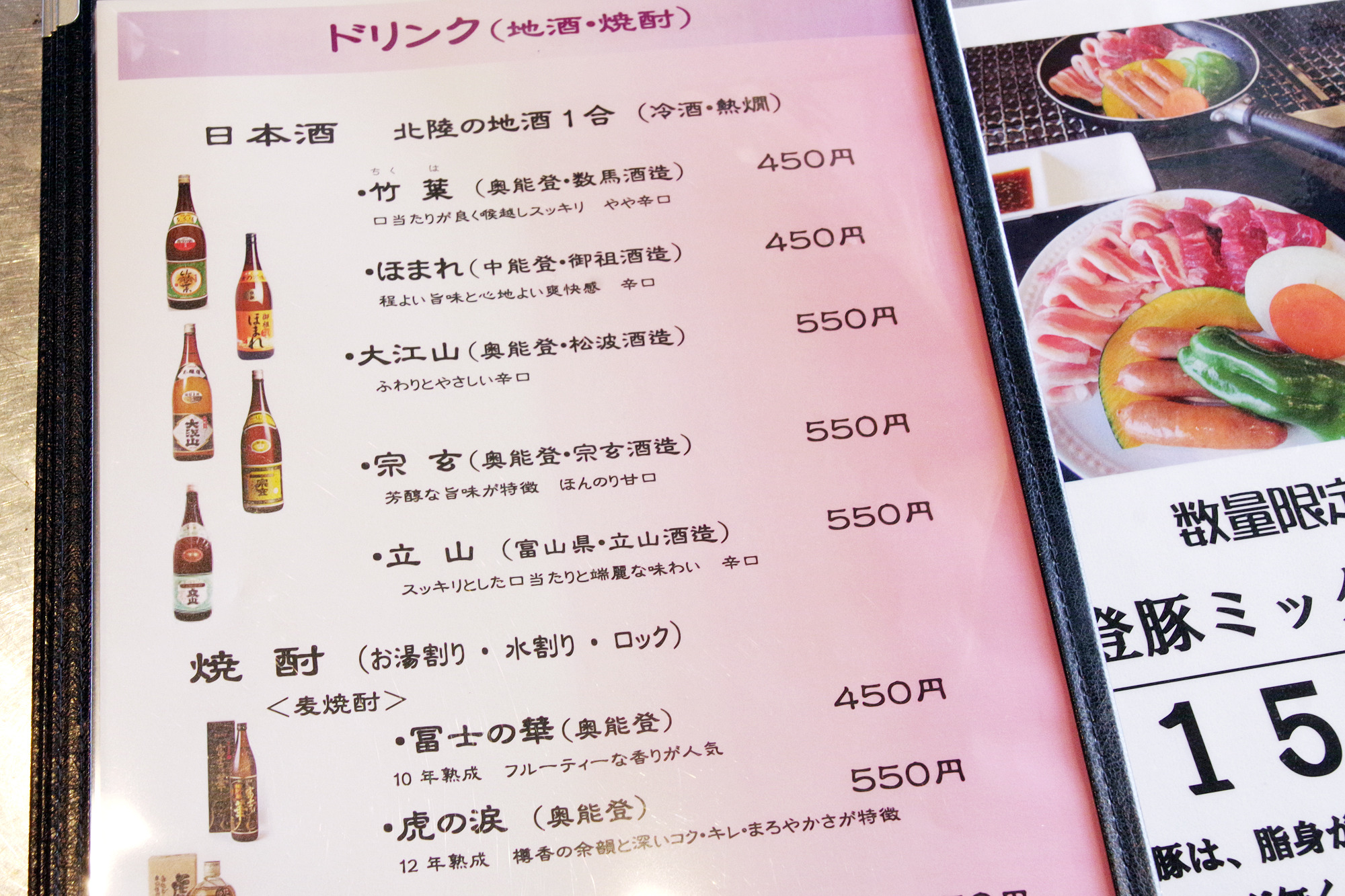驚くのは、海鮮のボリューム種類だけでなく地酒の充実ぶり。能登の各地域の地酒がそろっていて、飲み比べも楽しみのひとつです。