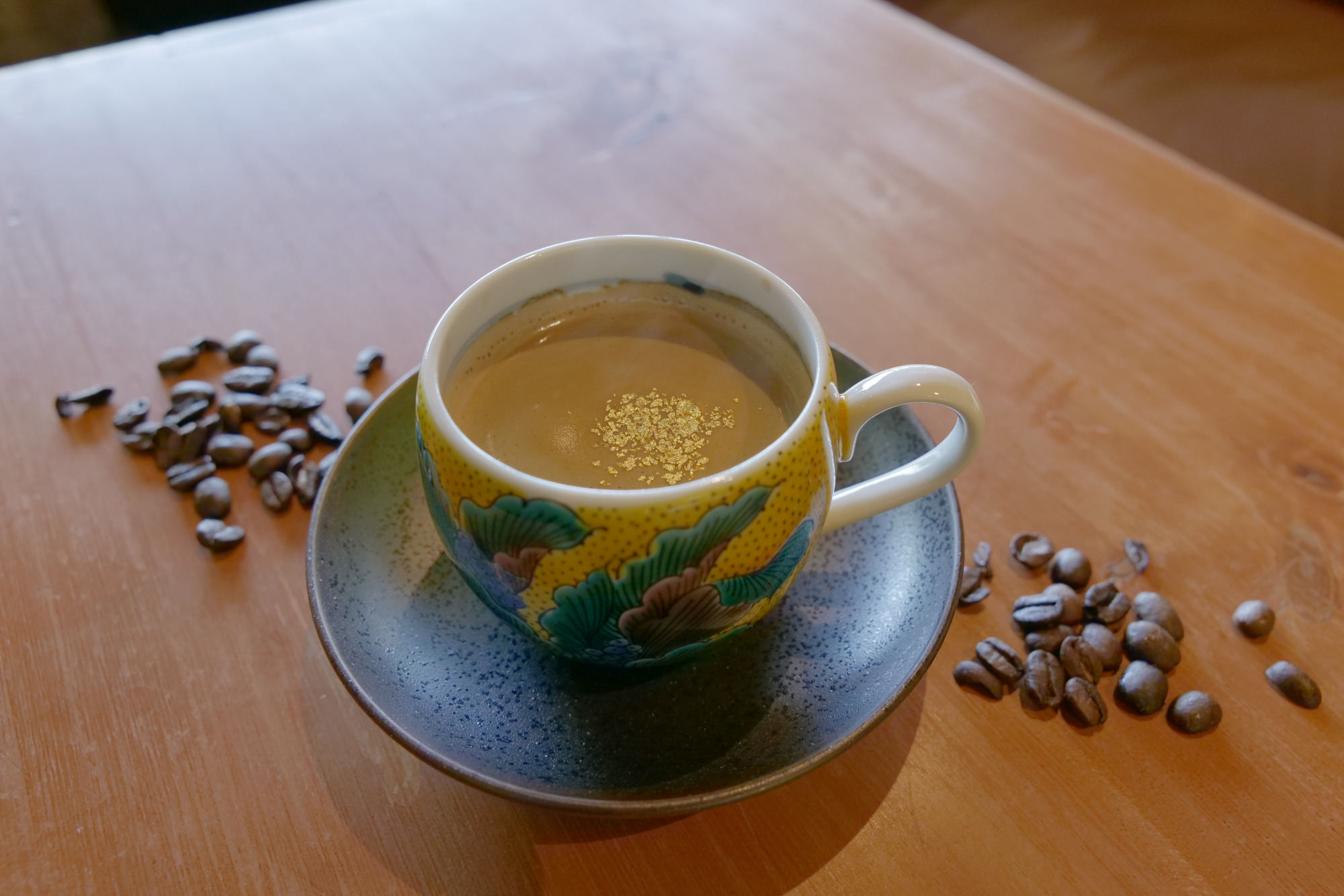 金沢観光の定番「金澤珈琲」は、金粉が入った特別な一杯。九谷焼のカップで提供され、金沢ならではのコーヒーを楽しめます。