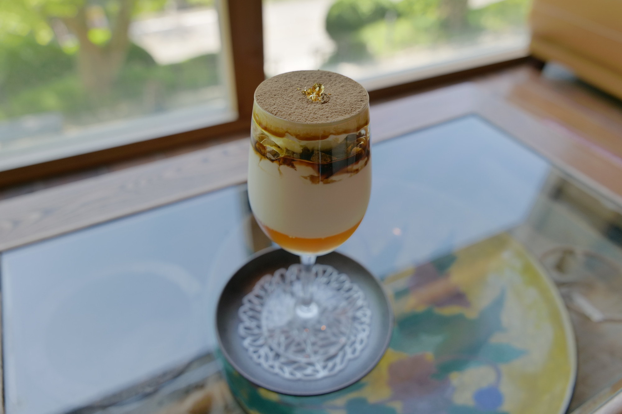 「加賀棒ほうじ茶ティラミス」は、ほうじ茶をふんだんに使った一品。こちらも金箔が使われています。いろいろな風味と食感が楽しめる、ここでしか味わえないティラミスです。
