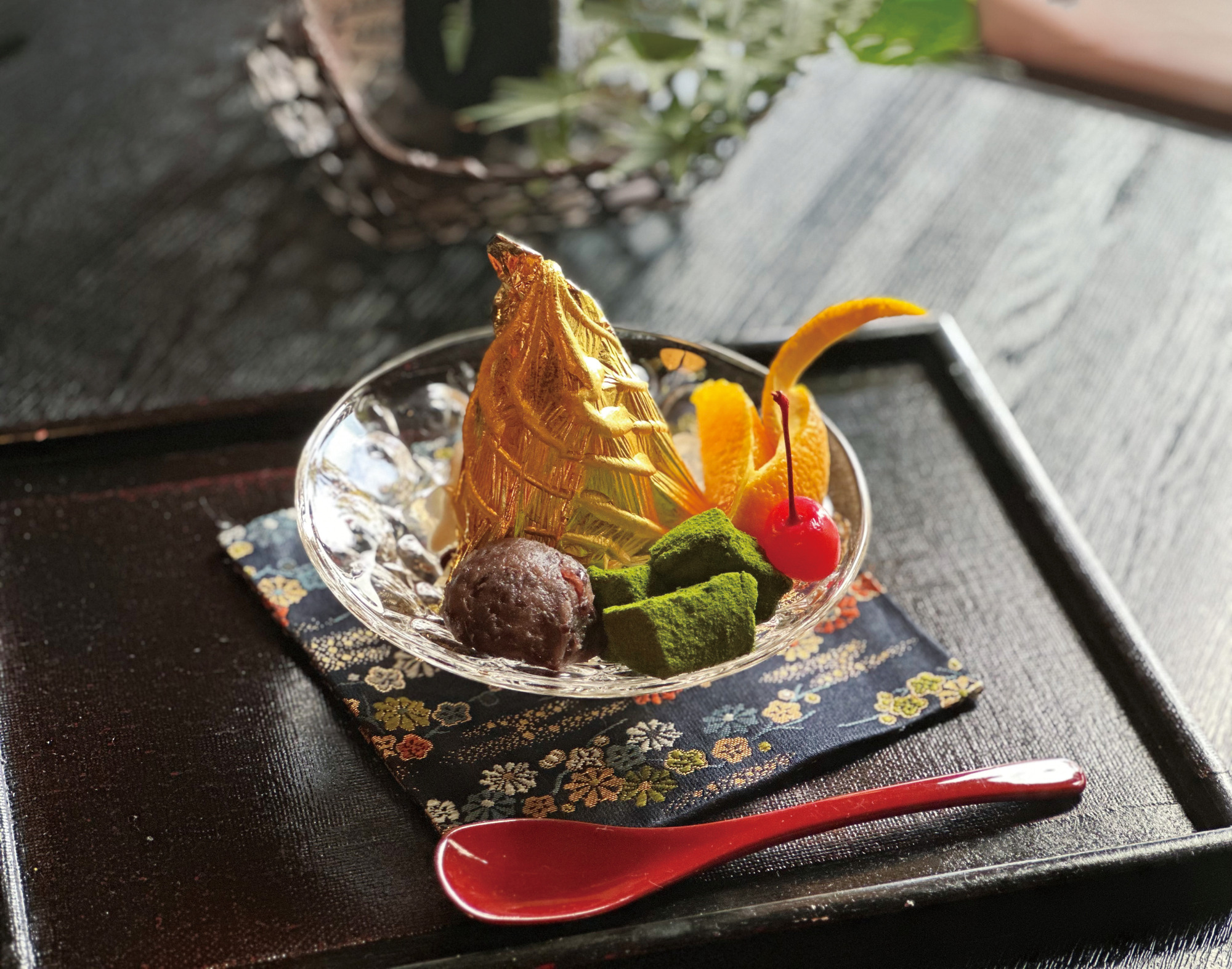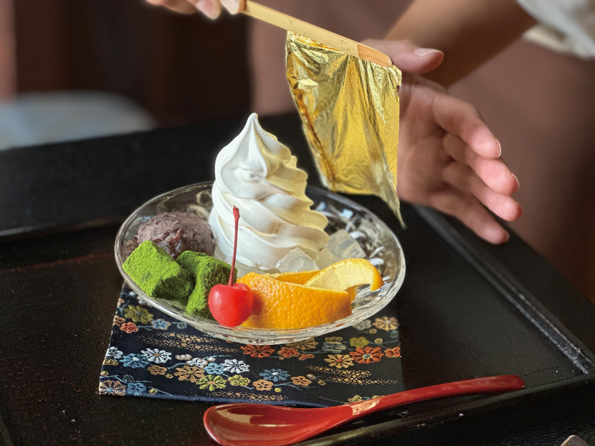 一番人気は、一枚の金箔を豪華にまとった「金箔あんみつ」。国産の寒天には優しい甘さの粒あんや、もちもち食感のわらび餅が添えられています。金沢の伝統と味わいを楽しめる一品です。