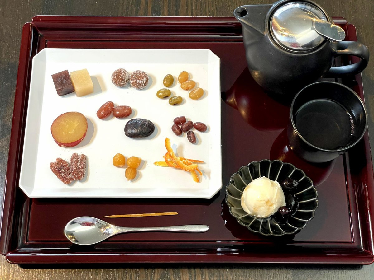 人気のメニューは「かわむらプレート」。お店自慢の甘納豆や季節の糖菓子をちょっとずつ盛り合わせにしてあります。セットにするドリンクは香ばしさ満点の地元のお茶加賀棒茶がおすすめ。