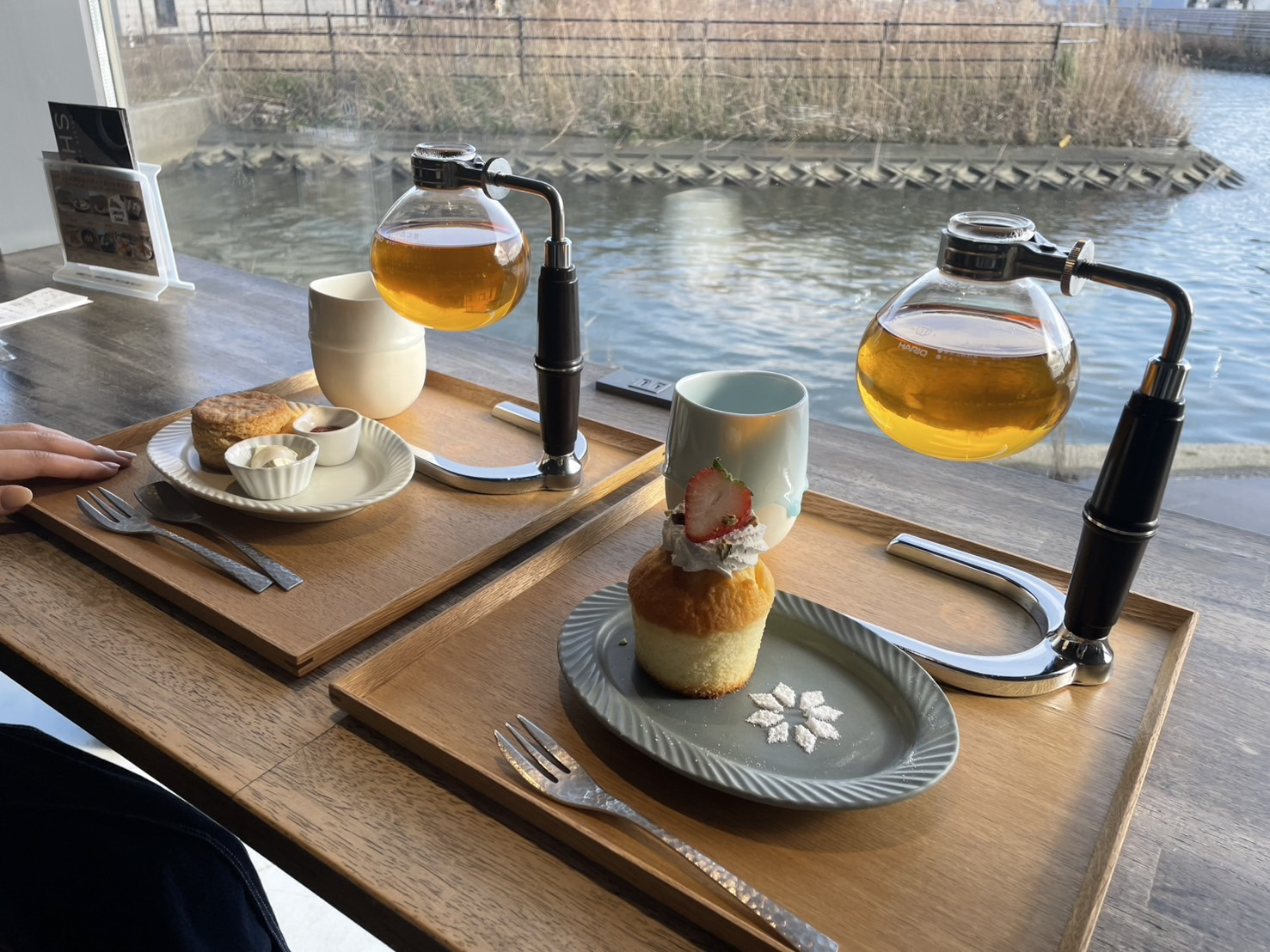 大きな窓が特徴の店内は、開放感がありゆったりとした時間が流れています。晴れた日には、川面がキラキラしていてとてもきれい。自然の景色を眺めながらおいしいお茶やスイーツを堪能し、日ごろの疲れもすっきり癒されます。