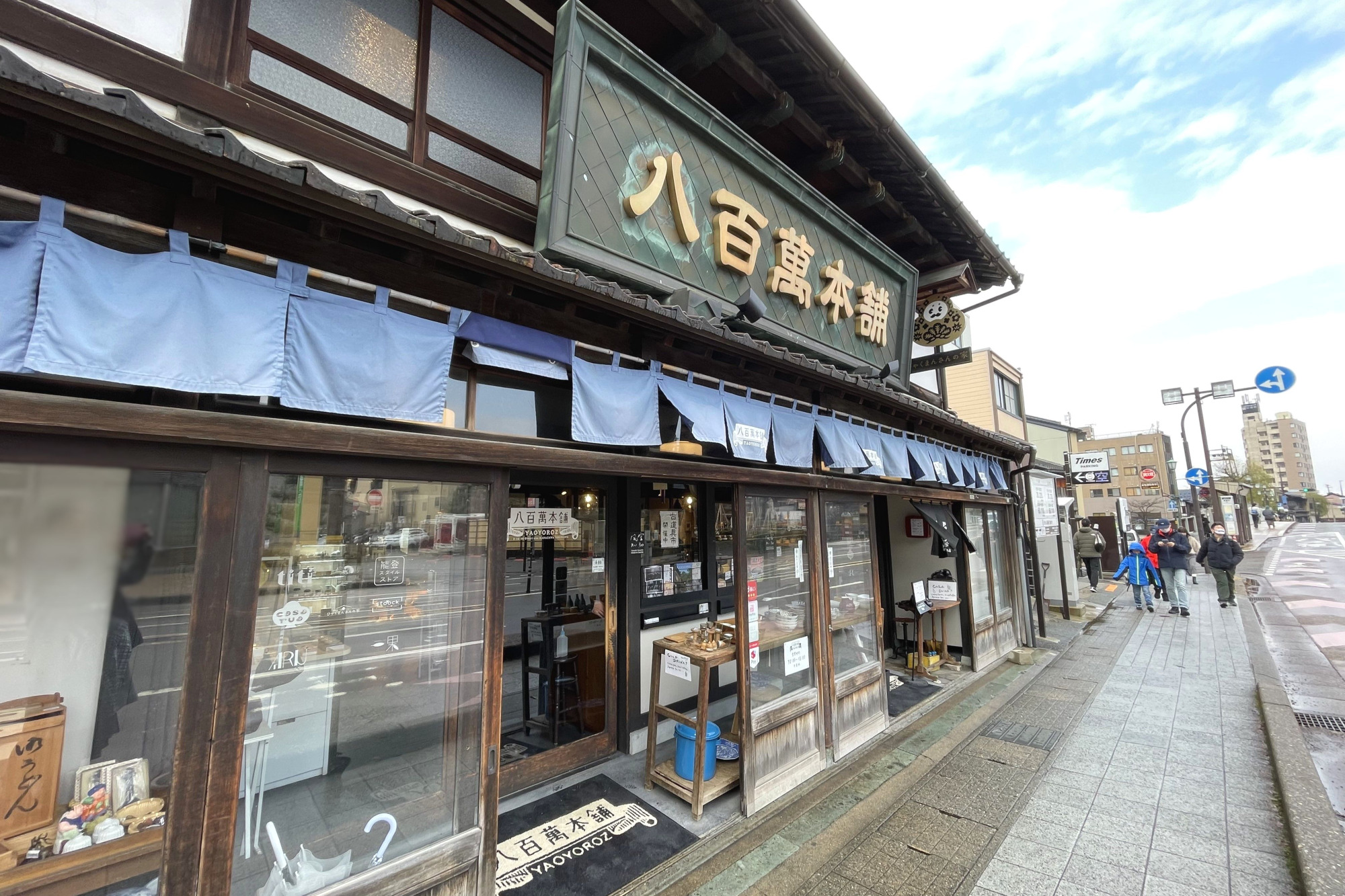 「八百萬本舗」の最寄りのバス停は「橋場町」(はしばちょう)。金沢駅からだとバスで10分ぐらいです。金沢の人気観光スポット「ひがし茶屋街」や「主計町茶屋街」(かずえまちちゃやがい)の近くにあるので、茶屋街の散策と合わせて楽しんでください!