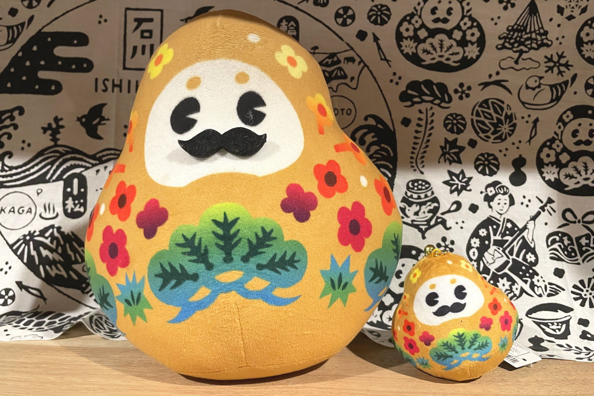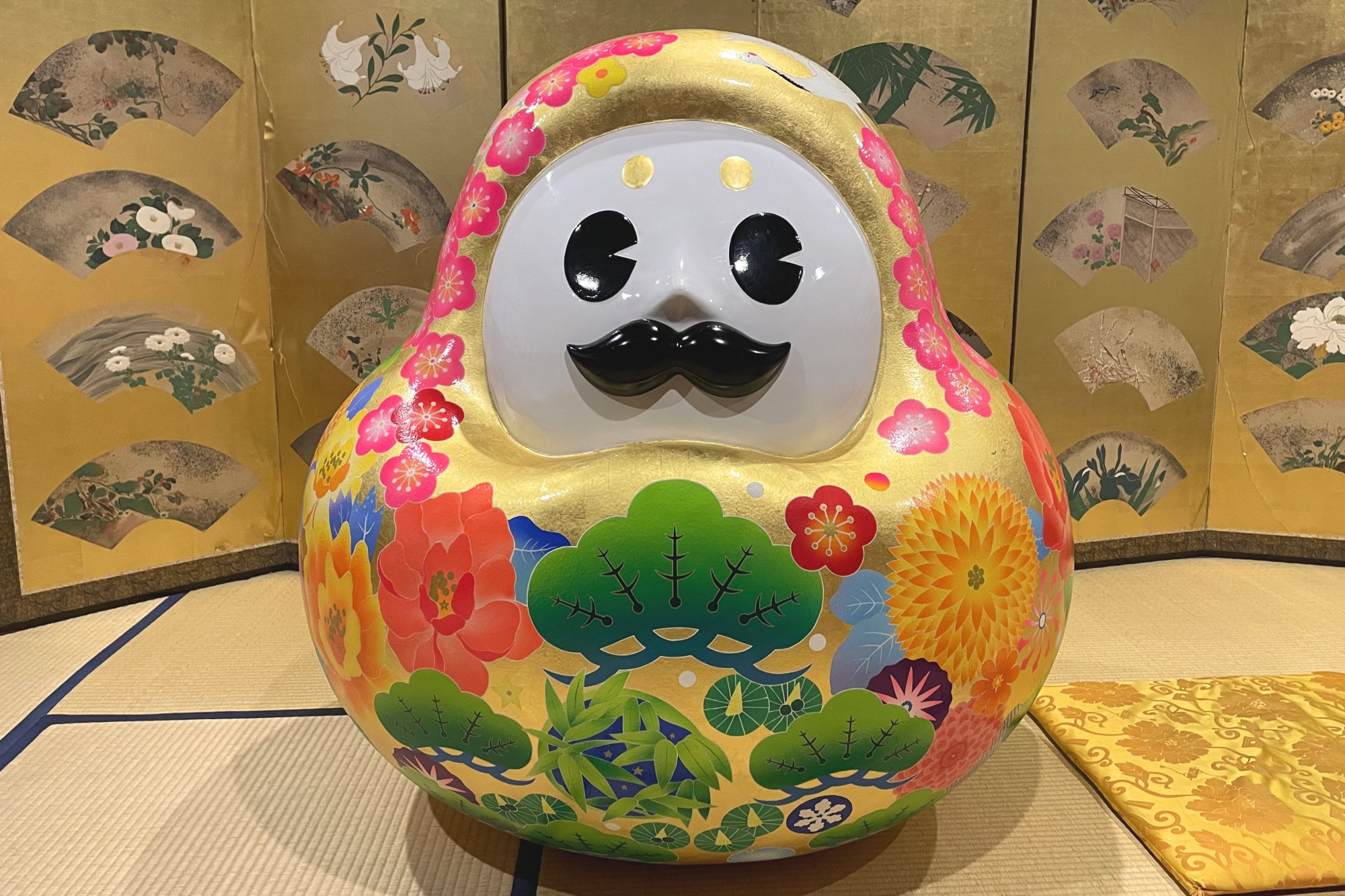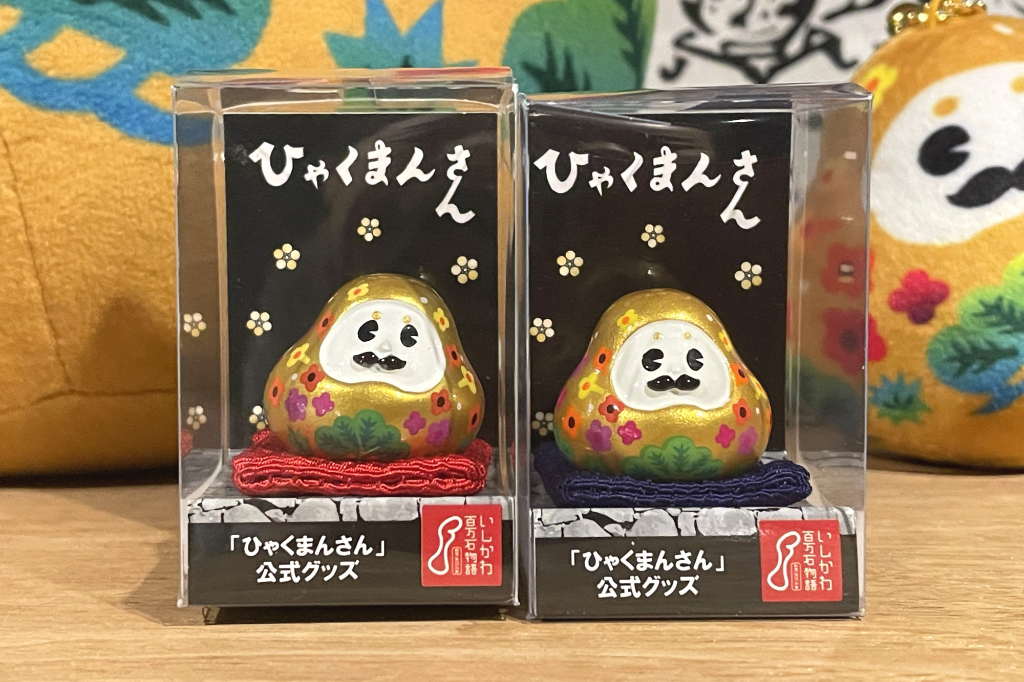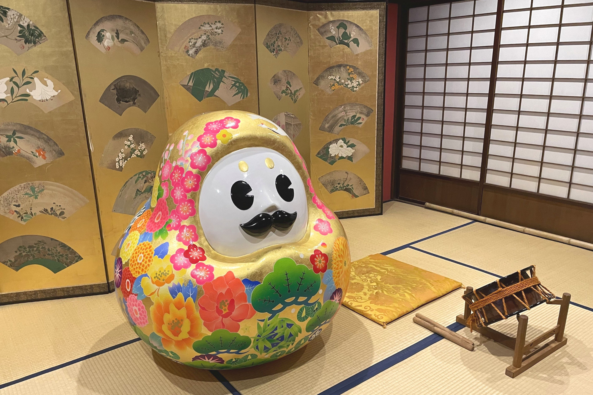 2階のお座敷にはドーンとひゃくまんさんが♪ここに来ればひゃくまんさんにいつでも会えちゃいます。キャストと以前共演したひゃくまんさんは、石川の郷土玩具・加賀八幡起上りをモチーフにしています。加賀友禅の柄や金沢箔などが施された豪華絢爛なキャラクター♪隣の金の座布団に座って記念写真を撮るのもOK!旅の記念にぜひ!