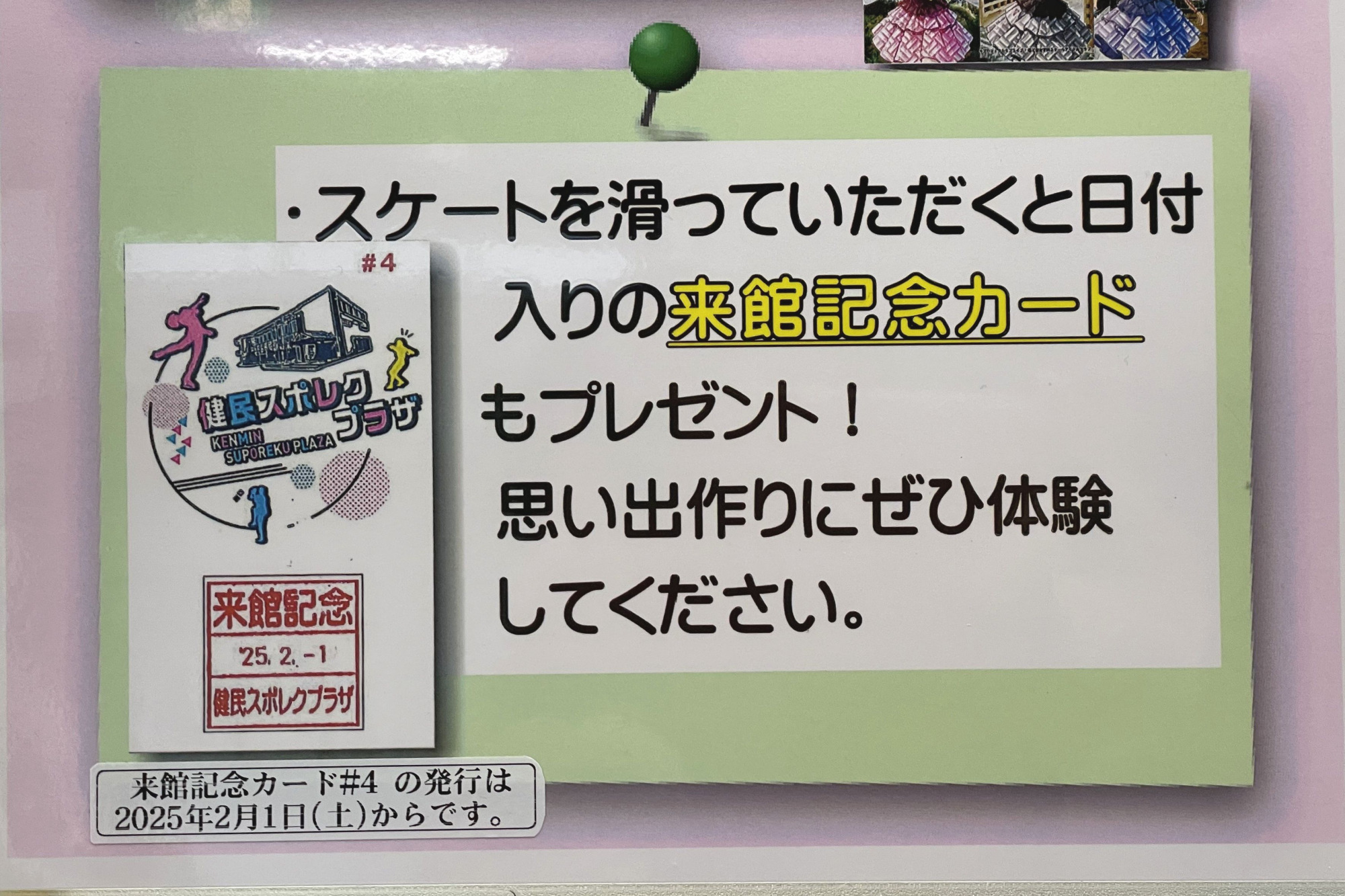 スケートリンクは2階にあります。見学は受付でお願いすれば無料でできますが、スケートを利用すると来館記念の限定カードをもらうことができます!2月1日から第4弾のデザインに更新されたので、初めての方も、すでに滑りに来たことがあるよ!という方も、ぜひスケートをしてカードをゲットしてみてはいかがでしょうか。