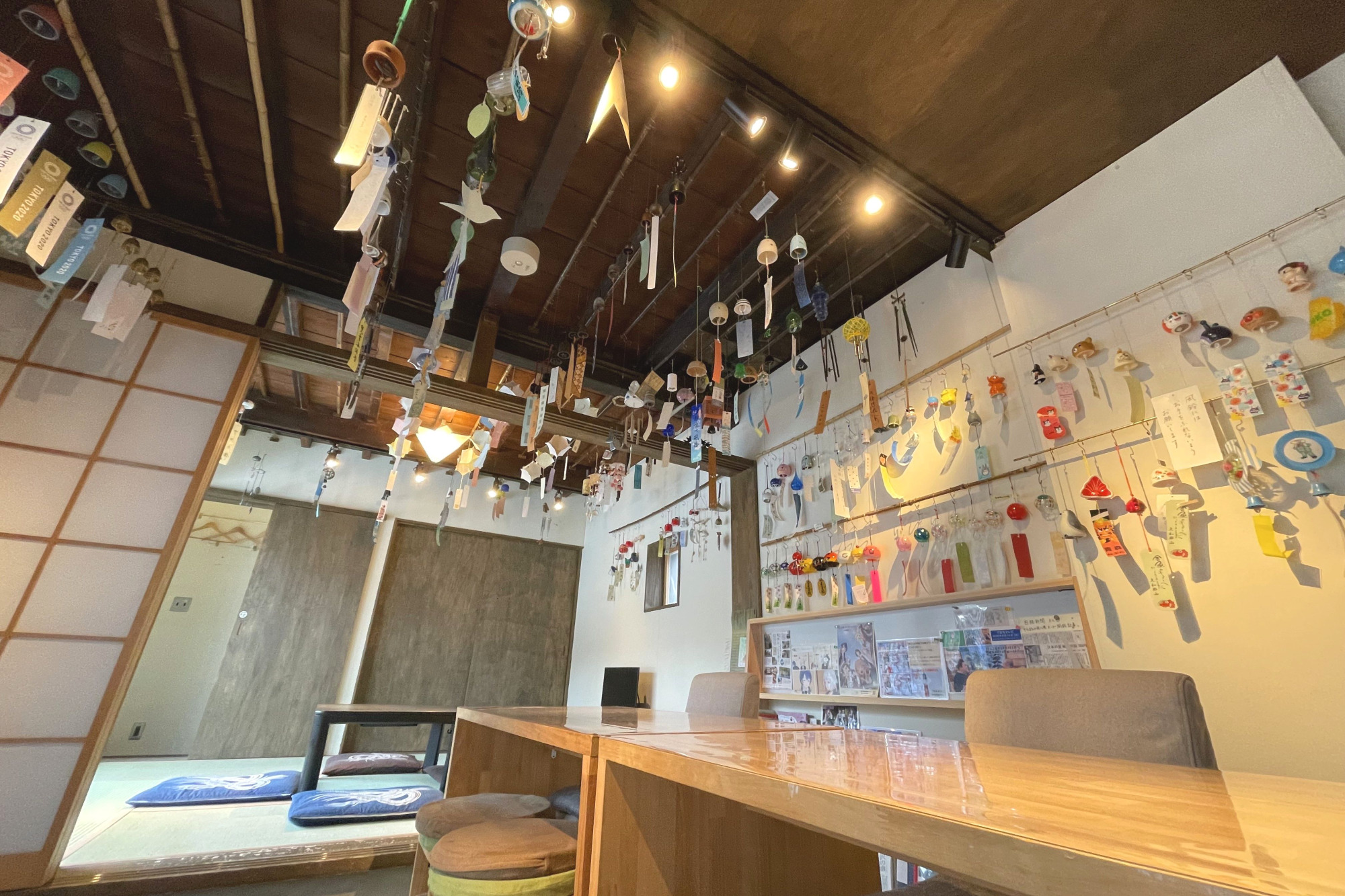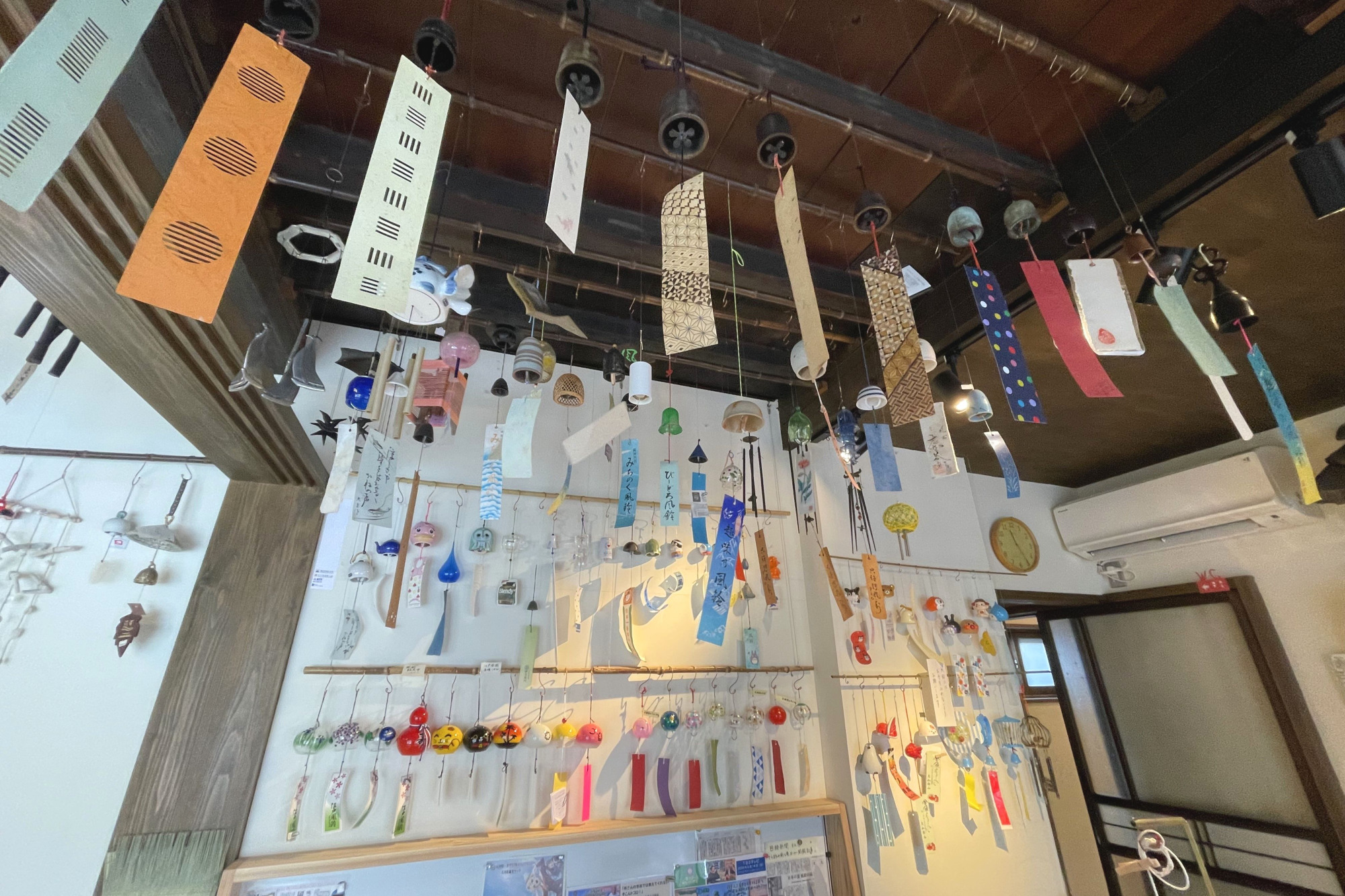1階には風鈴がいっぱい!風鈴ギャラリーとしても楽しめるようになっていて、飾られている数は約150個!日本だけじゃなく世界中のものがあるんですよ。