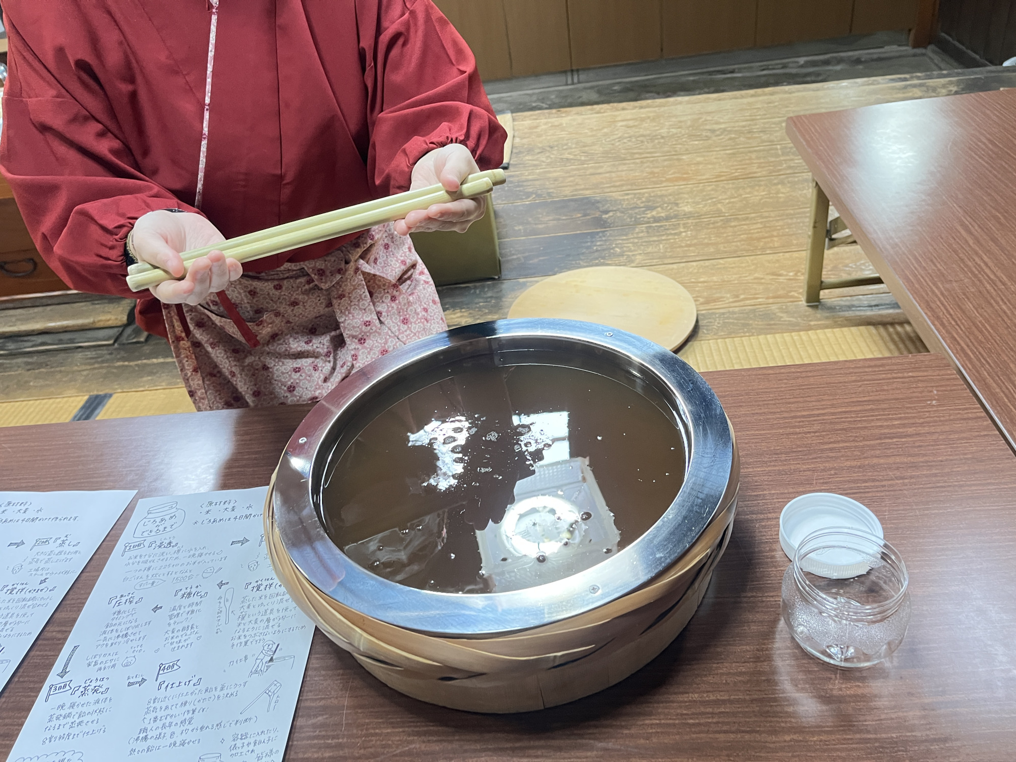 次に俵屋の歴史や砂糖を使わずに自然な甘さを引き出す「じろあめ」ができるまでの工程を聞きます。お店の方からお話を聞ける貴重な機会です。