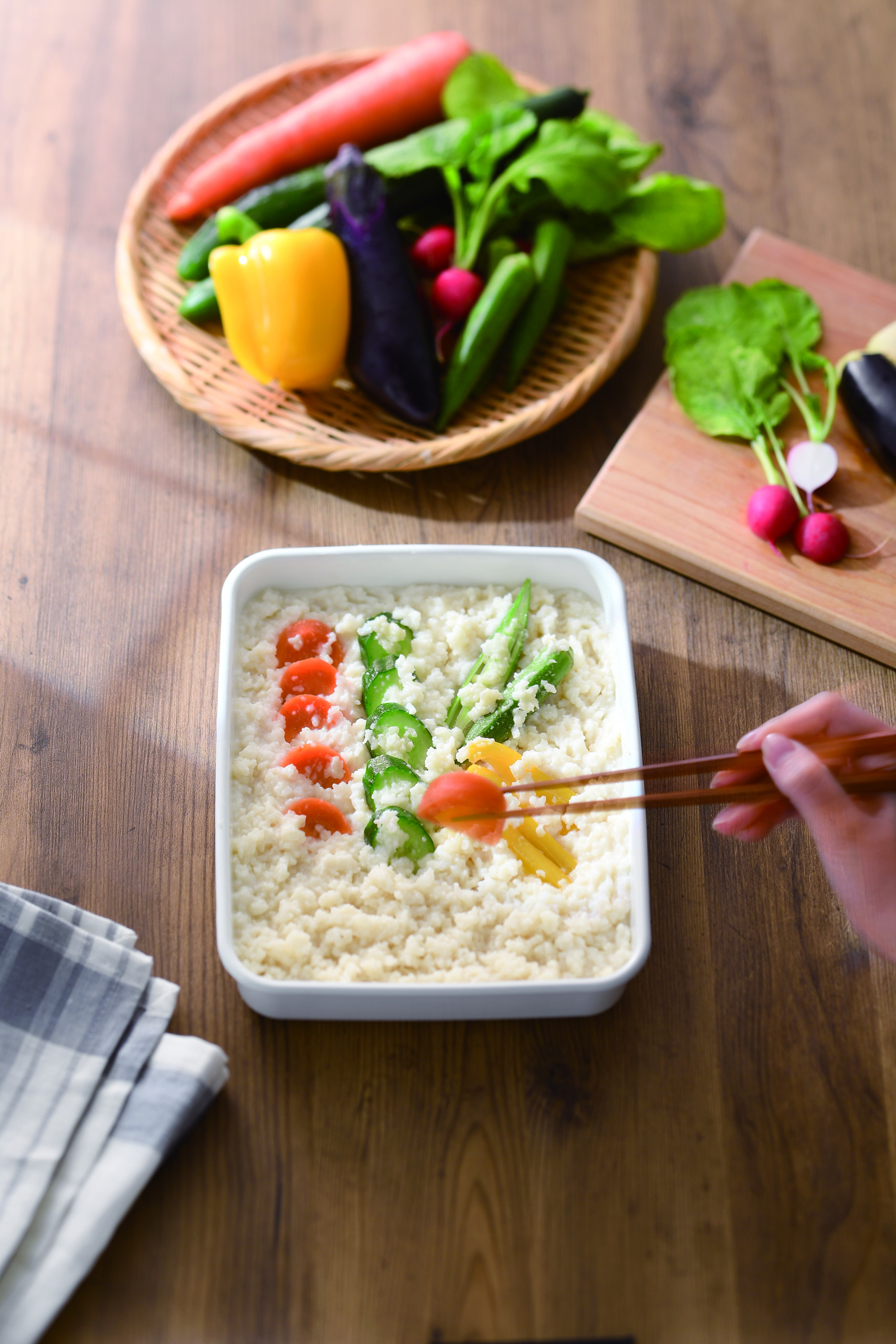 糀漬けは、糀とお米塩から作る糀床に野菜を漬けるだけ。自宅で糀の力でさらに美味しくなった野菜をいただきます。