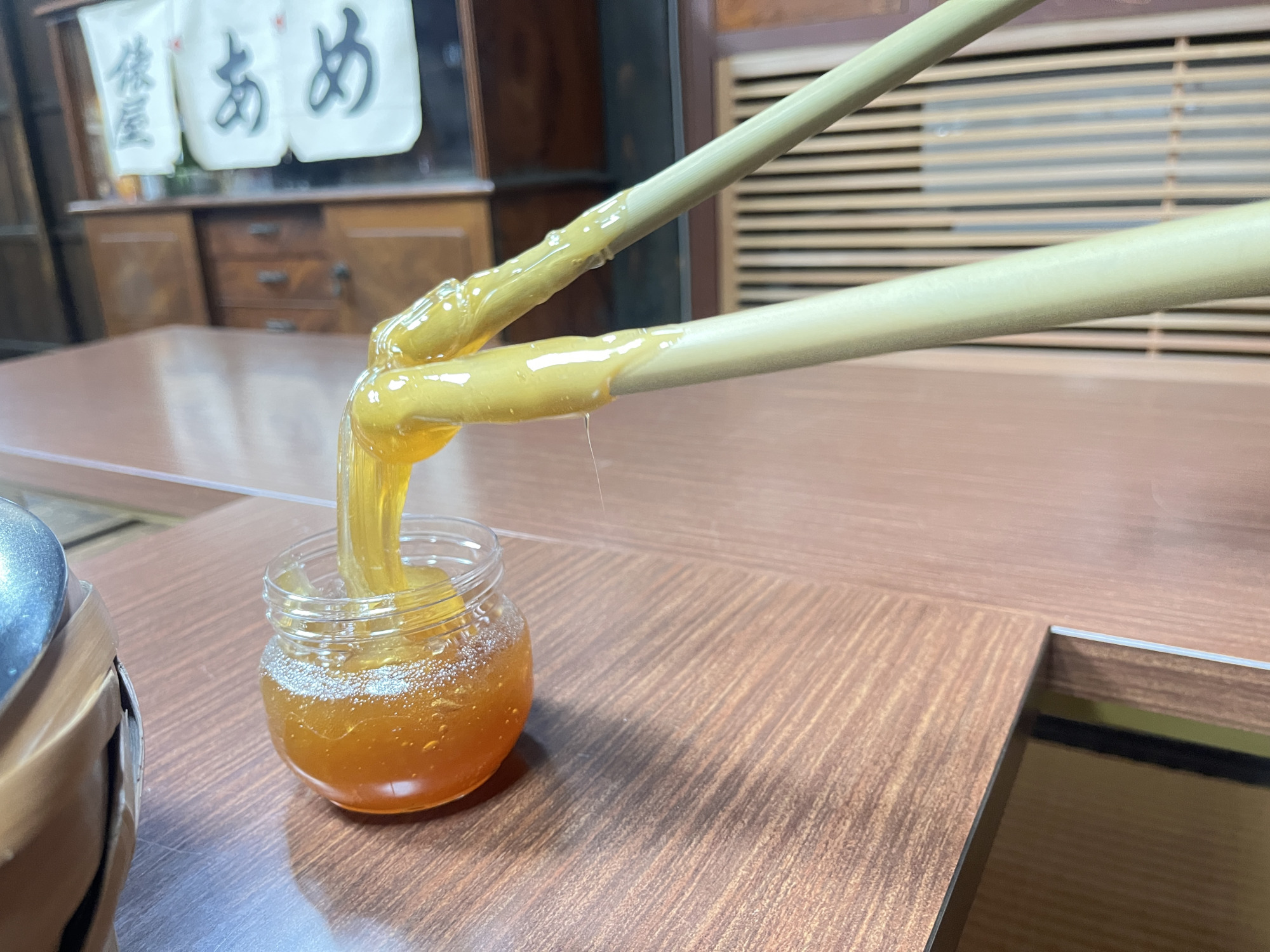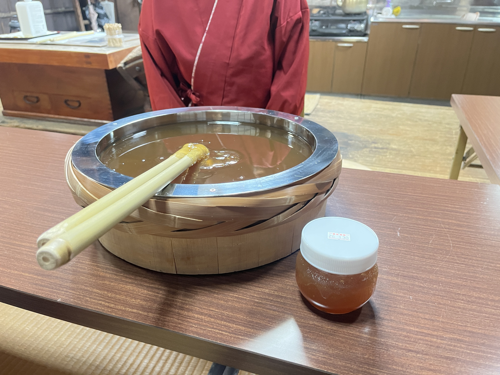 その後、俵屋の「じろあめ」を大きな桶から、竹のお箸ですくい取って容器に詰めていきます。