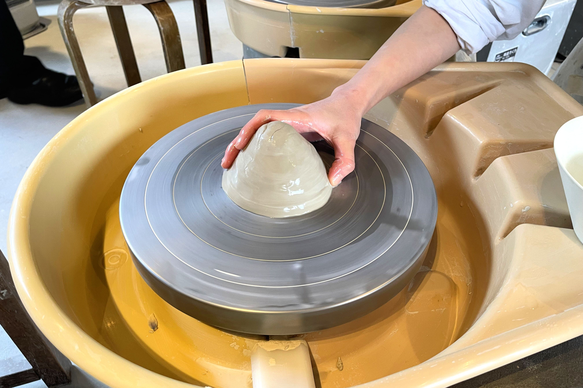 それでは体験スタート!はじめに、ろくろの中心に土を置きます。