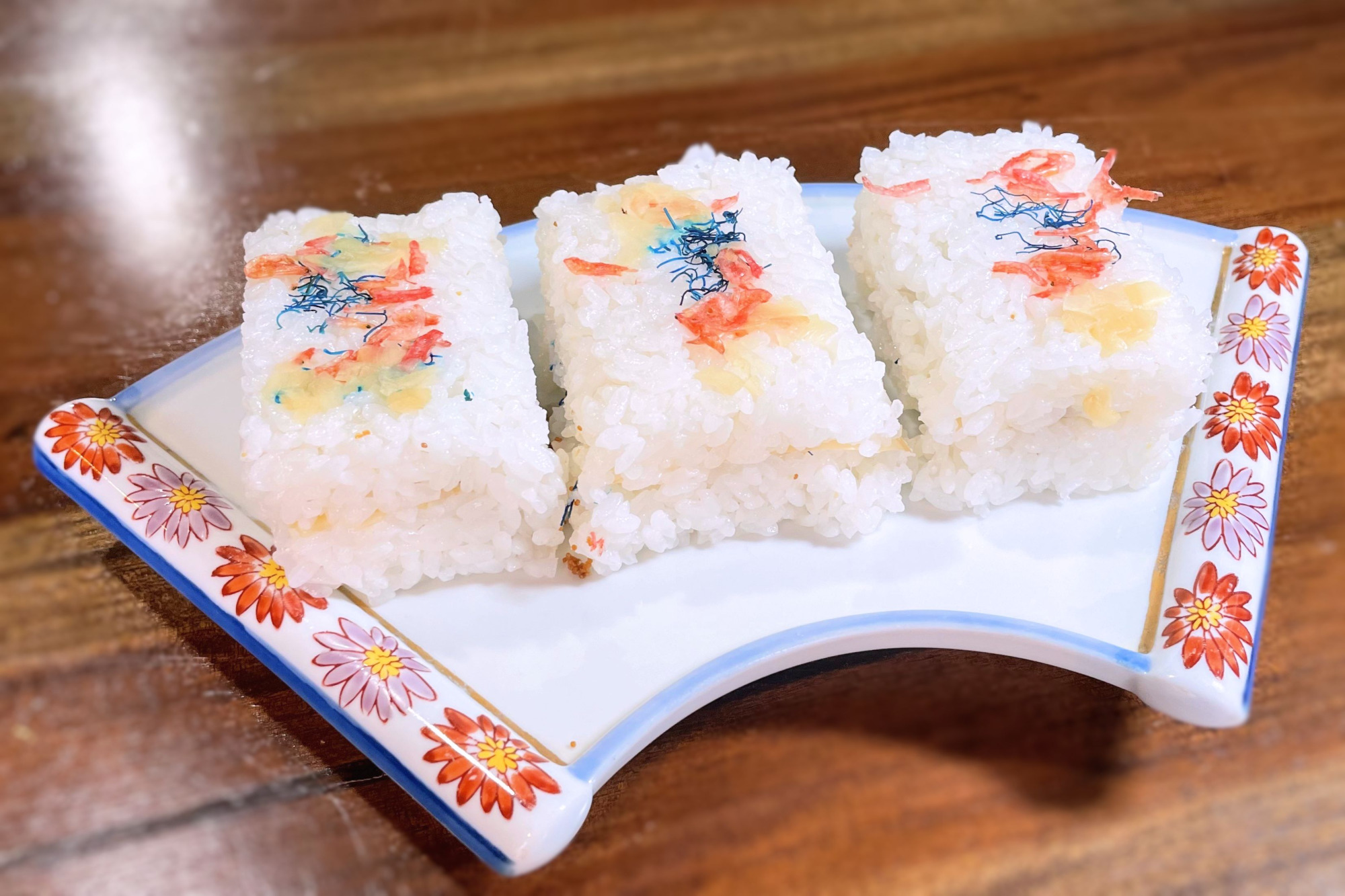 酢飯の上に、青色の糸のようなもの・桜エビ・がりをのせます。この青色の糸のようなものは「紺のり」といって、海藻を青色や紺色に染めたものです。