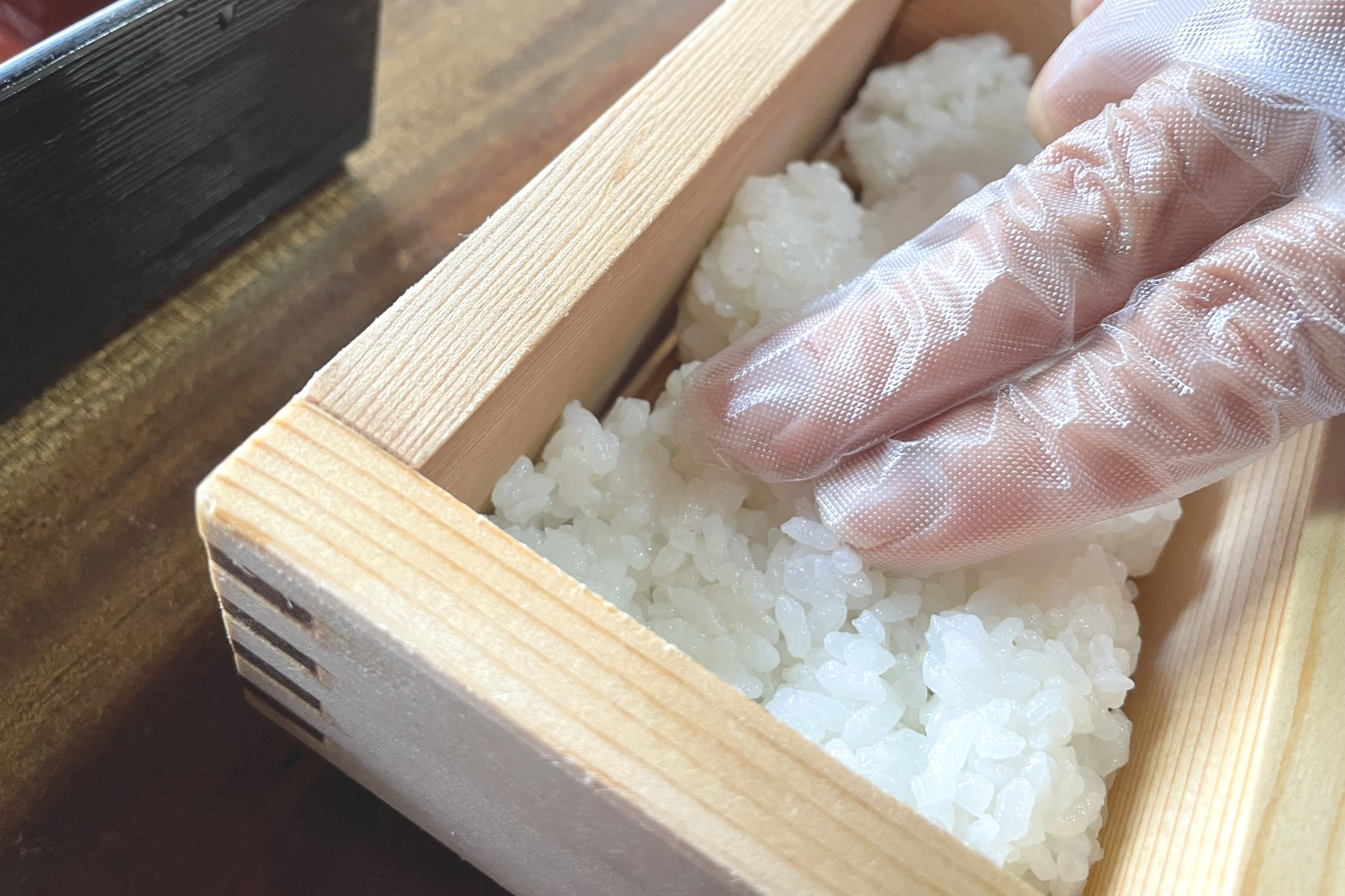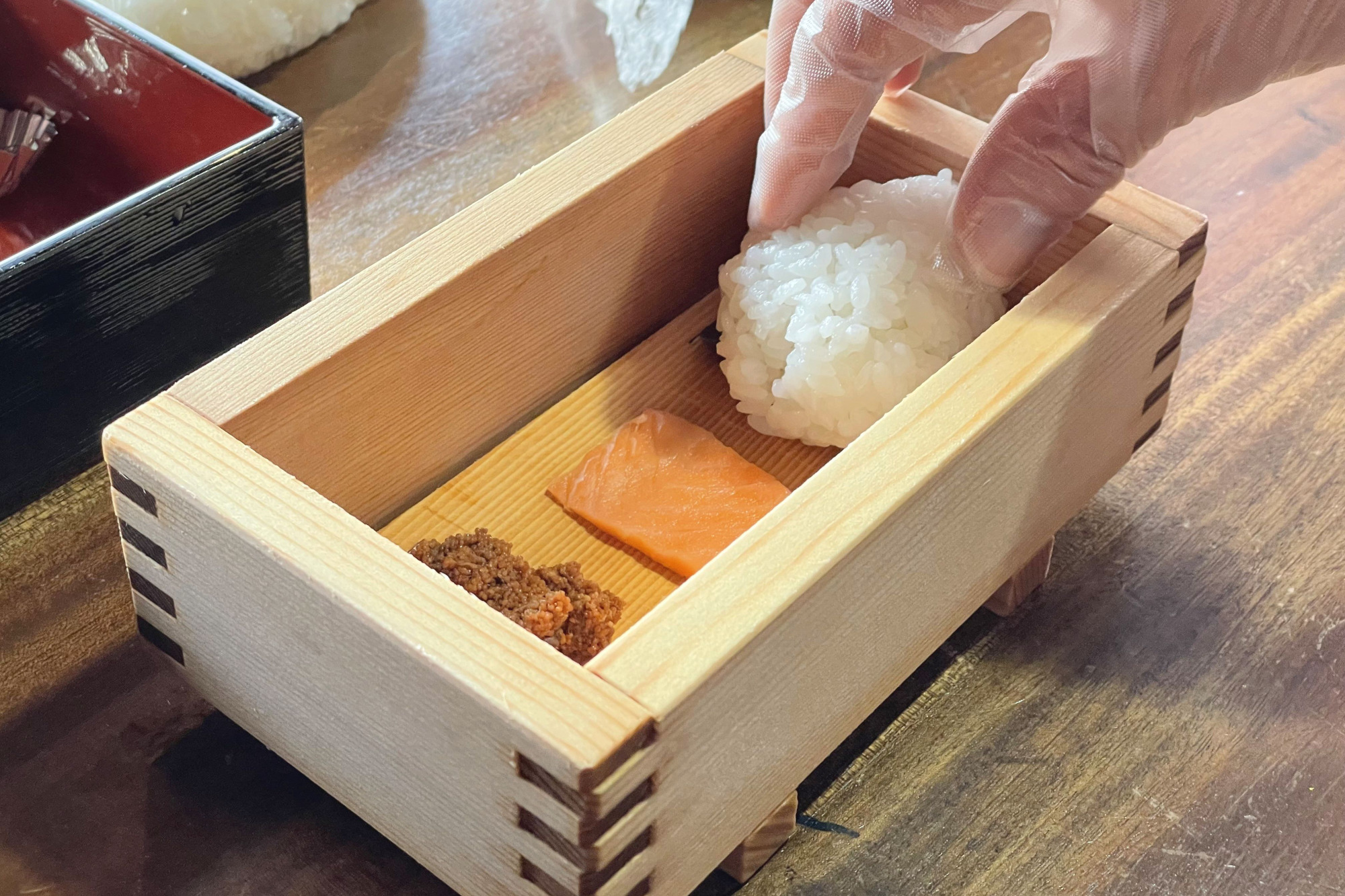 目の前に準備されたのは、酢飯や具材、それらを敷き詰めて入れる木製の型。では押寿しを作っていきましょう!