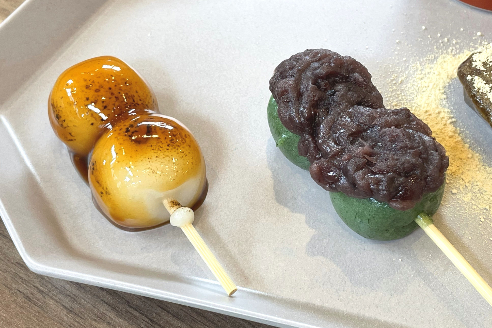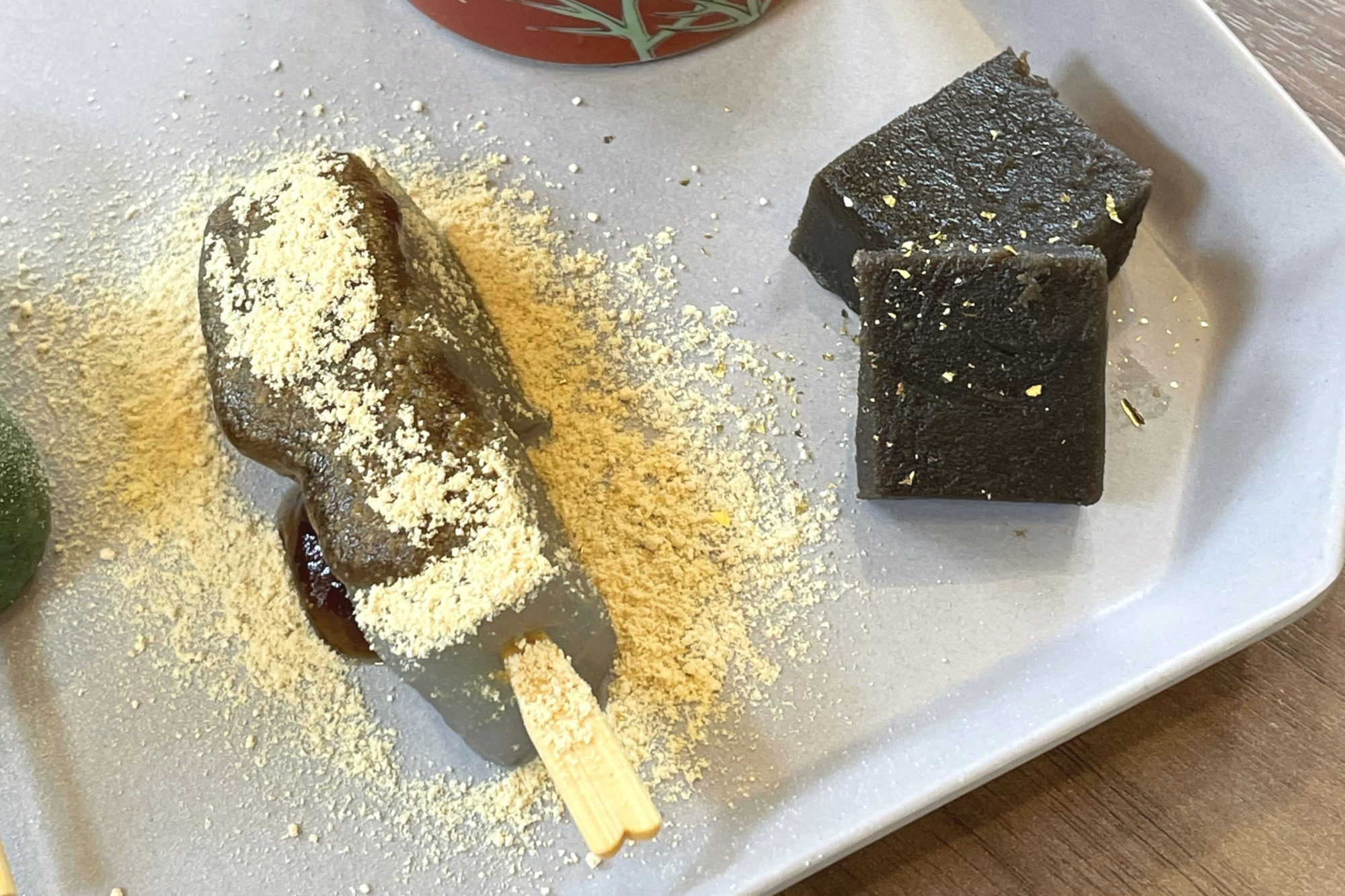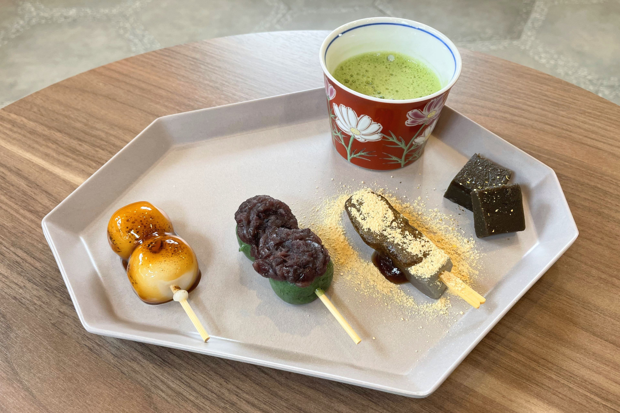 「武家屋敷プレート」は、団子2種類とわらび餅、チョコ羊羹、お抹茶がセットになっています。これがどれもホントに美味しい~♡お団子は滑らかでモッチモチ!一口で感動する美味しさです。きなこがかかったわらび餅に、和と洋がコラボしたチョコ羊羹も絶品でした。