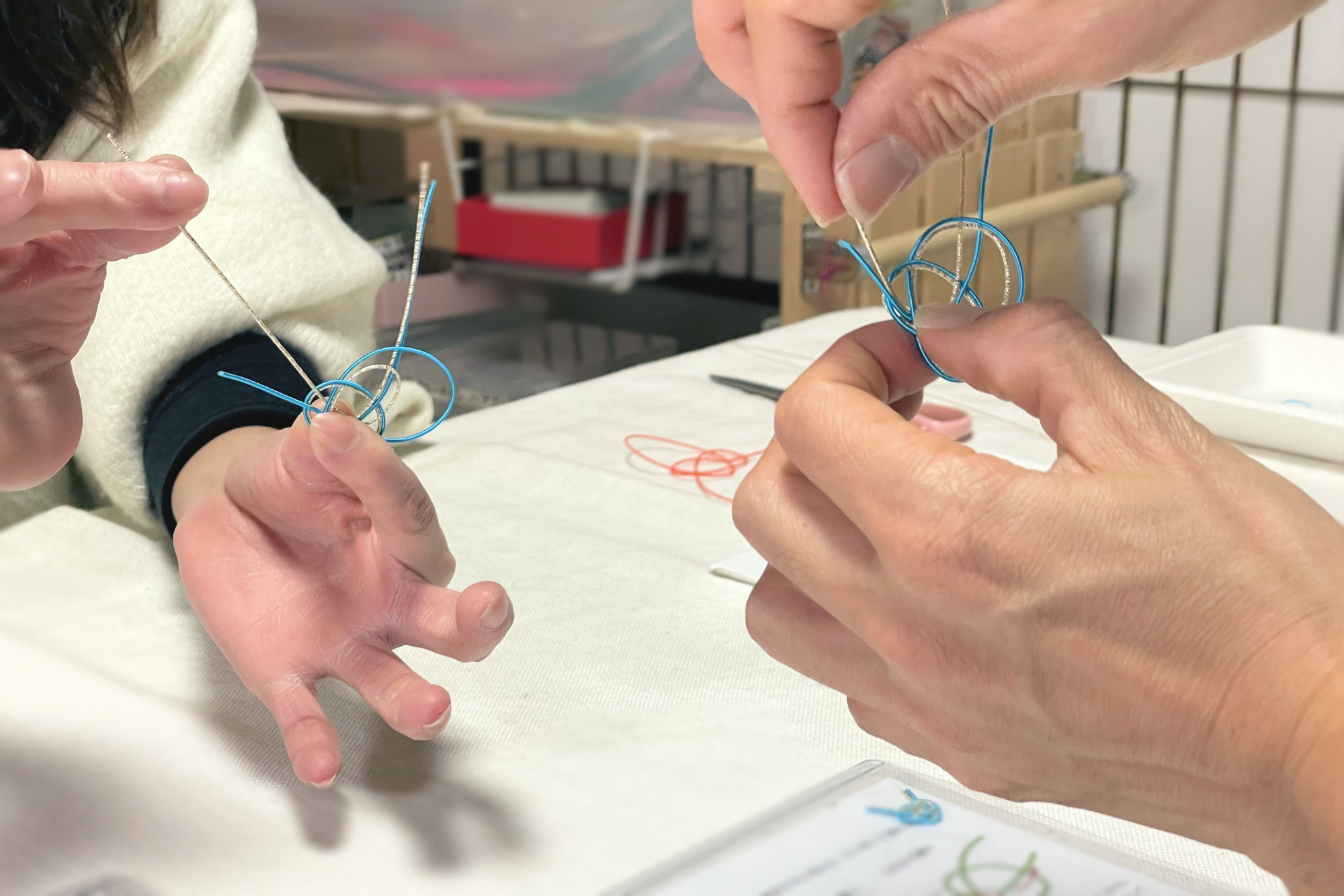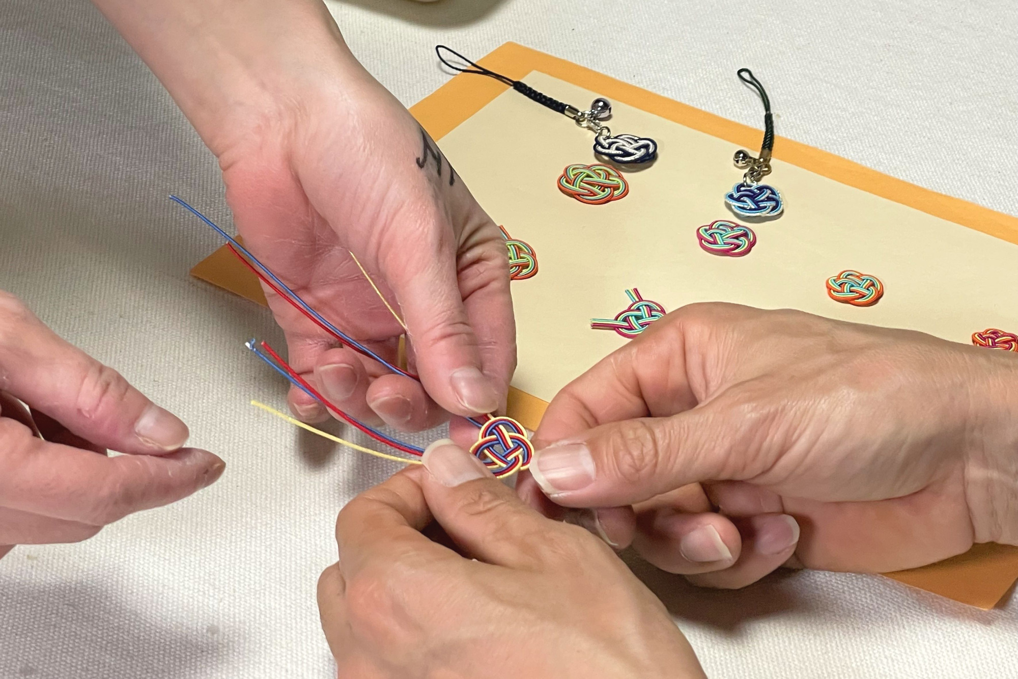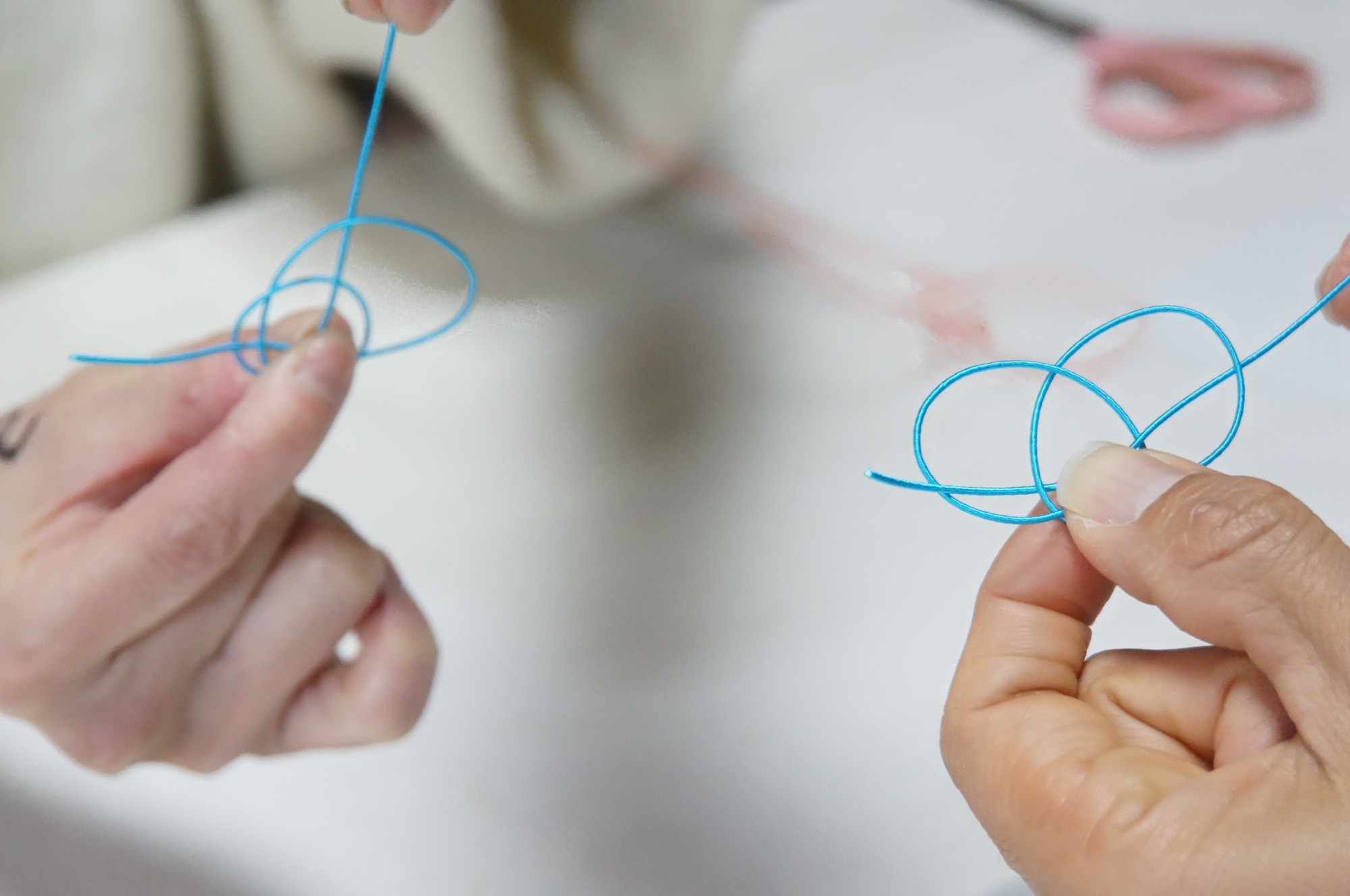 まずは練習から。水引の基本となる「あわじ結び」を学びます。あわじ結びは一般的な祝儀袋などにも使われる結び方。輪っかを作って、通して、引っ張ってを繰り返します。先生によると「キャストの皆さんは集中力があって、練習からとっても上手でした」とのこと♪