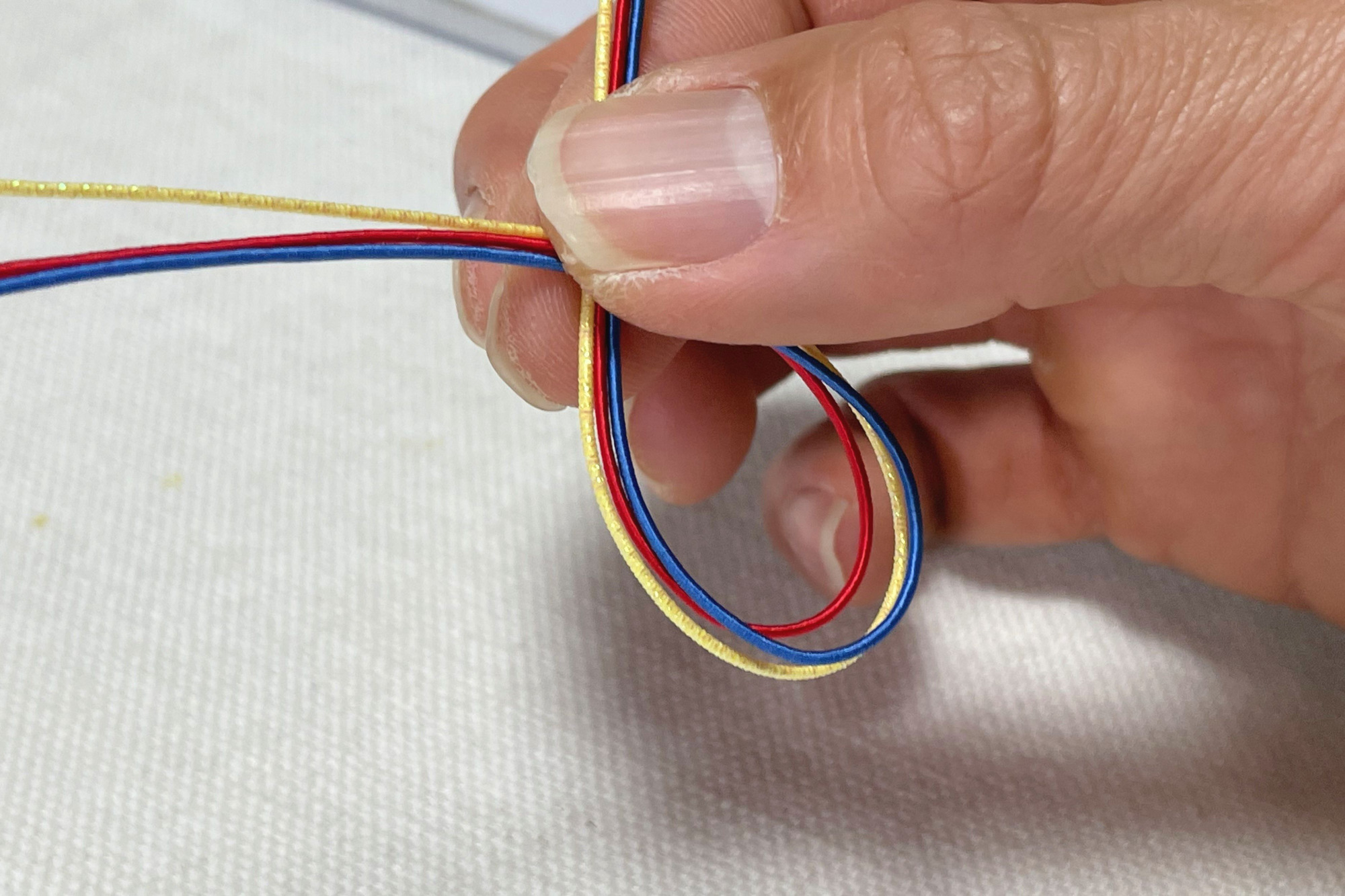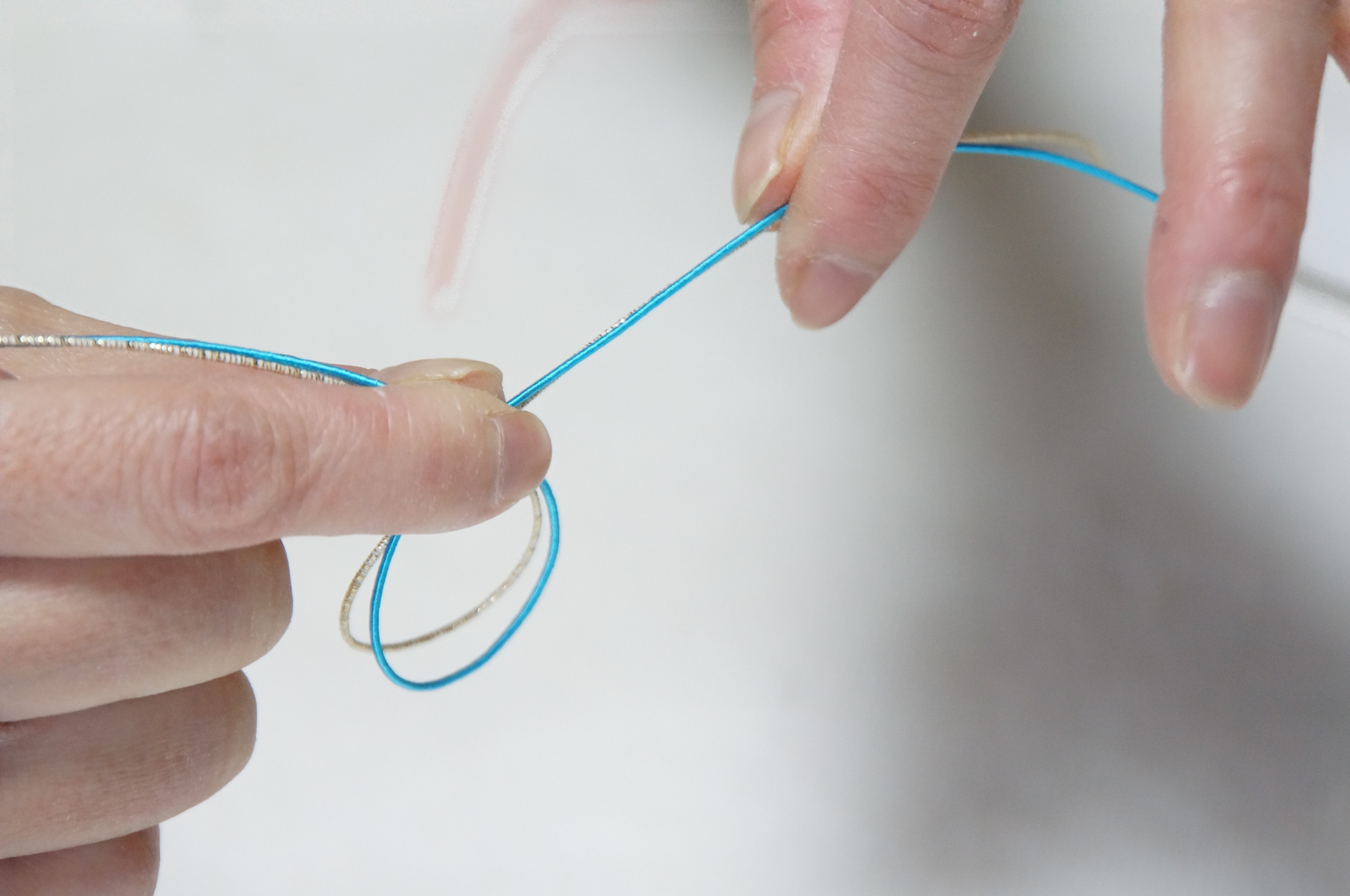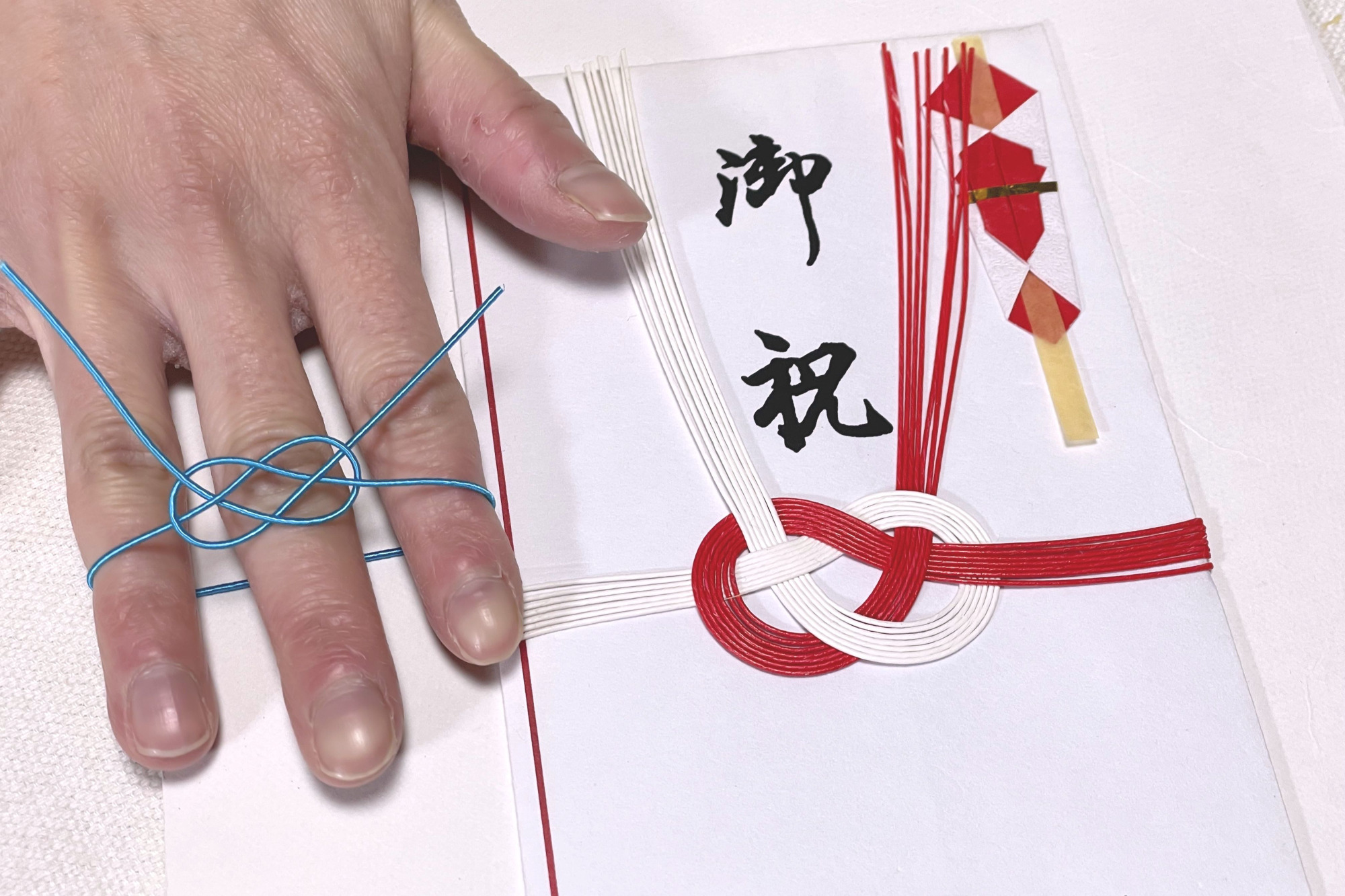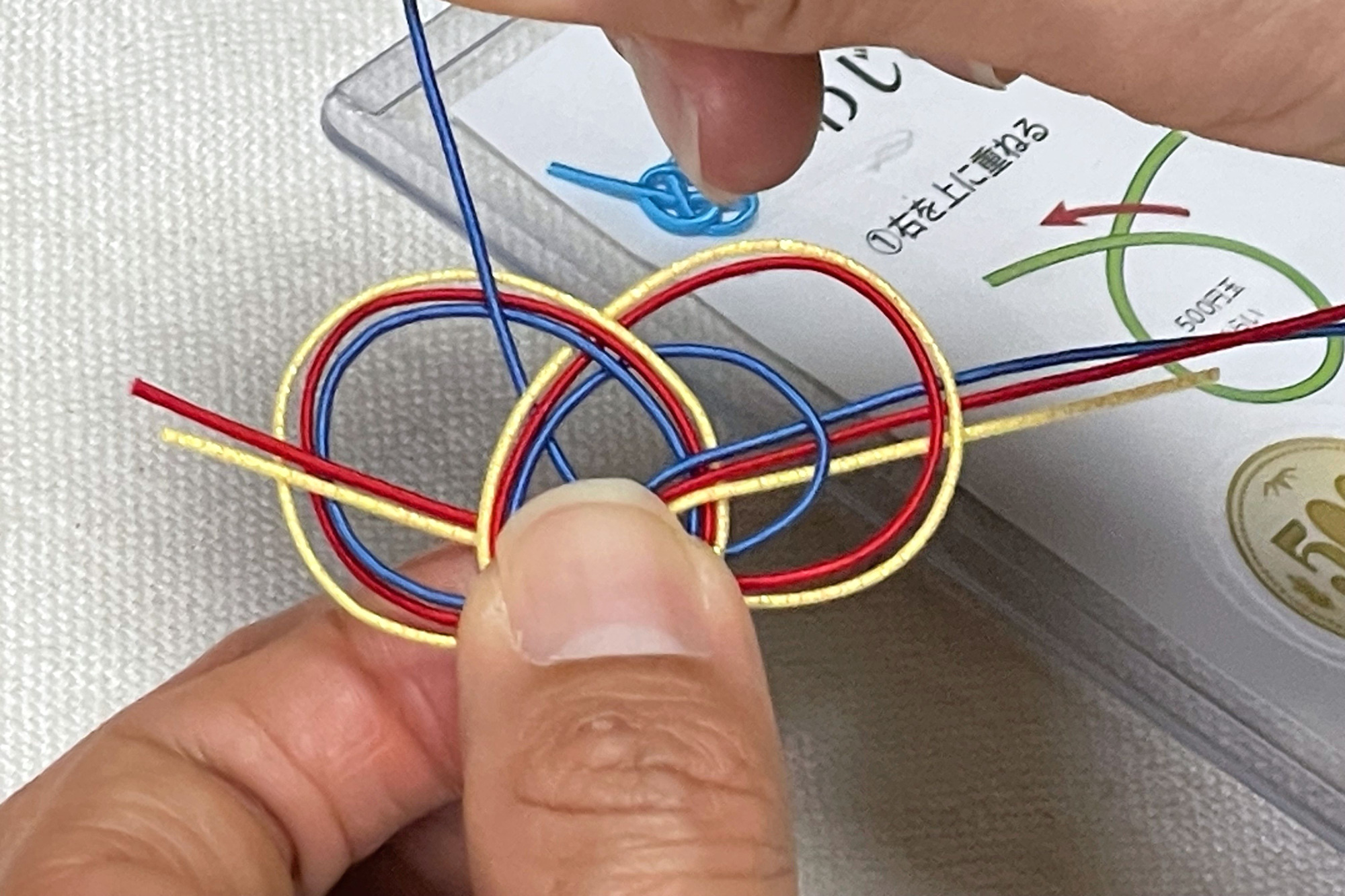 まずは練習から。水引の基本となる「あわじ結び」を学びます。あわじ結びは一般的な祝儀袋などにも使われる結び方。輪っかを作って、通して、引っ張ってを繰り返します。先生によると「キャストの皆さんは集中力があって、練習からとっても上手でした」とのこと♪