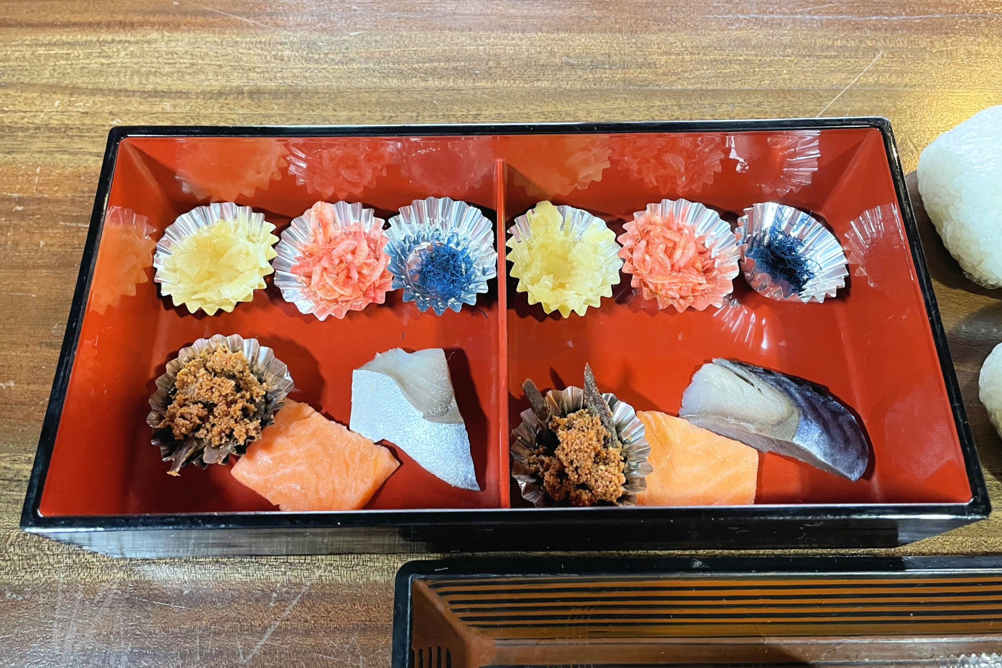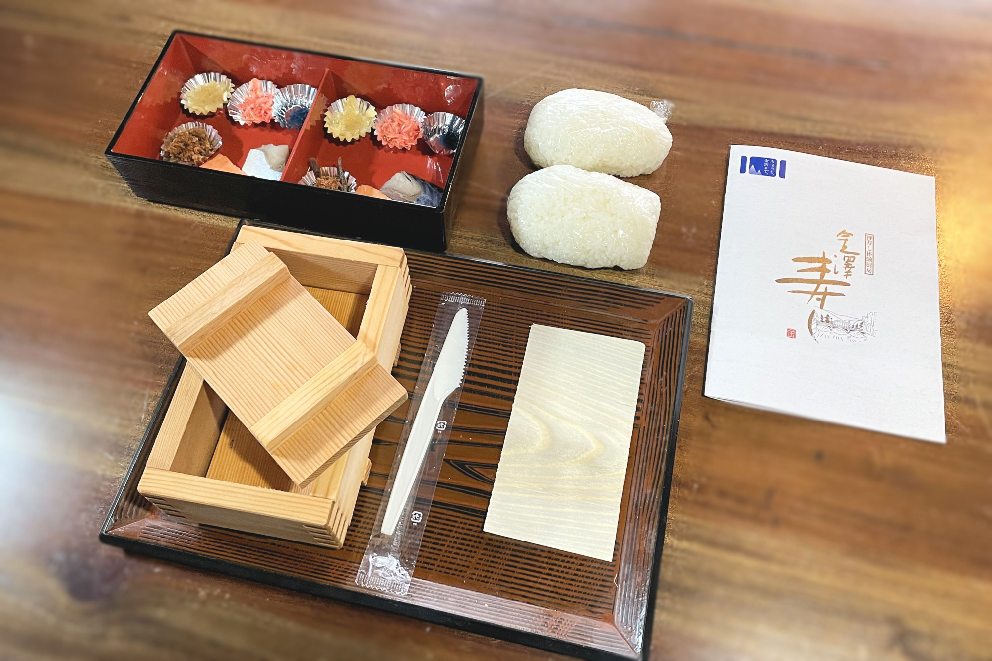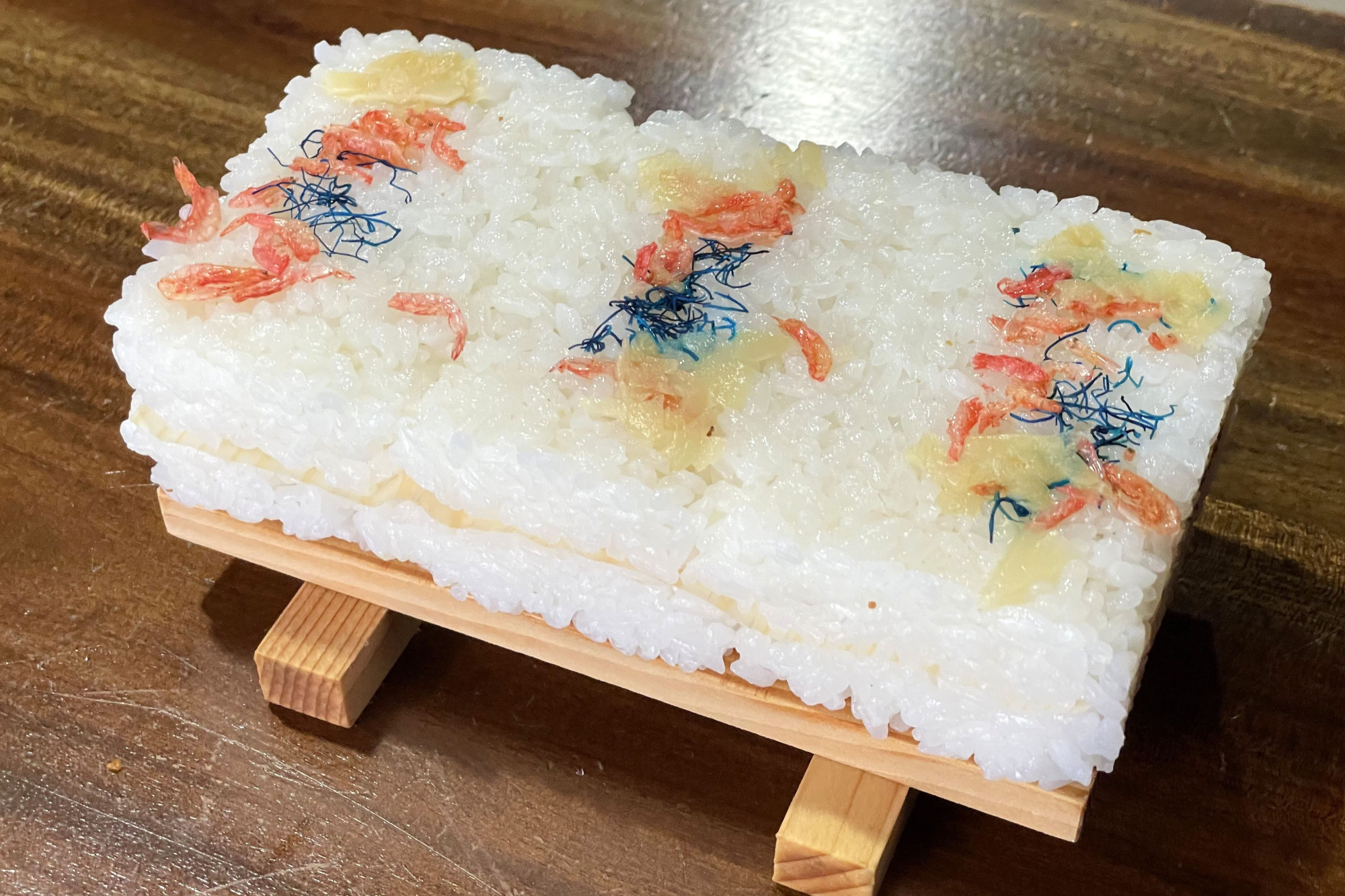 金沢伝統の押寿しを手作りしたものがこちら!押寿しは専用の木製の型に酢飯と具材をつめて作ります。全国各地に特色ある押寿しがありますが、こうして見ると金沢のものは一見シンプルそう!?青色の不思議な糸のような食材は一体何でしょう??