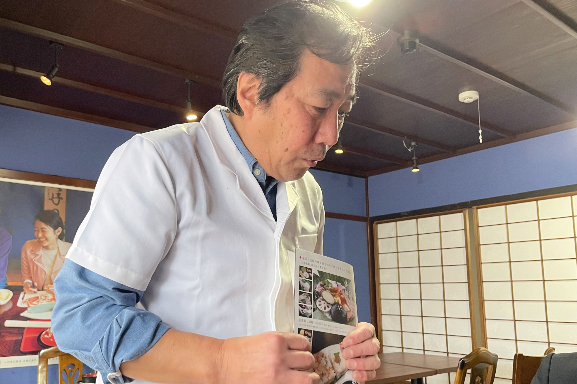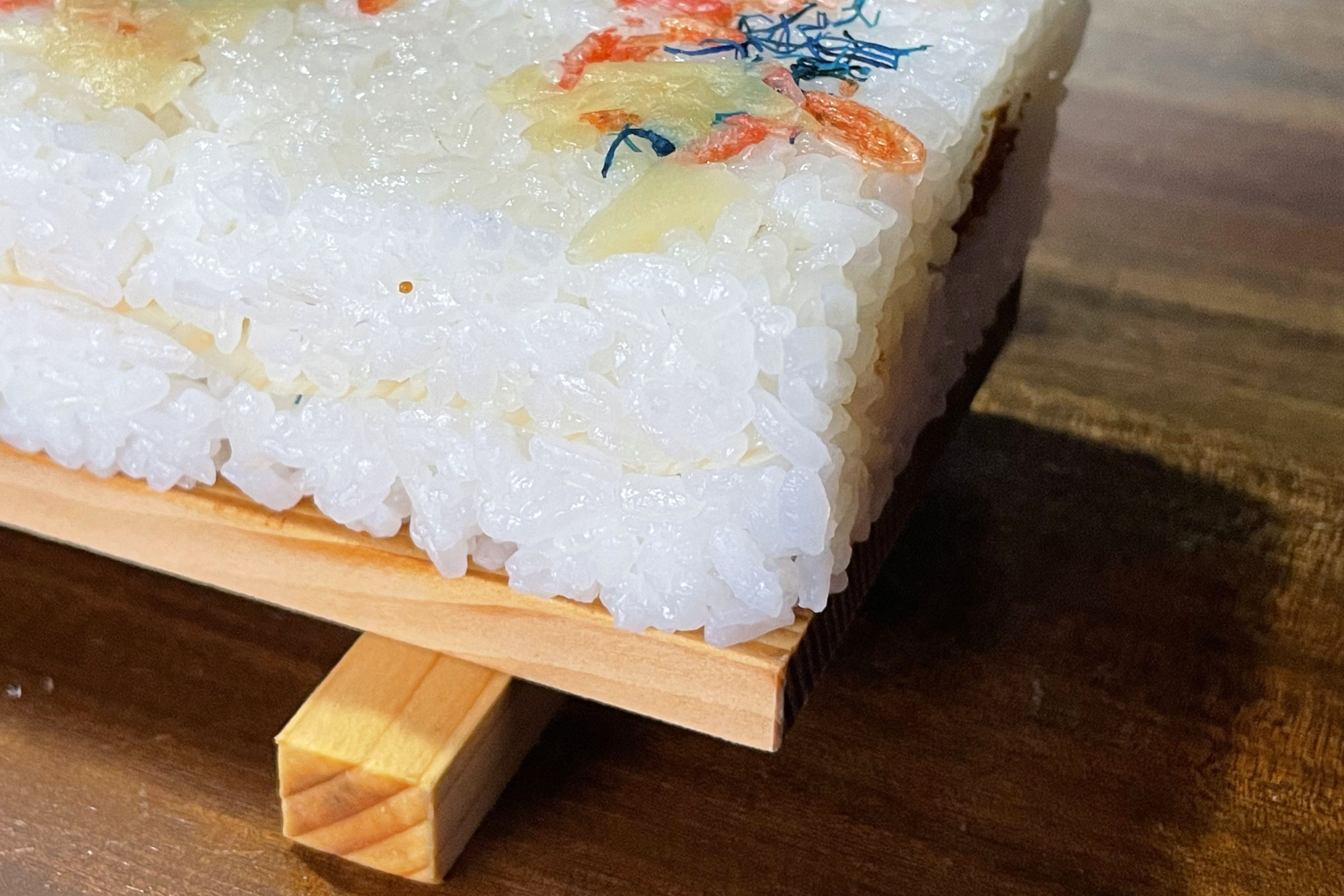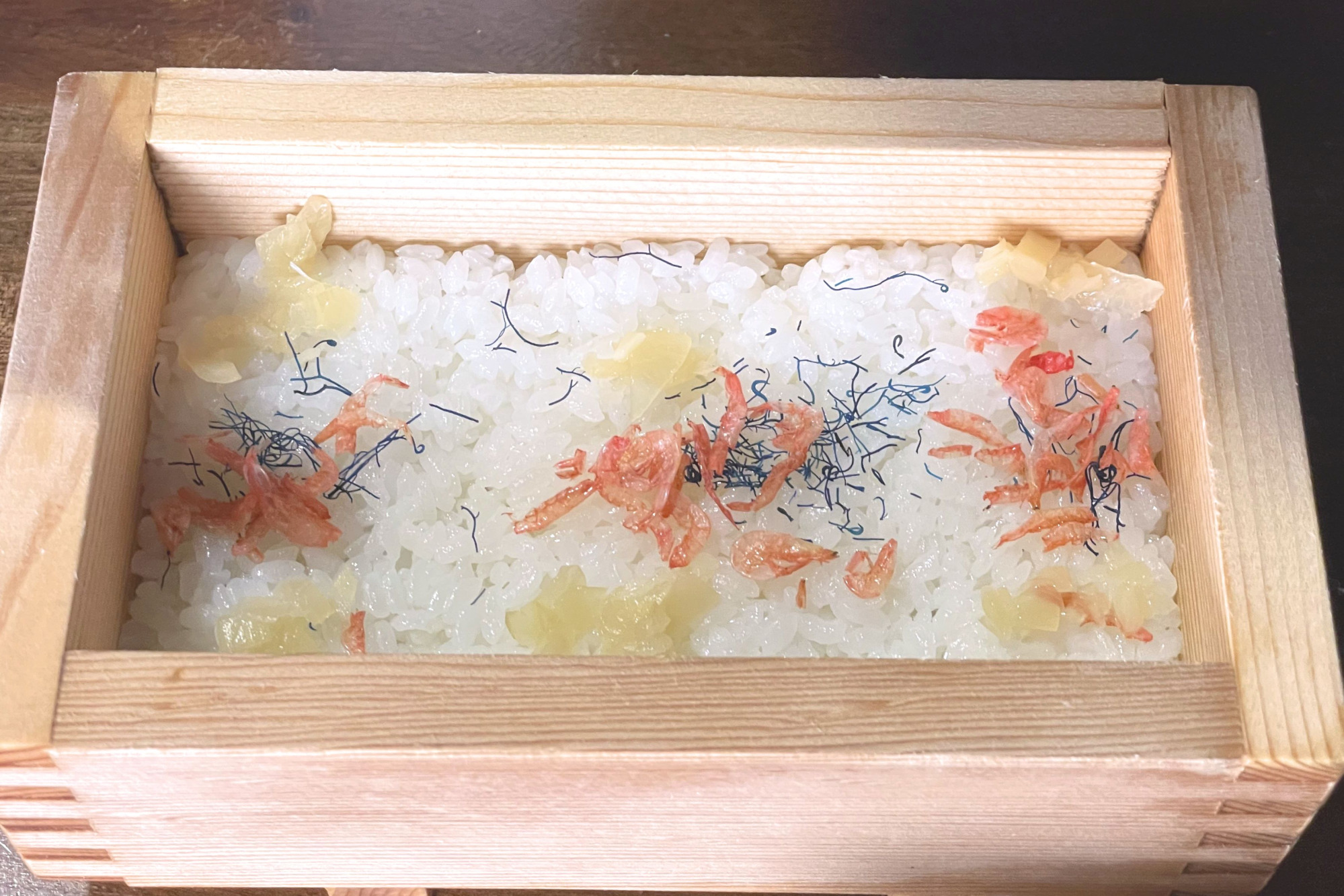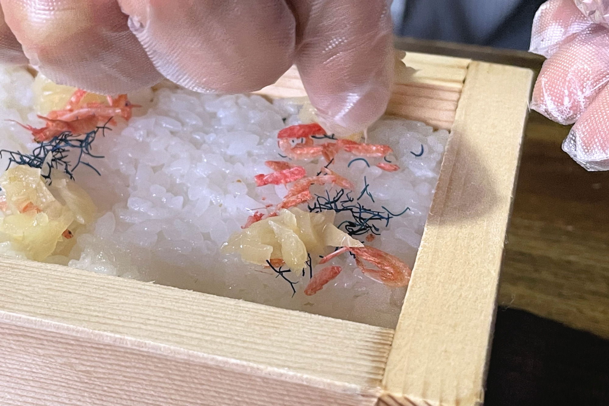ポイントその2は、具材のメインとなる海鮮はあえて酢飯の下にして見えないようにすること。お店のご主人の周田さんのお話では、その昔、加賀藩では人々が集まって起こす一向一揆に悩まされていたことから、大勢が集まるお祭りを禁止したとのこと。また、加賀藩が質素倹約を重んじていた中で、人々は何とかお祭りを楽しみたい!との思いから、地域の小さなお祭りの際、豪華な具材は見えないように押寿しを作るようになったんだそう。(諸説あり)