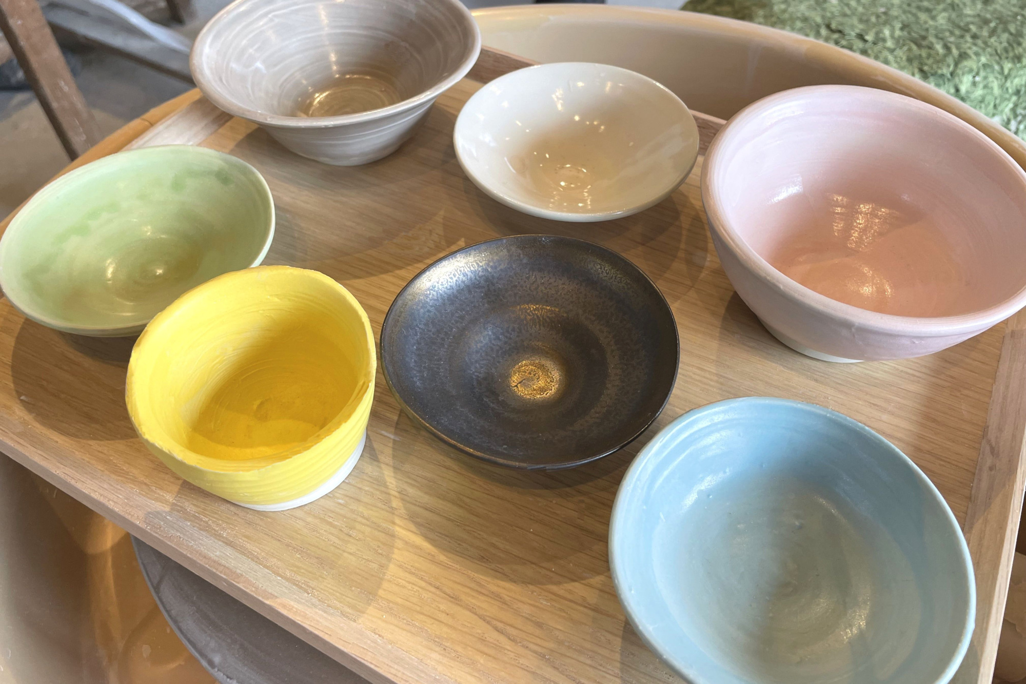 成形した作品には7色のカラフルな釉薬(ゆうやく)から好きなものを選んで色をつけることができます。キャストの3人がセレクトしたのは、ピンク・グリーン・ゴールド(黒色に見えるものがゴールド)。どの色も本当に素敵なので自分のお気に入りを選んでくださいね。