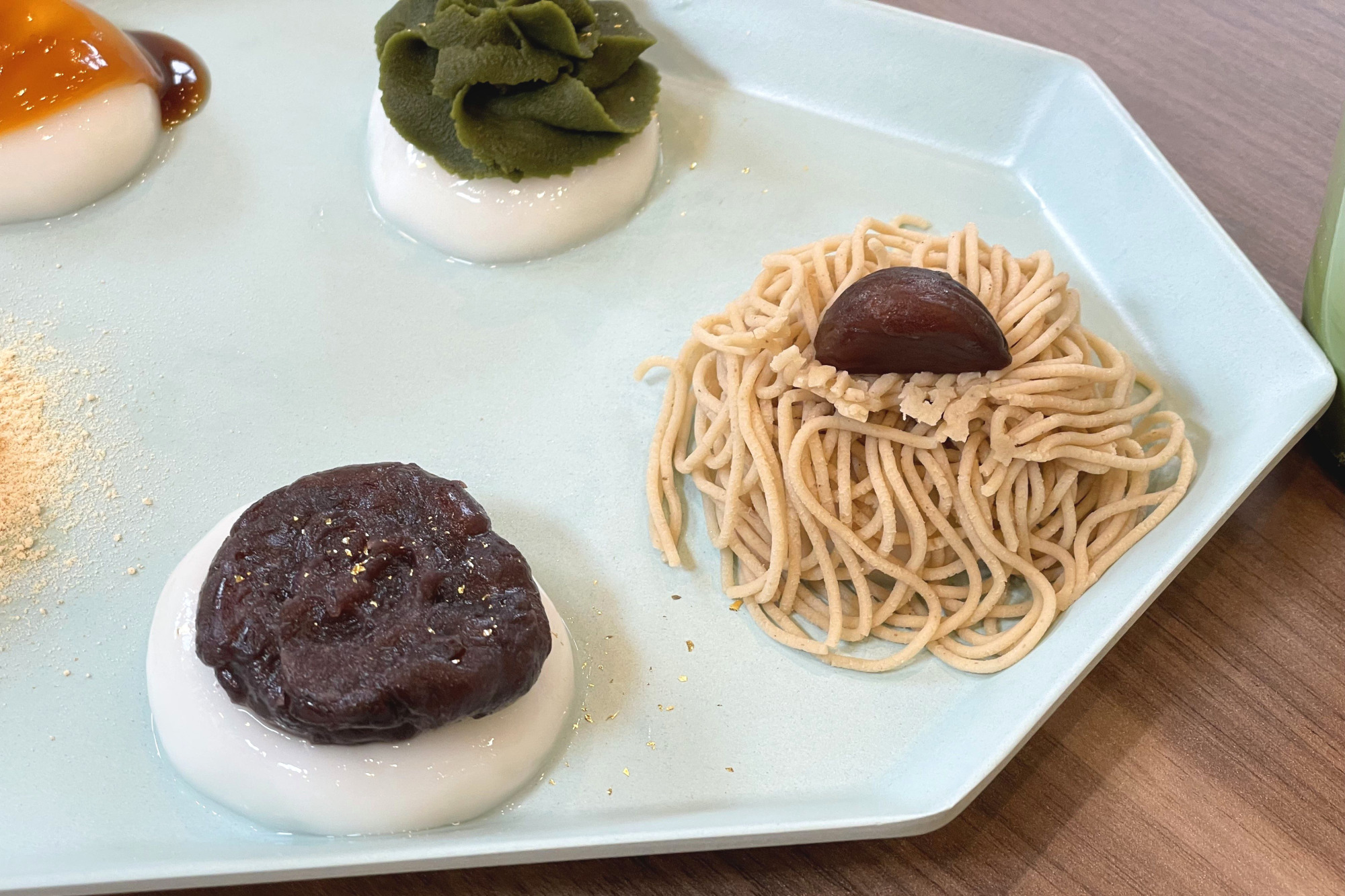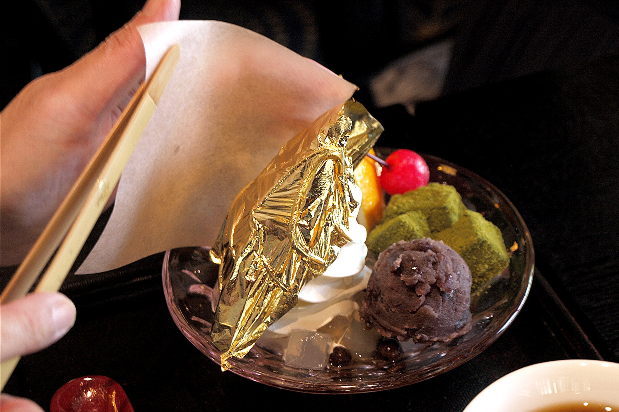 なかでも注目は本編でも登場した「金箔あんみつ 」。箔一謹製の食用金箔を、目の前で一枚まるごと貼りつけて仕上げてくれる贅沢な一品です。その光景はまるで、金箔の伝統技法「箔移し」を見ているかのよう。