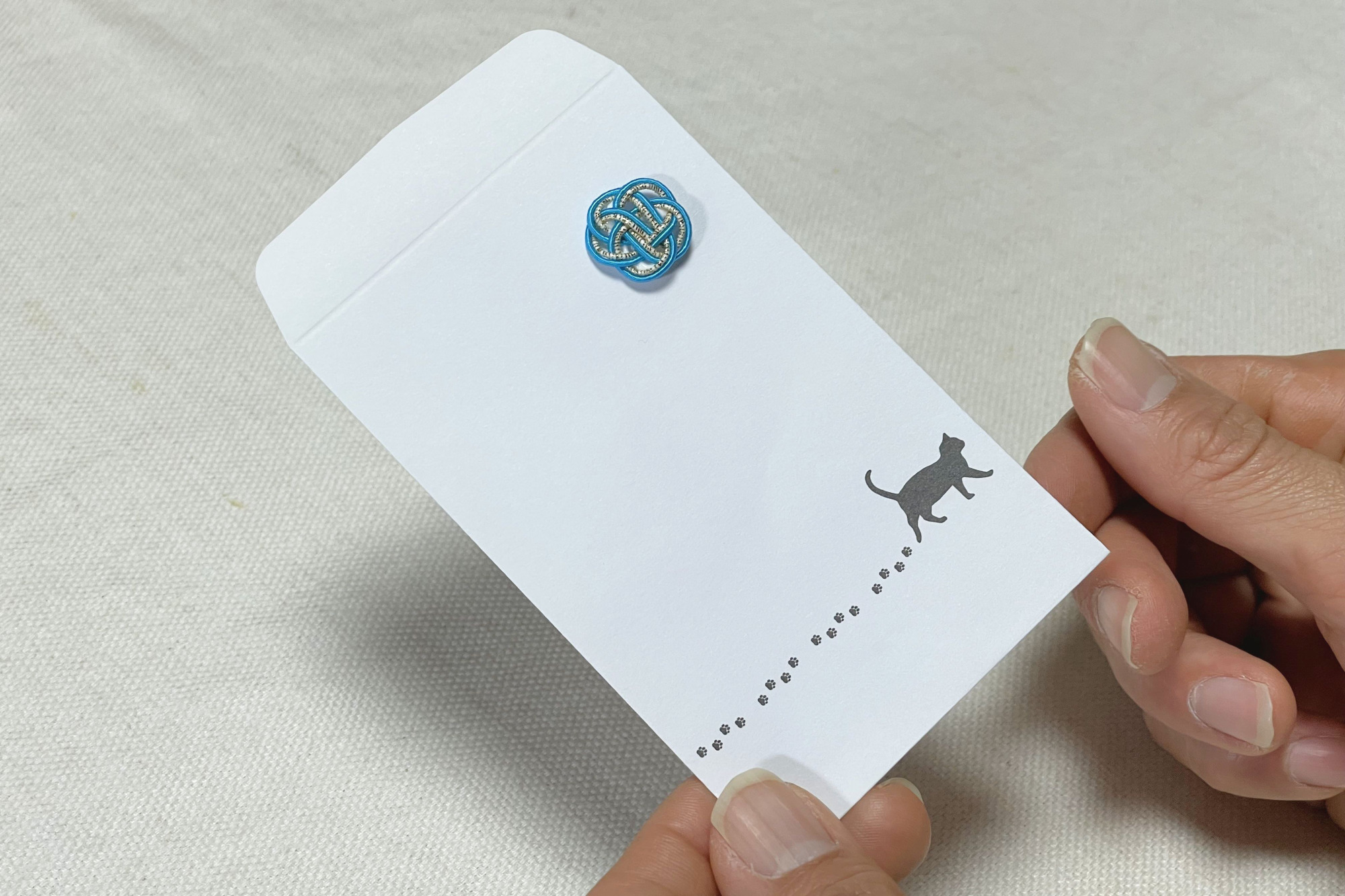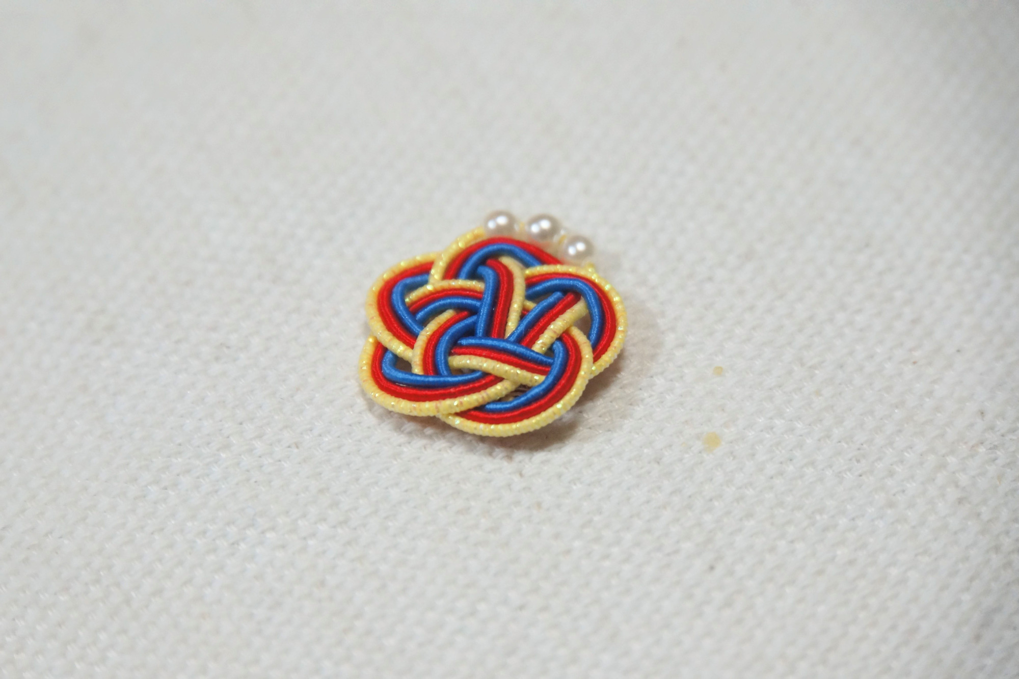 色が決まったら水引を3本使って結んでいきます。細かい作業が苦手でも先生が丁寧にフォローしてくれるので大丈夫!アクセントにパールの飾りも入れてキレイに仕上がりました!!(工程は写真の>マークを押して見てくださいね)