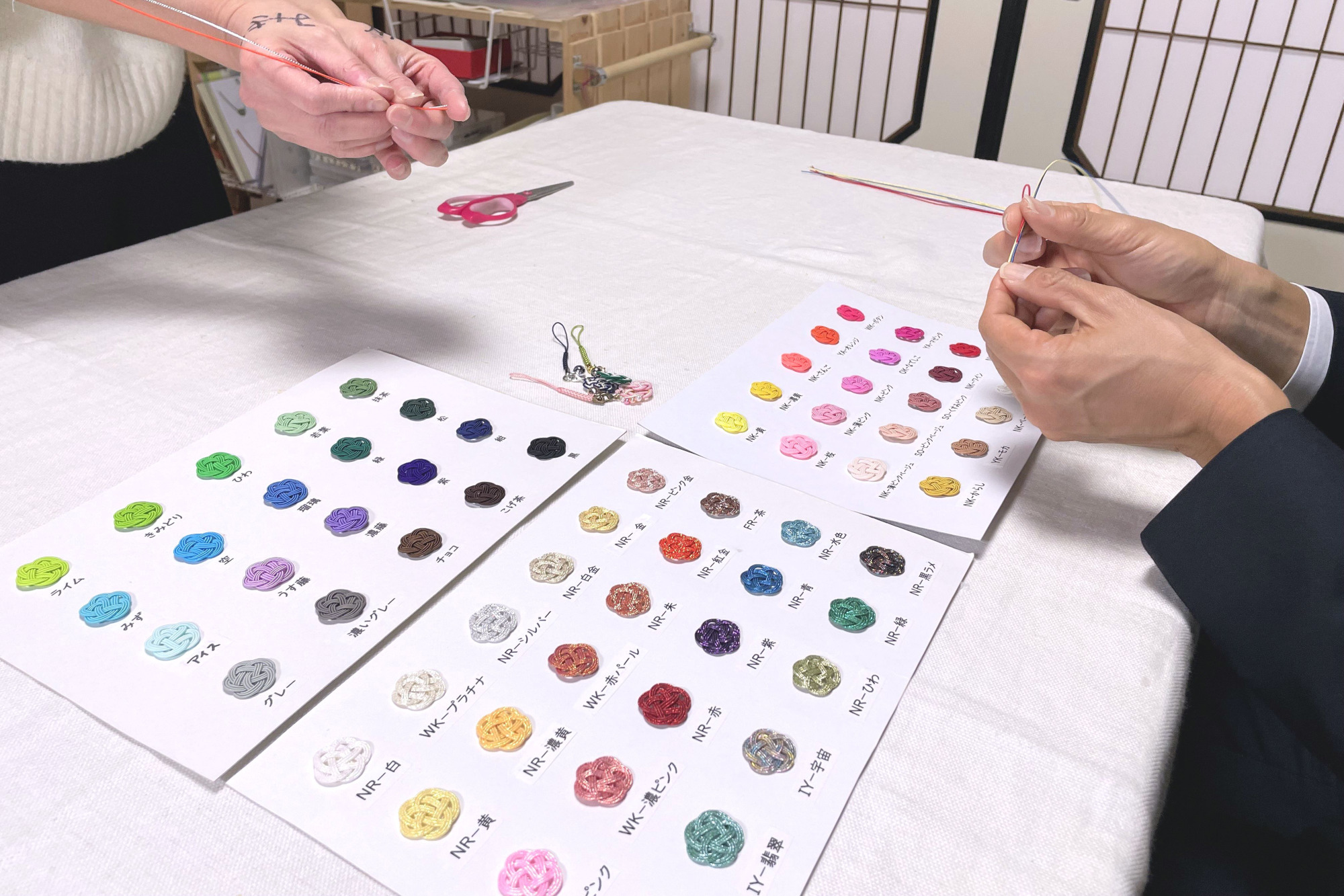 さぁ、いよいよ本番!ここで水引体験の醍醐味のひとつ、色選び♡64種類もの中から好きな色を選べるんです。推しのメンバーカラーをグラデーションで作る?それともユニットのメンバーカラーを組み合わせる??楽しいけど究極の選択!?