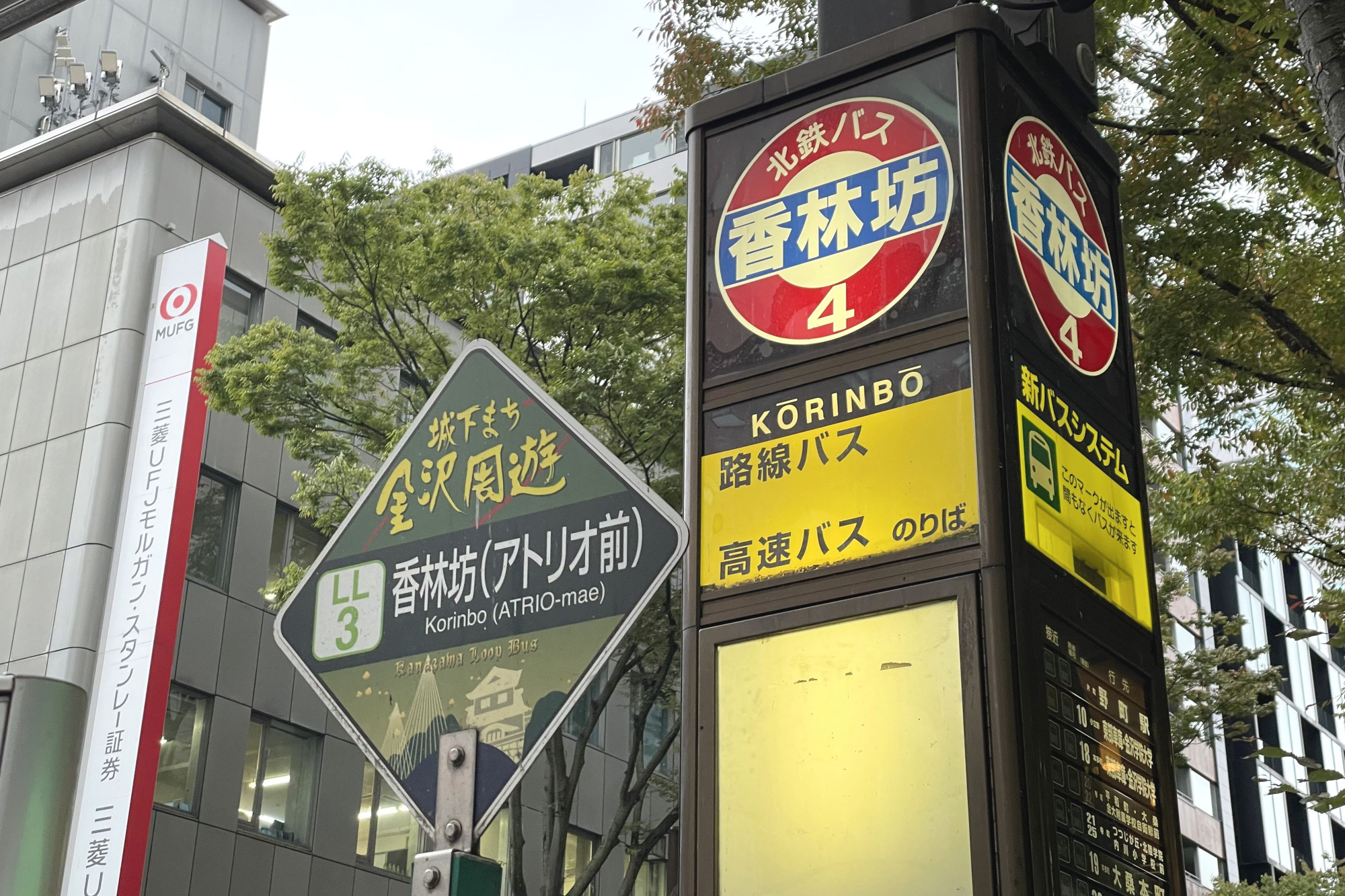 金沢駅からのおすすめの交通手段はバス。「香林坊」(こうりんぼう)で下車して徒歩10分ぐらいです。