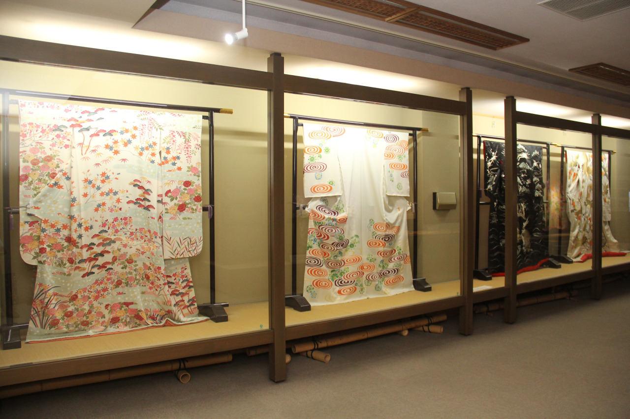 着物姿の4人が座った席は石川の伝統工芸「加賀水引細工」の額の前です。