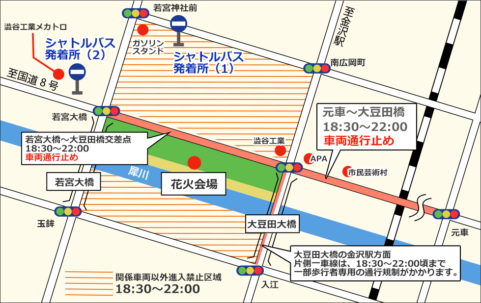 花火大会当日は、会場周辺に交通規制が実施されます。