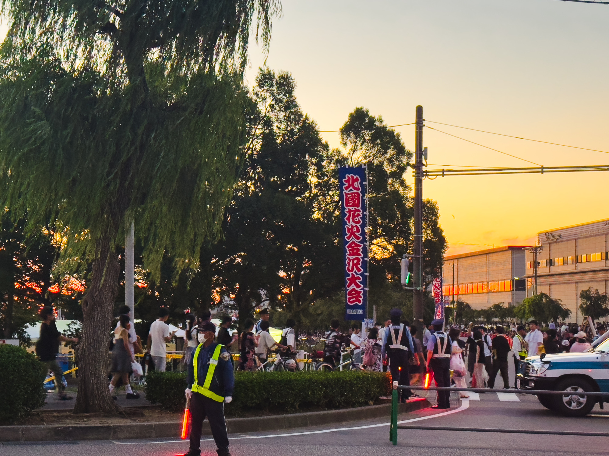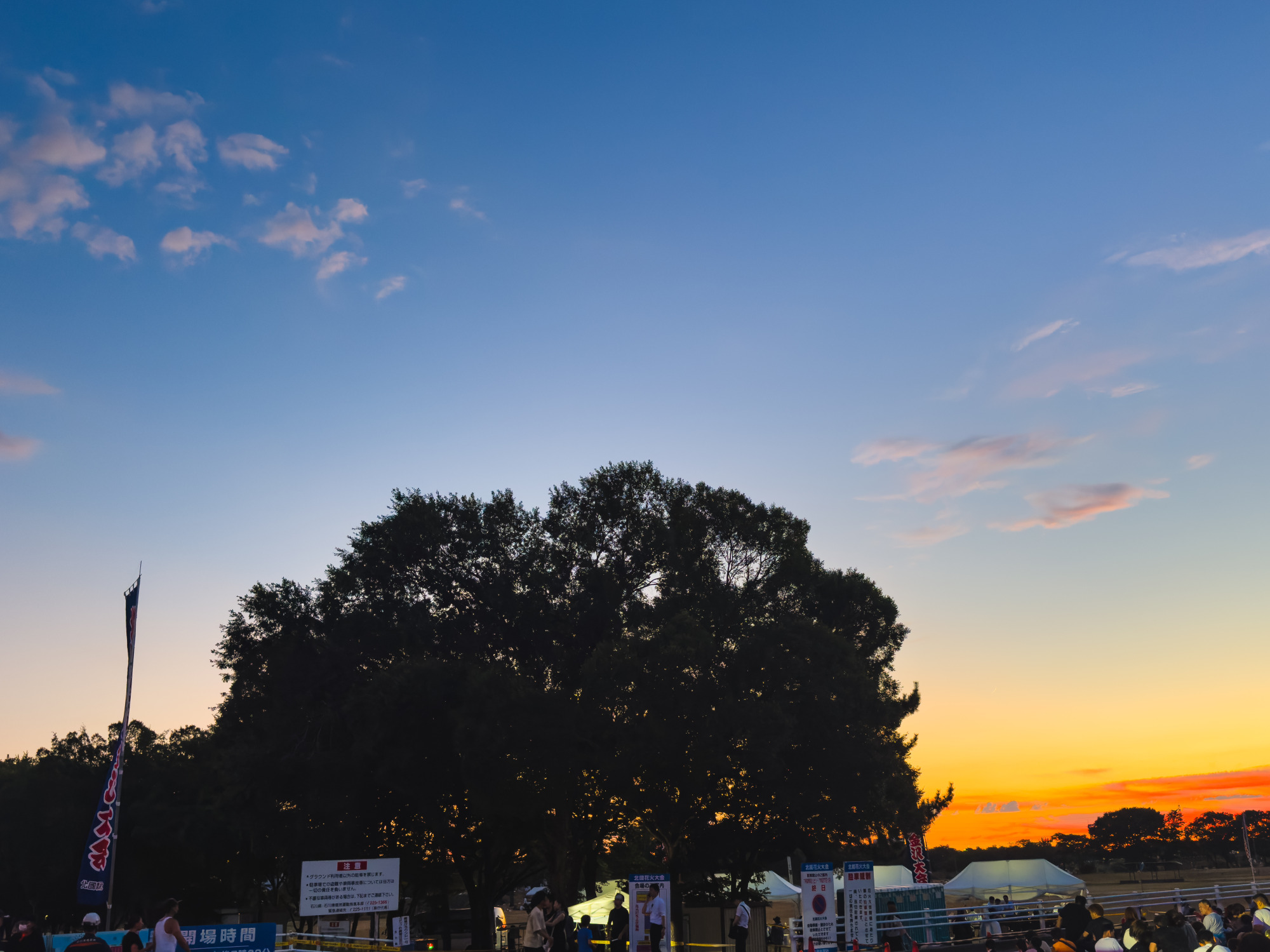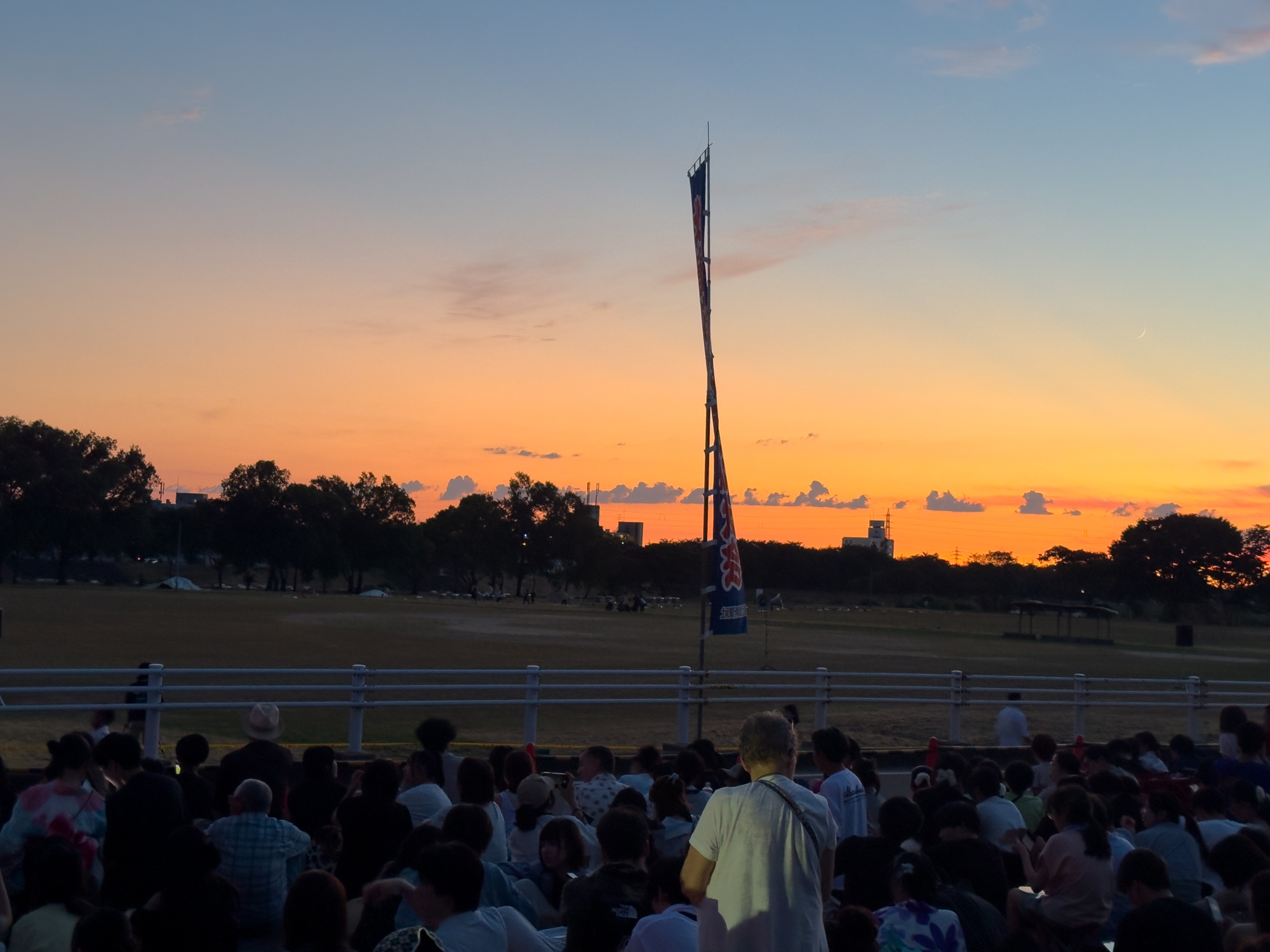 会場に到着したのは18時過ぎ。まだ空は明るさを残していましたが、すでに多くの観覧客が集まっていて、場所取りや記念撮影など思い思いの時間を過ごしていました。日が傾くにつれて空がだんだんとオレンジ色に染まり、少しずつ夜の訪れを感じながら、「そろそろ始まるかな…」という期待感がじわじわと高まっていきます。会場のあちこちでは、友人同士で盛り上がったり、カップルで肩を寄せ合ったり、子どもたちが走り回ったりと、それぞれの夏のひとときが流れていて、まるで大きなピクニックのような雰囲気でした。