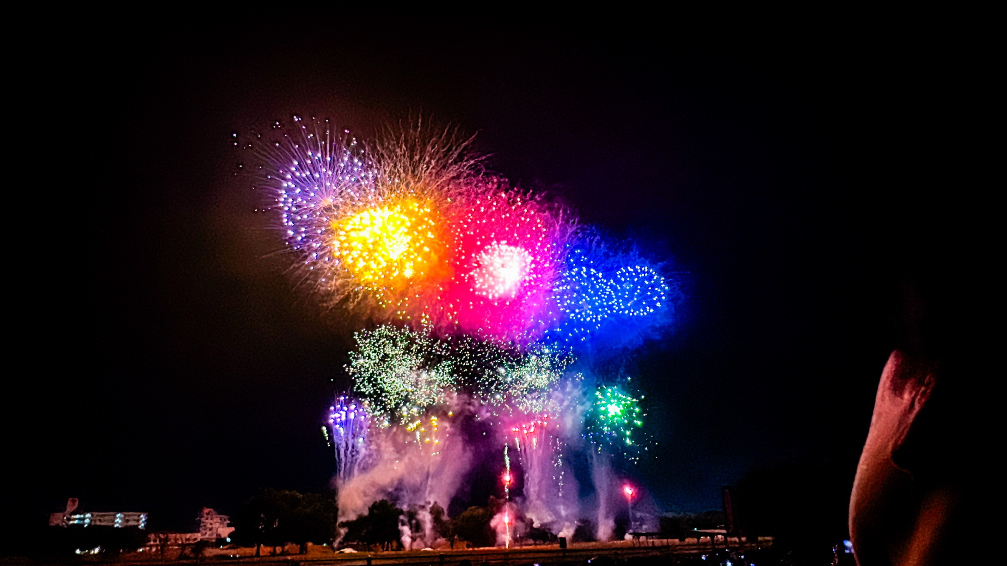 午後7時50分、ついに打ち上げのカウントダウンが始まり、大きな一発が夜空にドーン!静まり返っていた川辺に歓声があがり、一気に会場が一体となりました。そこからは、まるで万華鏡のように色とりどりの花火が次々と打ち上がり、空を鮮やかに彩ります。紫やオレンジ、青や緑が混ざり合い、まるで絵画のようなシーンにただただ見惚れるばかり。赤一色で咲き誇る大輪の花火は、まるで心臓の鼓動のように力強く、見る人の心にズシンと響きます。