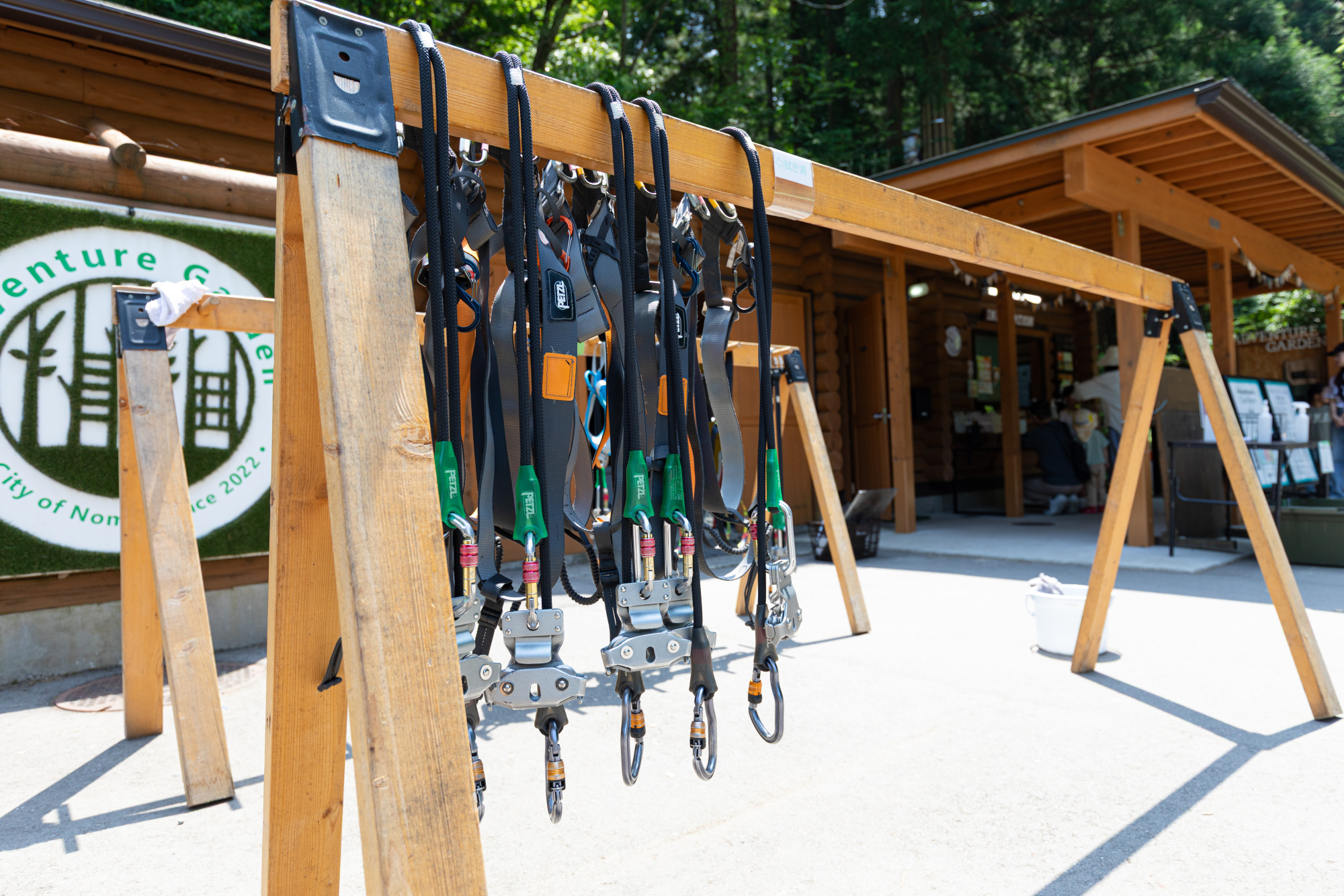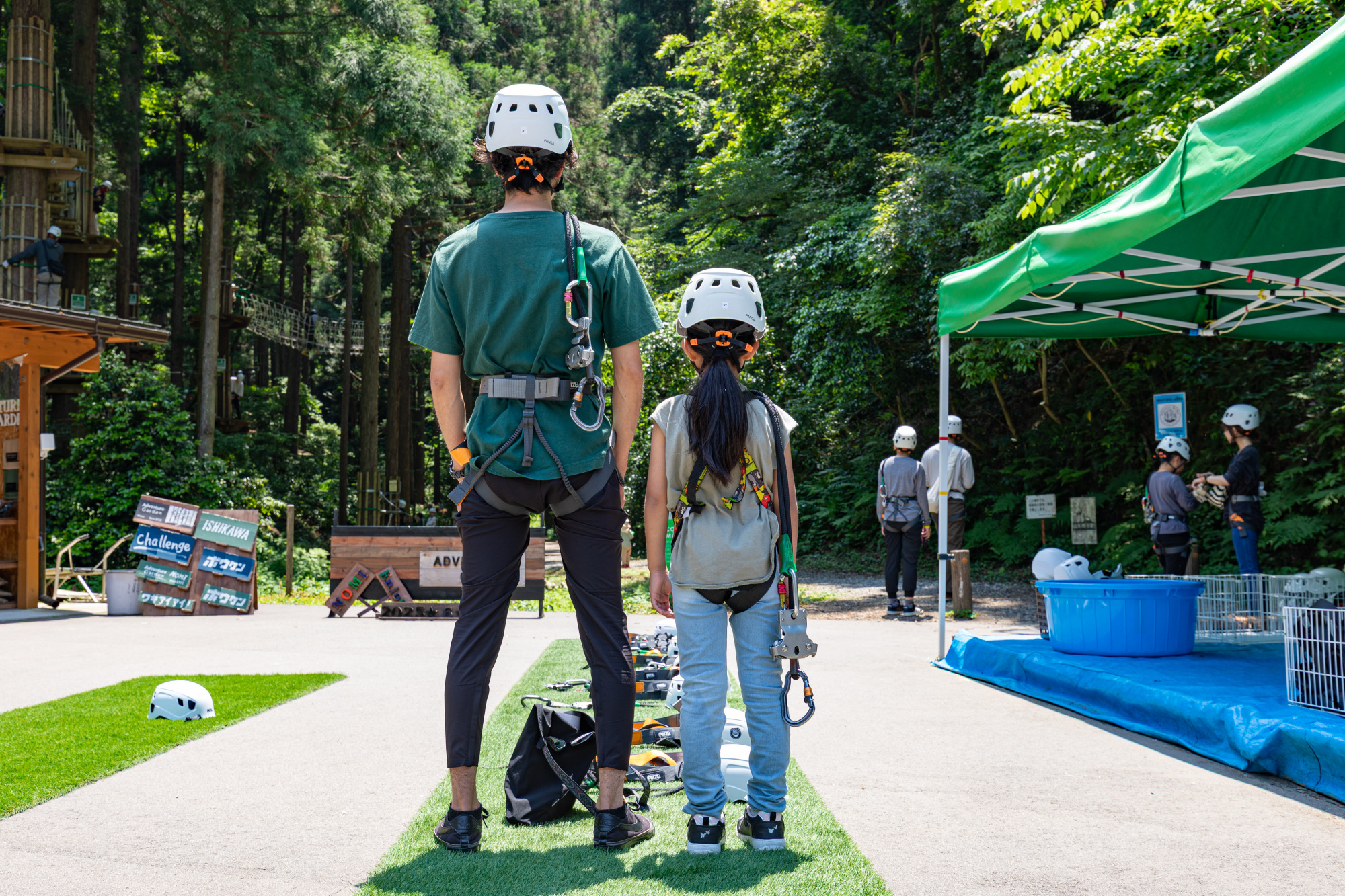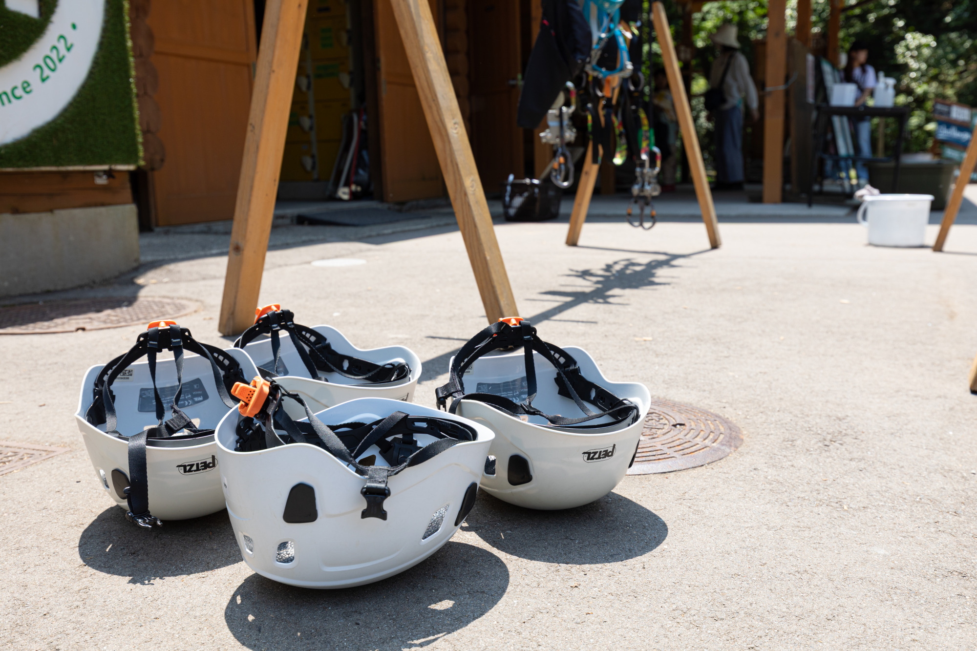 まずは、スタッフの方が安全ハーネスの装着をサポートしてくれます。しっかりと体に固定するため、ややキツめに感じますが、これも安全のため。着用後はヘルメットも装着し、使用する器具についての説明があります。