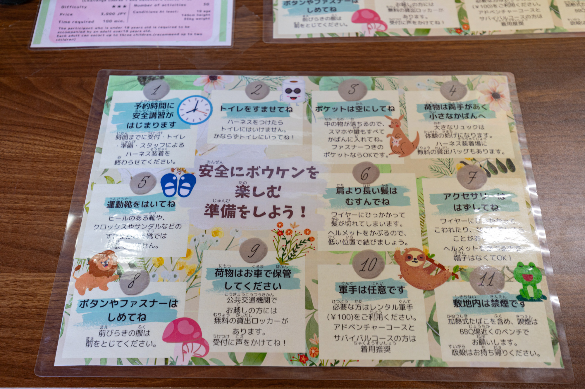 利用条件:5歳以上かつ身長110cm以上、ウエスト115cm以下、太もも周り75cm以下、体重120kg以下、10歳以上の方は18歳以上の保護者(高校生不可)による地上からの見守りが必要です、9歳以下の方は18歳以上の保護者(高校生不可)と一緒でないと体験できません(保護者も有料)、保護者1名につき9歳以下の方3名まで引率できます。