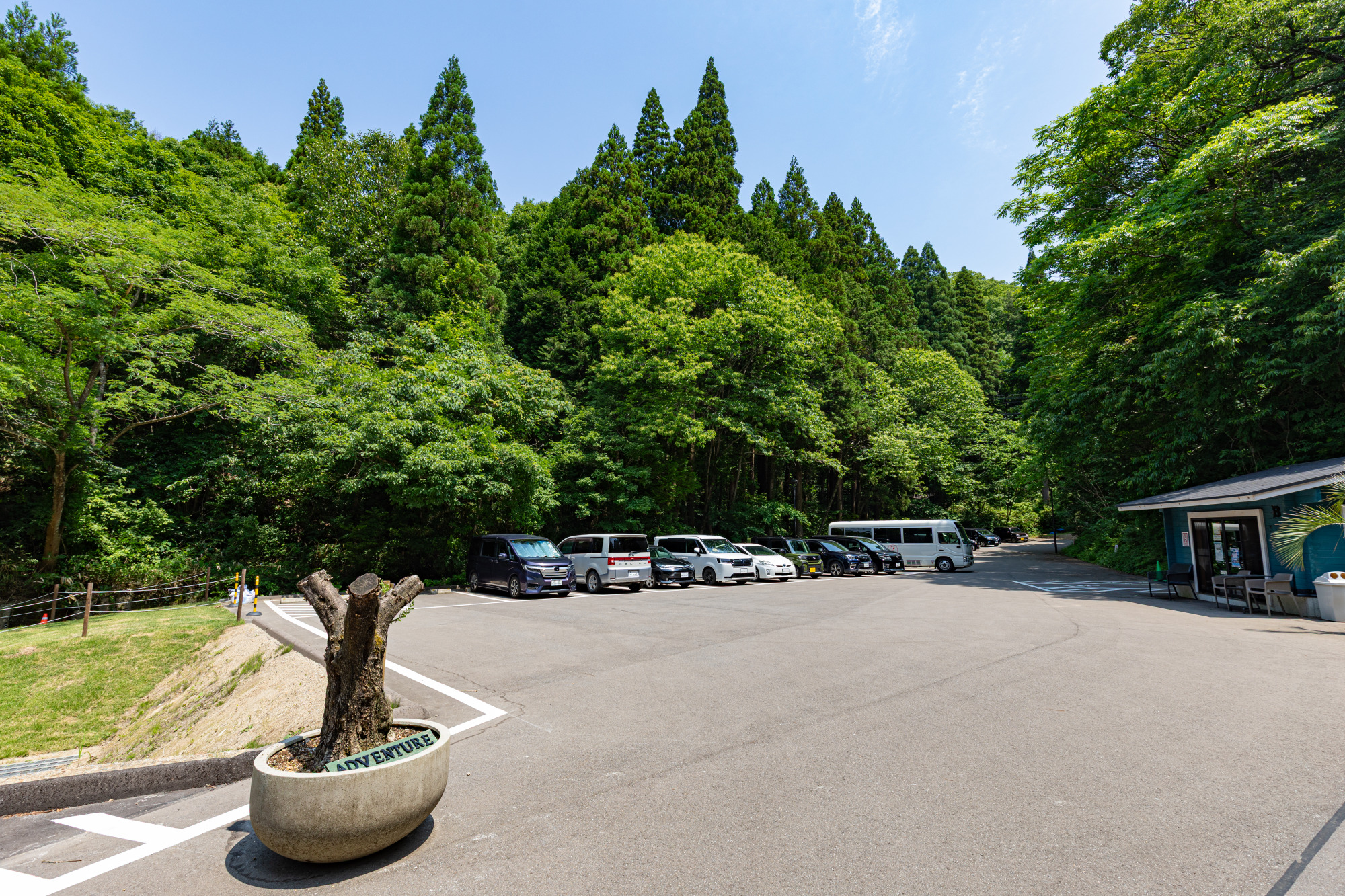 施設には、手前のBBQエリア側と奥のアスレチックエリア側にそれぞれ駐車場があり、あわせて約45台分の駐車スペースが確保されています。