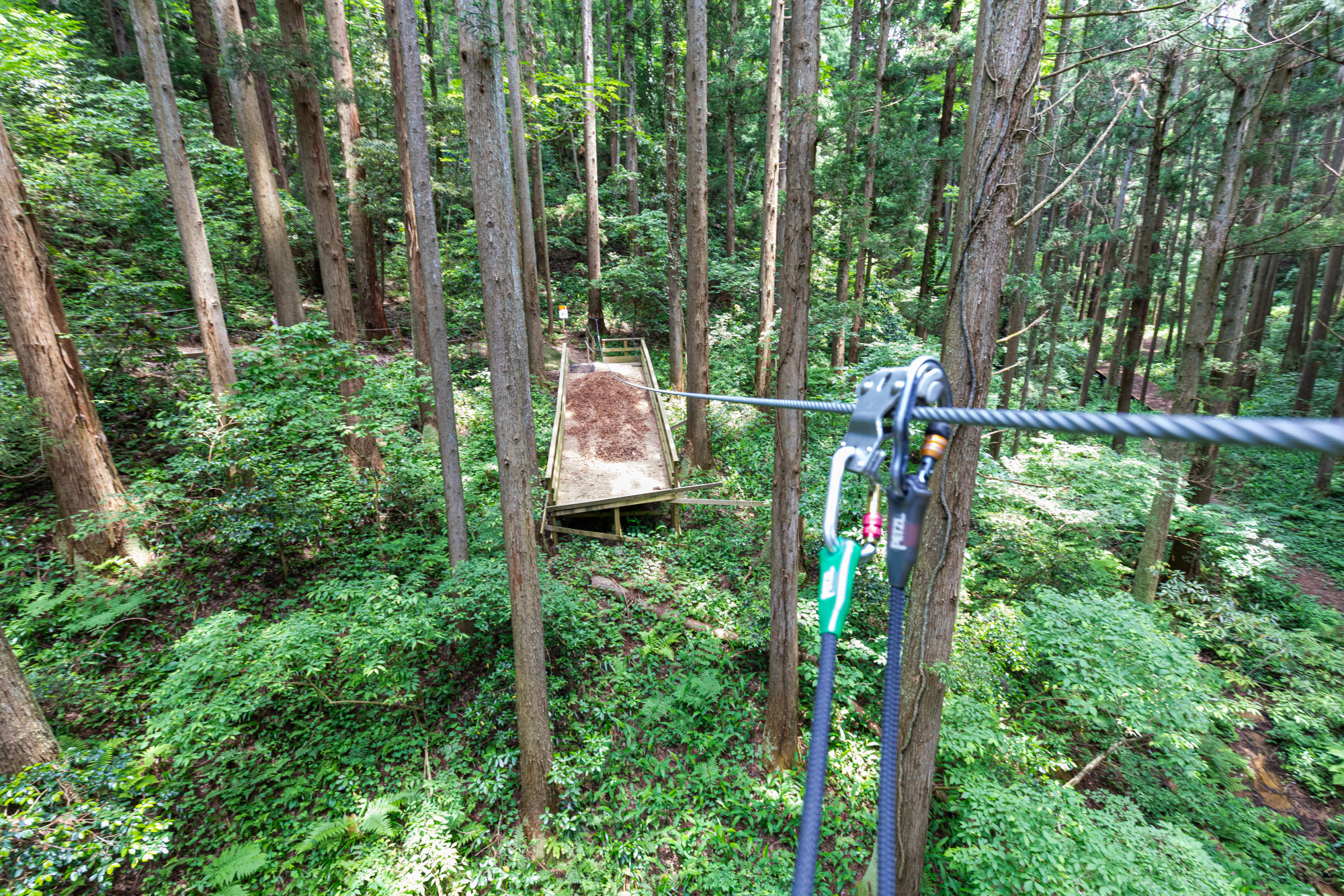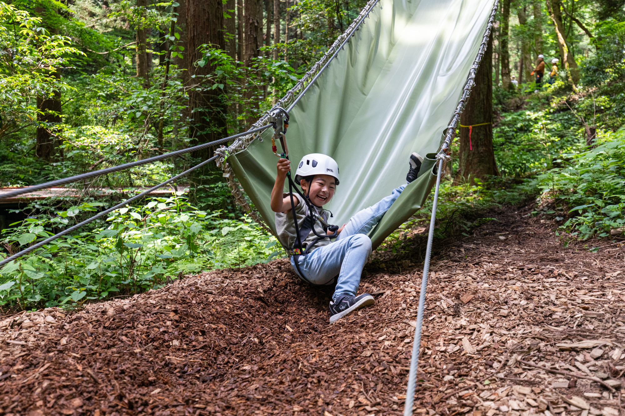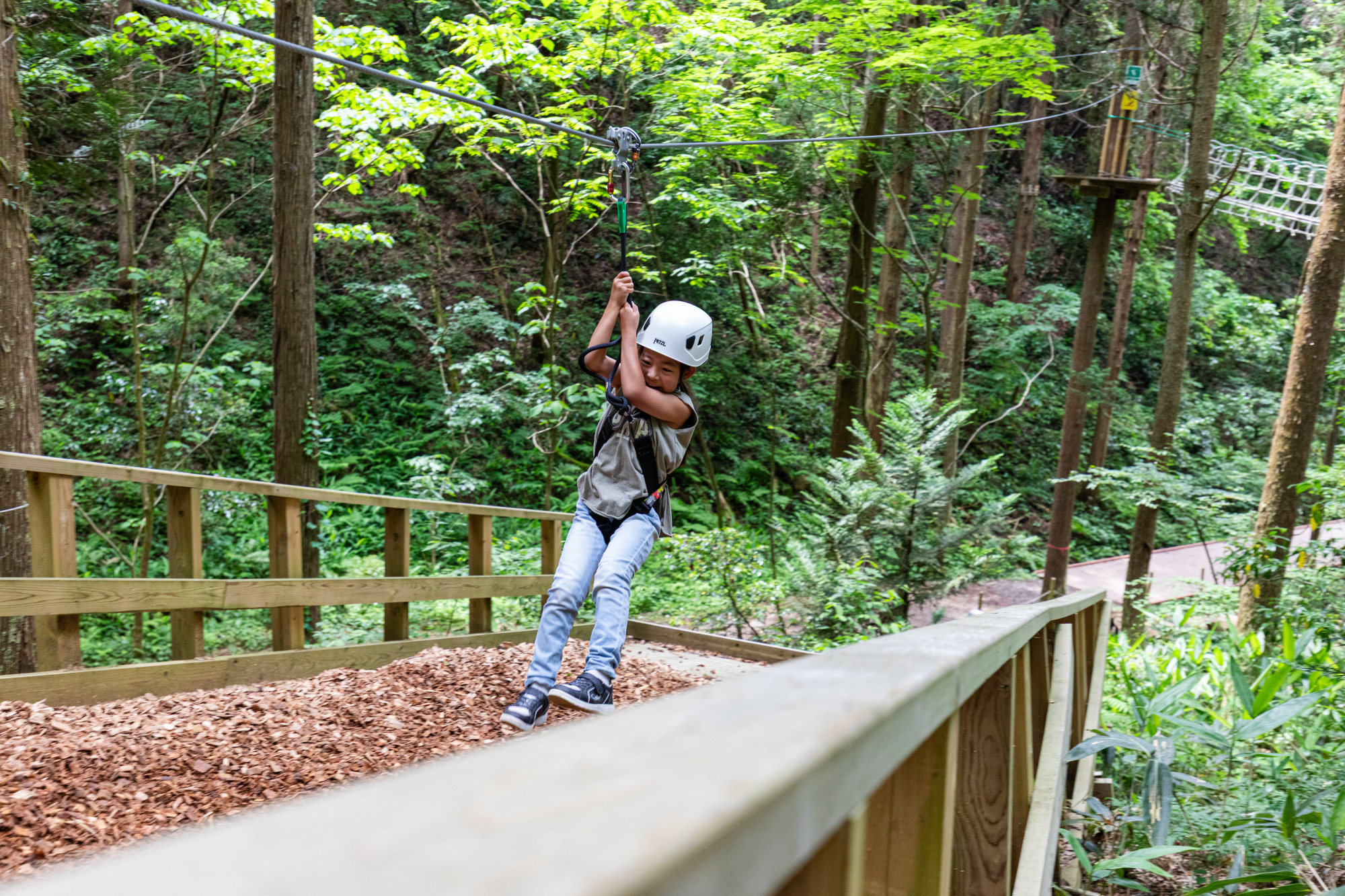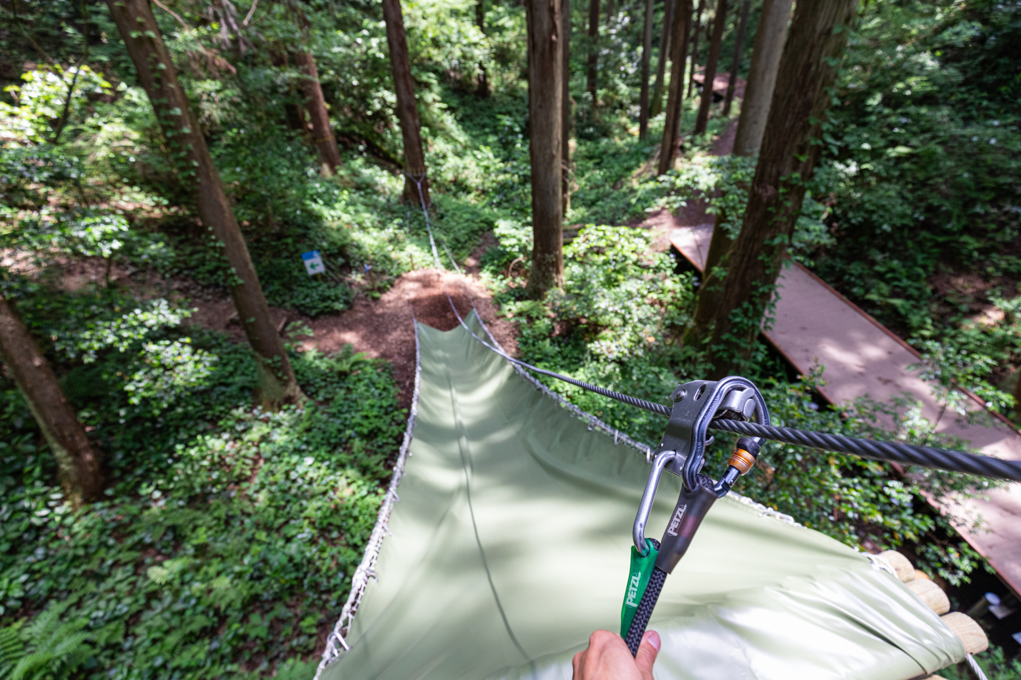 チャレンジコースの締めくくりは、全長約30メートルのジップライン!スタート地点から見下ろす景色は、まさに圧巻。写真ではなかなか伝わらない、そのスケール感に思わず息を呑みます。とはいえ、滑り始めてしまえば爽快感はMAX!