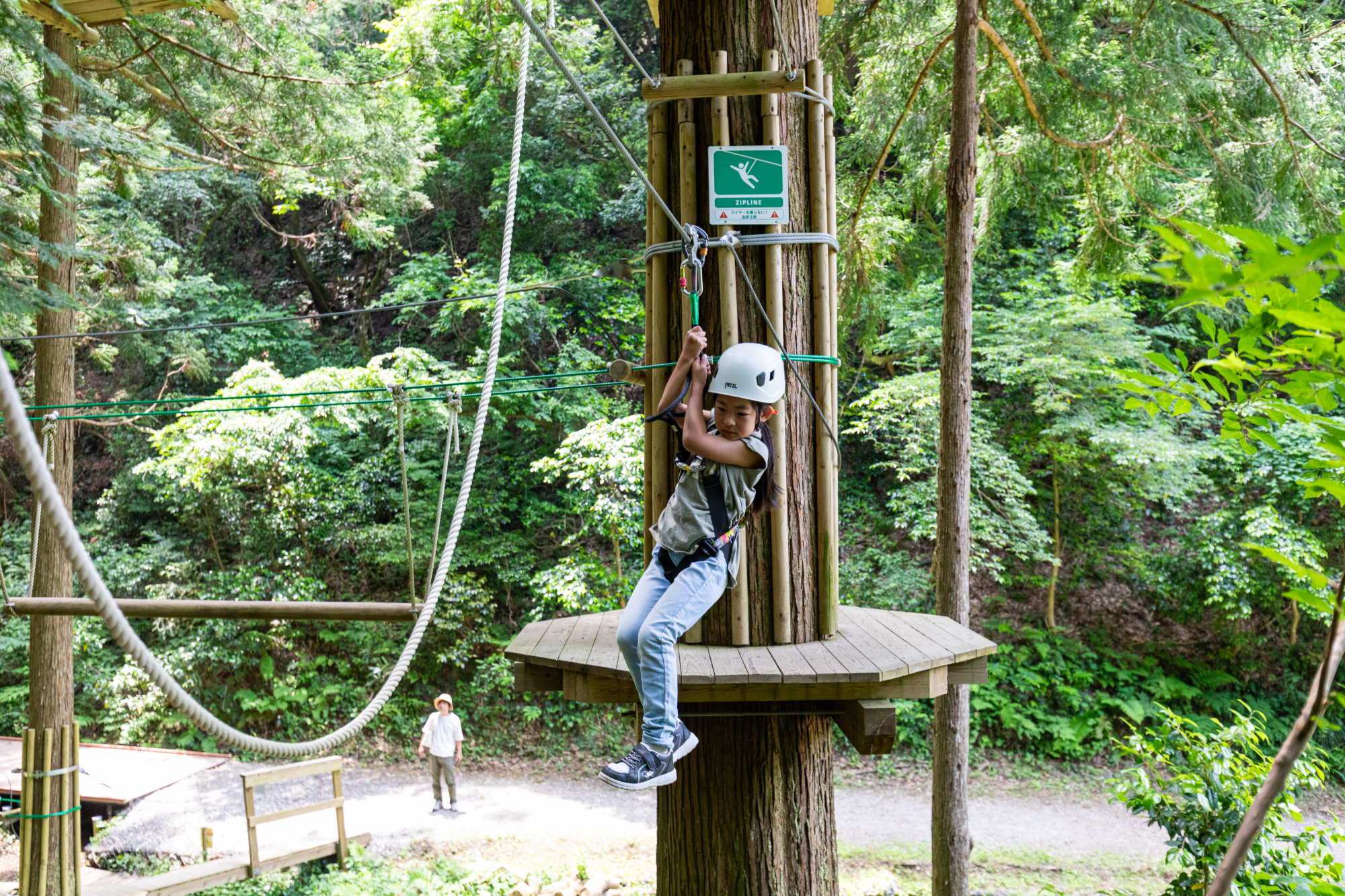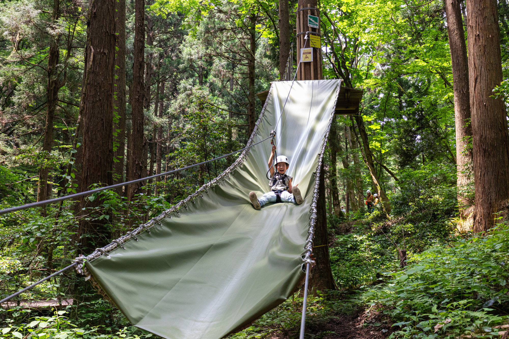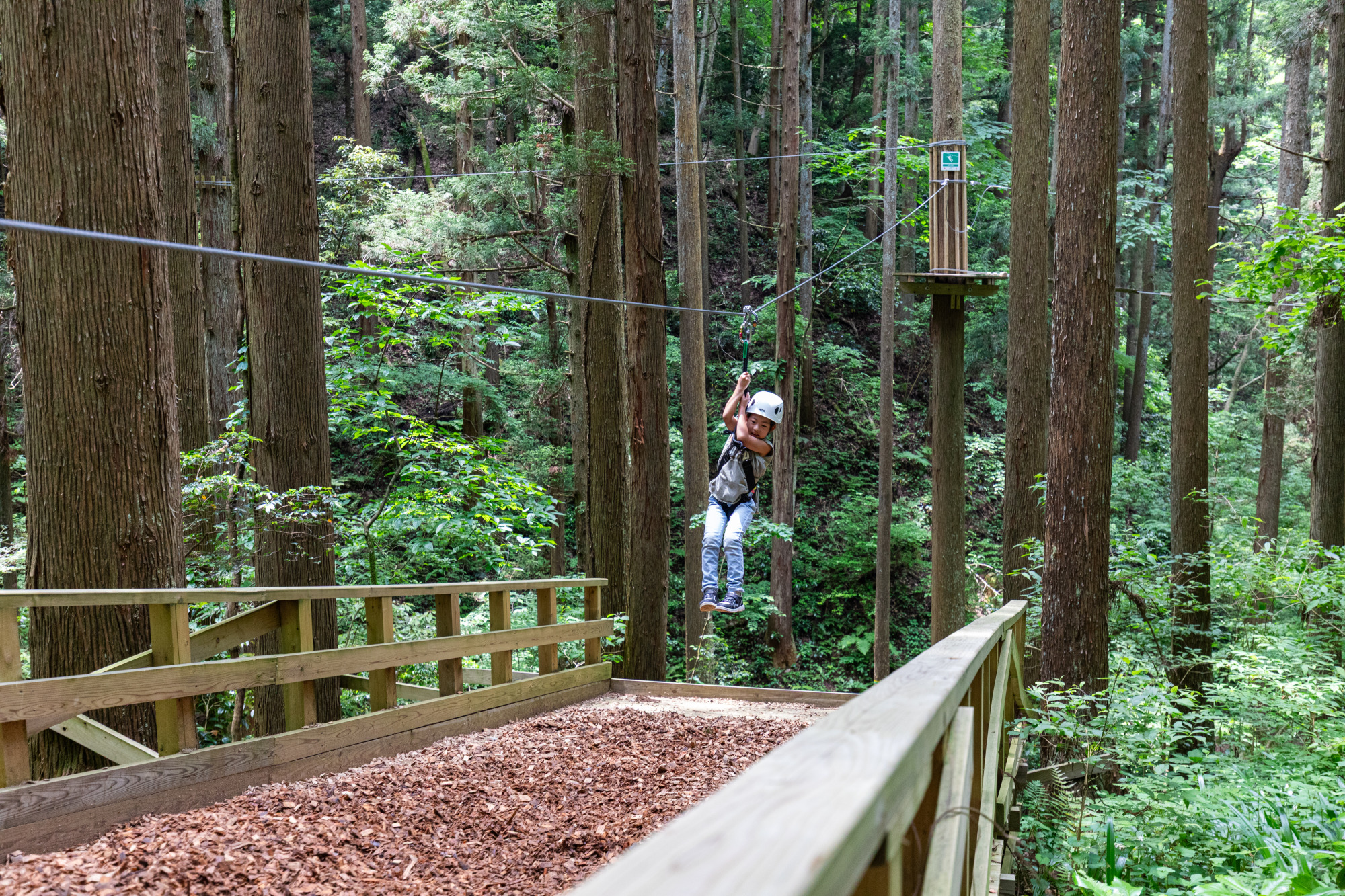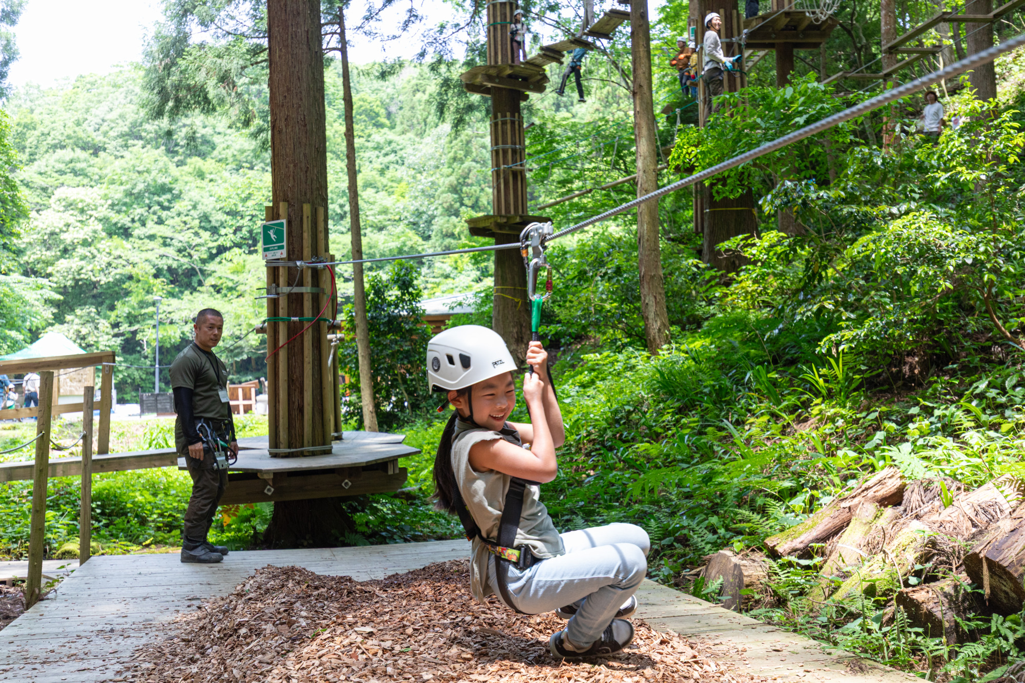 チャレンジコースの締めくくりは、全長約30メートルのジップライン!スタート地点から見下ろす景色は、まさに圧巻。写真ではなかなか伝わらない、そのスケール感に思わず息を呑みます。とはいえ、滑り始めてしまえば爽快感はMAX!