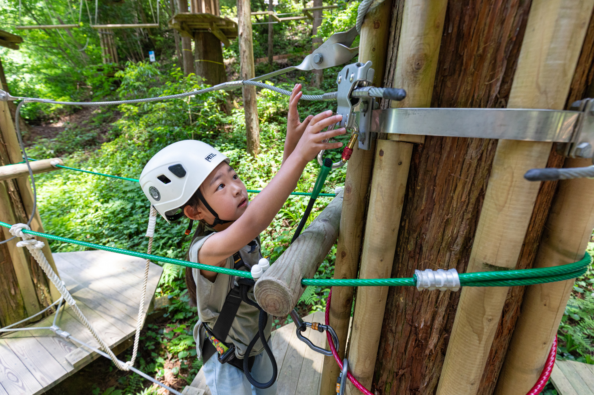 ふと気づけば、自分の位置はすでに木の中腹あたり。落ち着いて周囲を見渡すと、普段なかなか目にすることのない森の深い緑と木漏れ日の美しさに、思わず見とれてしまいました。そんな束の間の癒やしの時間を経て、再び冒険がスタート。