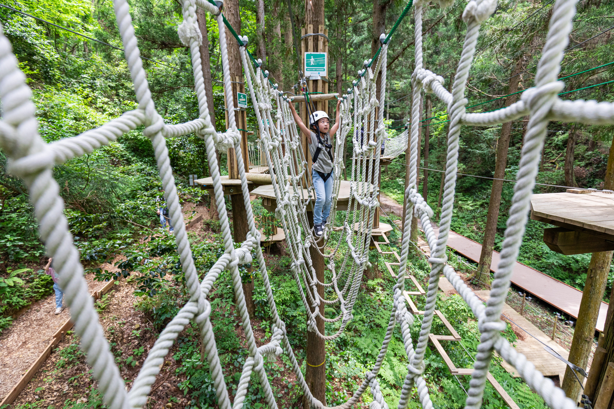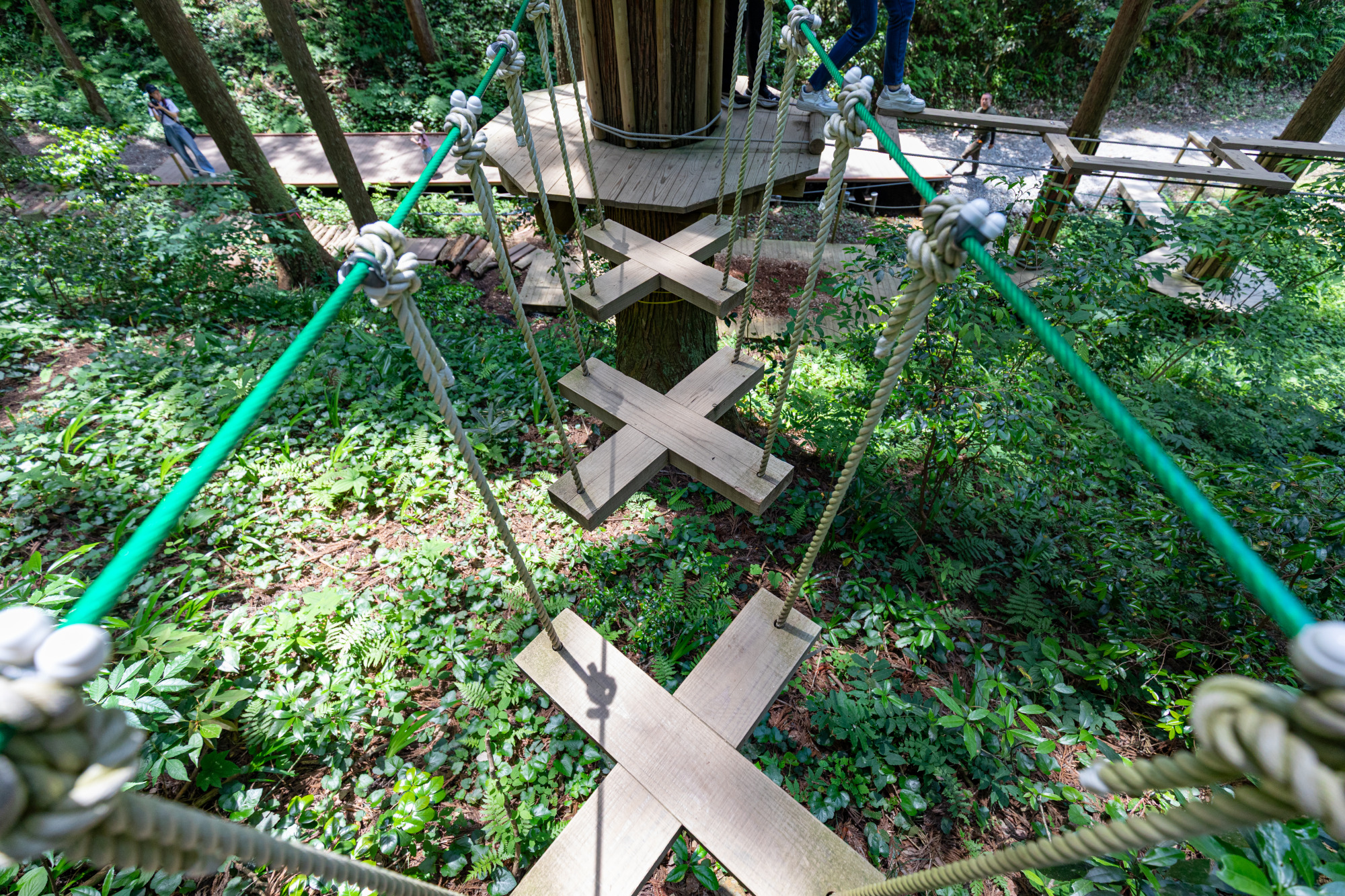 ・網橋(垂れ下がる縄の橋)子どもは「簡単だったよ〜」と話していましたが、筆者はここで苦戦。自重でネットに沈み込み、なかなか前へ進めず苦労しました。こうしたポイントで親子の得意・不得意が見えるのも楽しい体験のひとつです。