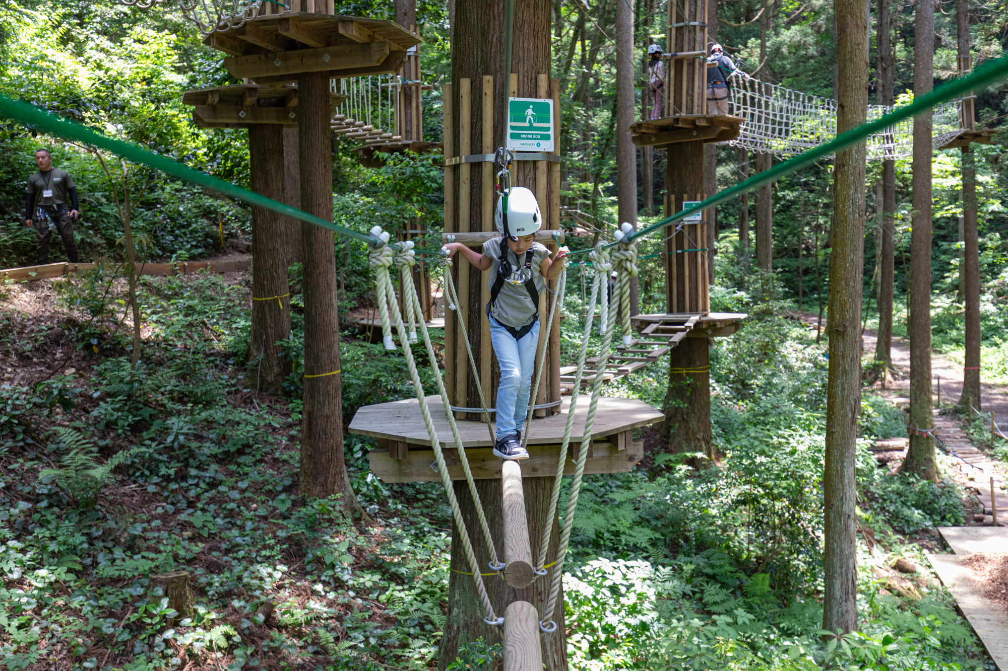一方で、子どもの方はというと、驚くほどスラスラと前へ進んでいきます。その姿に、思わず「いつの間にこんなに成長したんだろう」と感慨深い気持ちに。こうした自然体験は、小さいうちからの挑戦として、とても良い機会になりますね。吊り橋や一本橋、そして短めのジップラインなどを経て、最初のコースは終了します。まだ始まったばかりですが、すでに「楽しい!」という気持ちが湧いてくるのが不思議です。