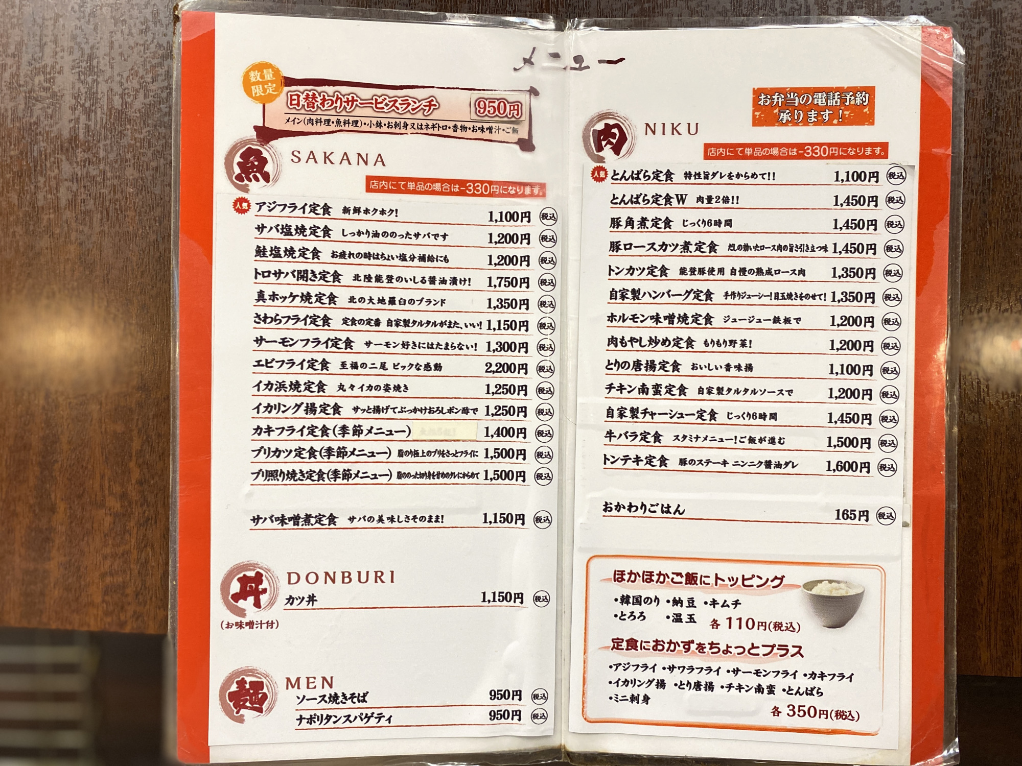 新鮮な魚を使った定食に加え、ガッツリ系のお肉料理や老舗ラーメンなど多彩な名店が並び、地元民にも愛されています。