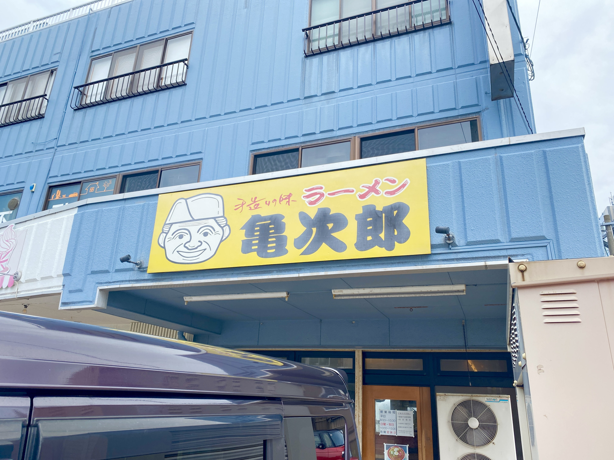 黄色い看板が目を引く老舗ラーメン店・亀次郎。