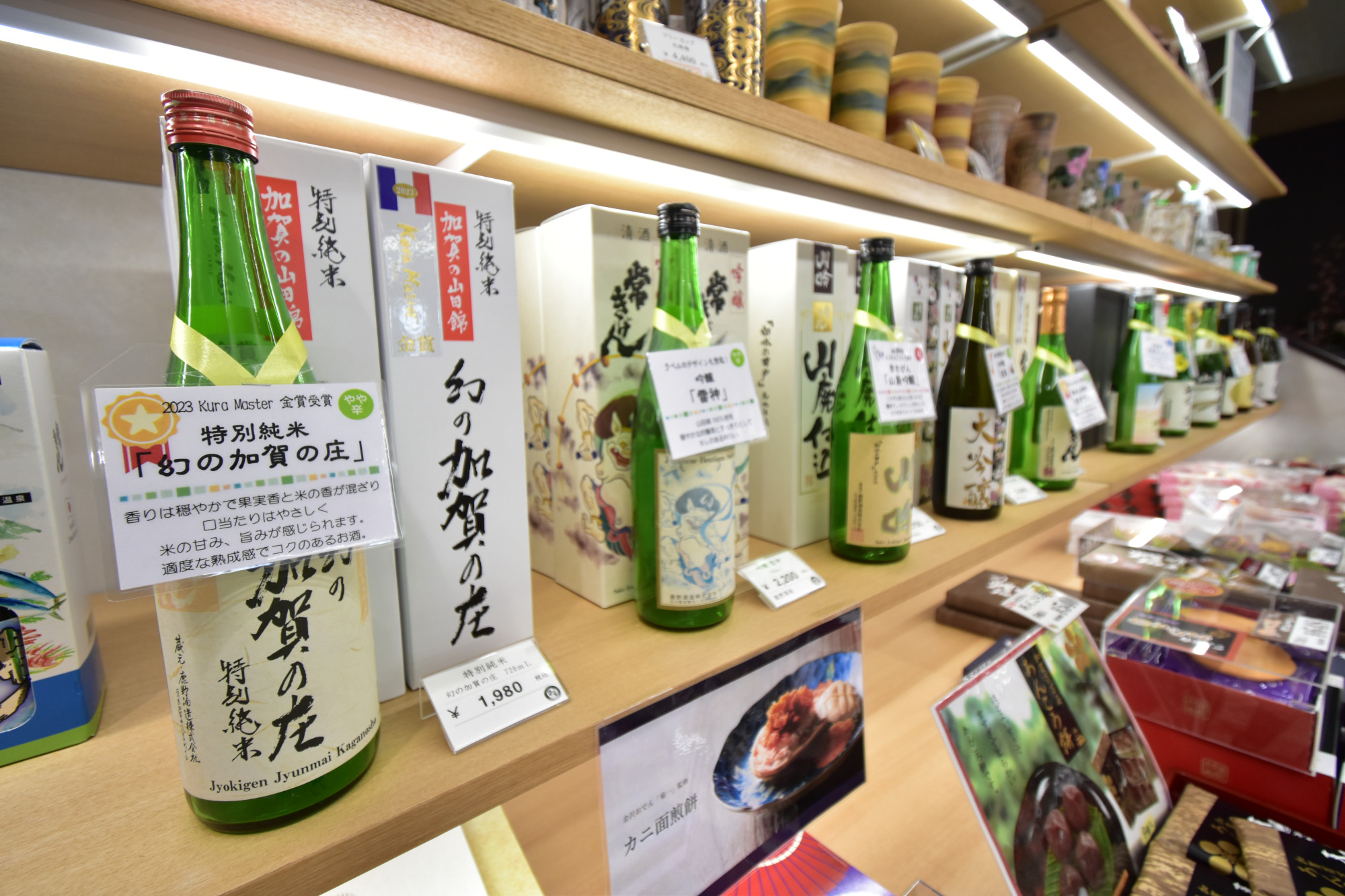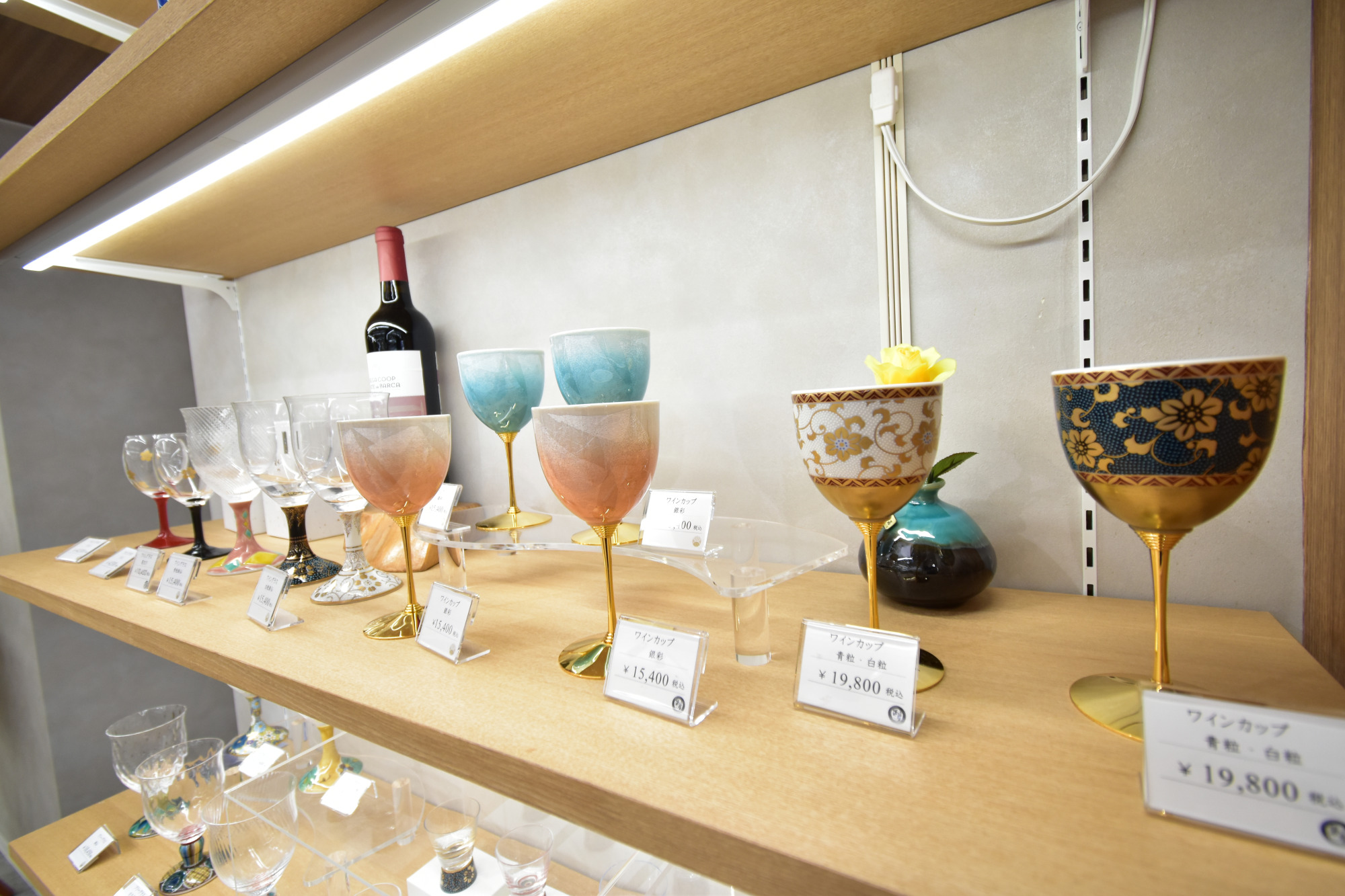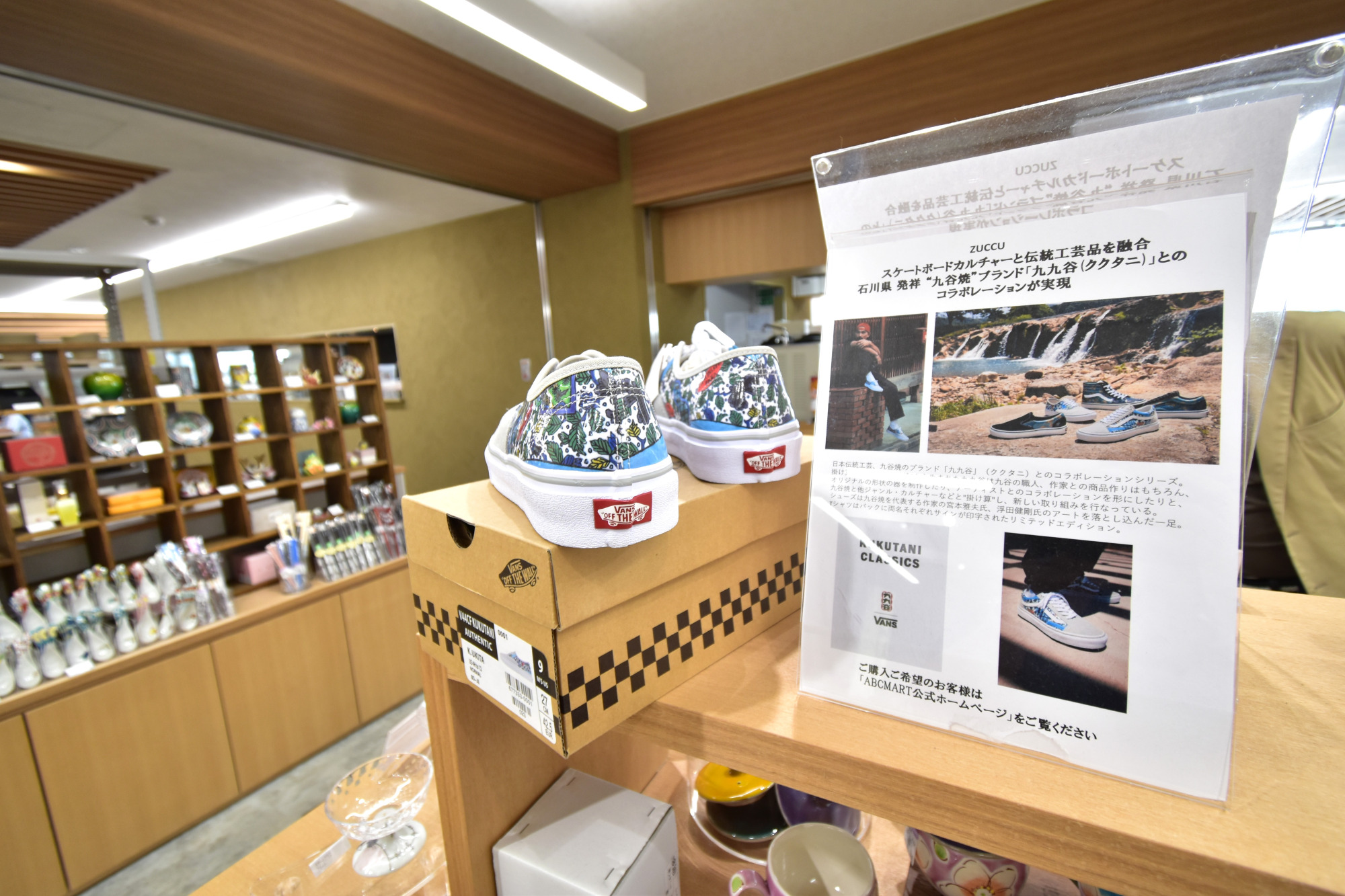 九谷焼のワインカップや、九谷焼のブランド「九九谷」とコラボレーションしたシューズなど、現代のライフスタイルに合う品々を取り揃えています。石川県の地酒も販売しており、九谷焼の器とともに楽しめます!