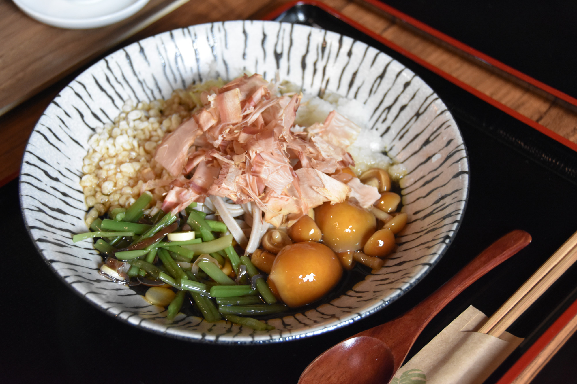 木滑なめこ、大根おろし、鰹節、山菜、ネギ、天かすが入った贅沢なぶっかけ蕎麦!