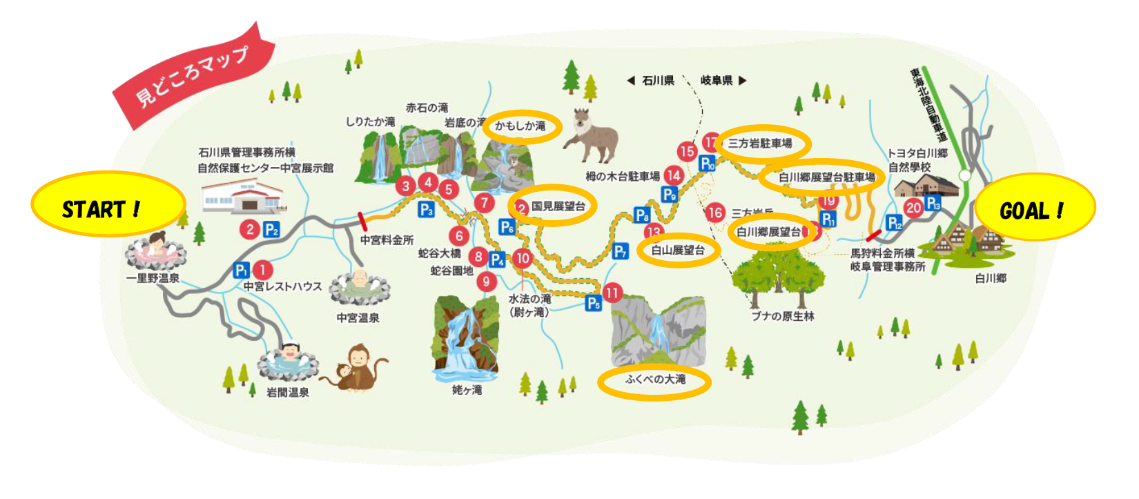 今回は【かもしか滝 → ふくべの大滝 → 国見展望台 → 白山展望台 → 三方岩駐車場→白川郷展望台 → 蓮如茶屋・情報センター】という、見どころギュッと詰め込んだ満足コースでめぐってきました♪