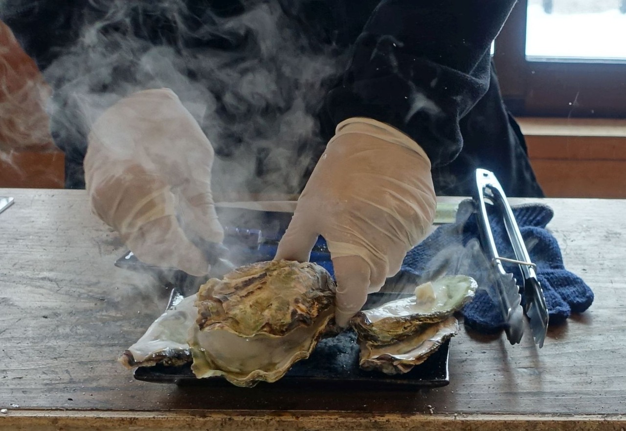 自分で焼くのが穴水流。炭火コンロを囲んで焼きたて牡蠣に舌鼓